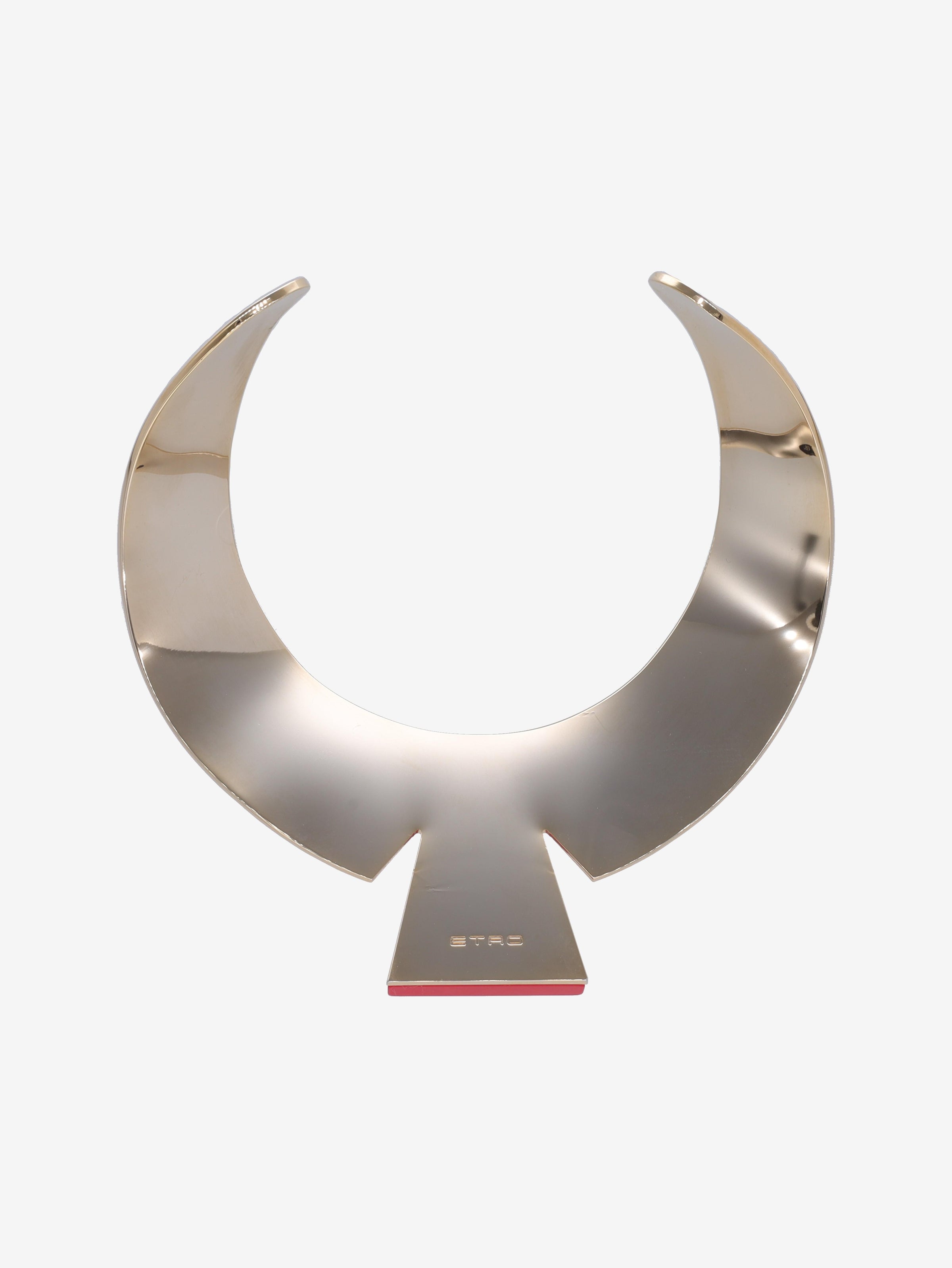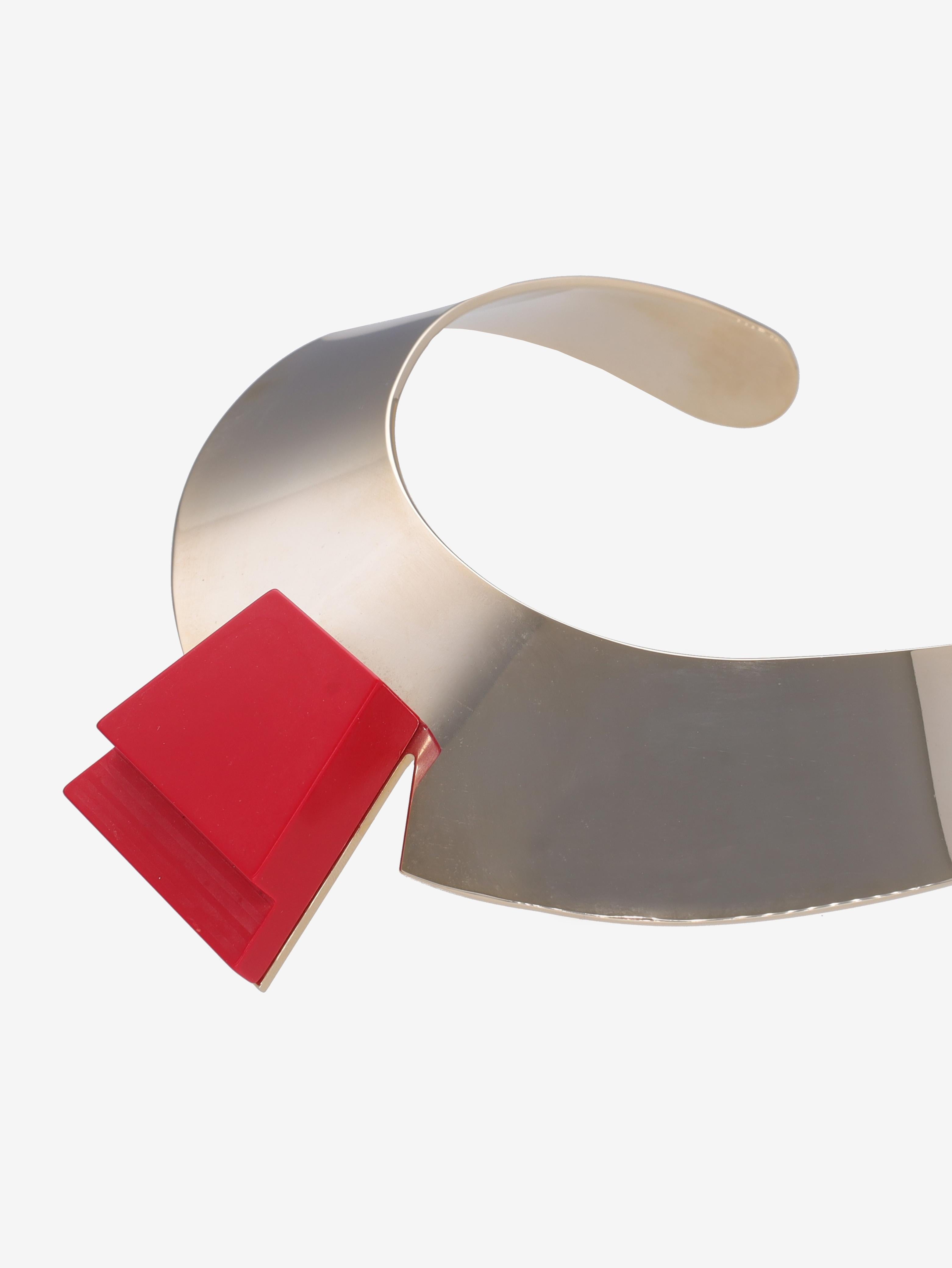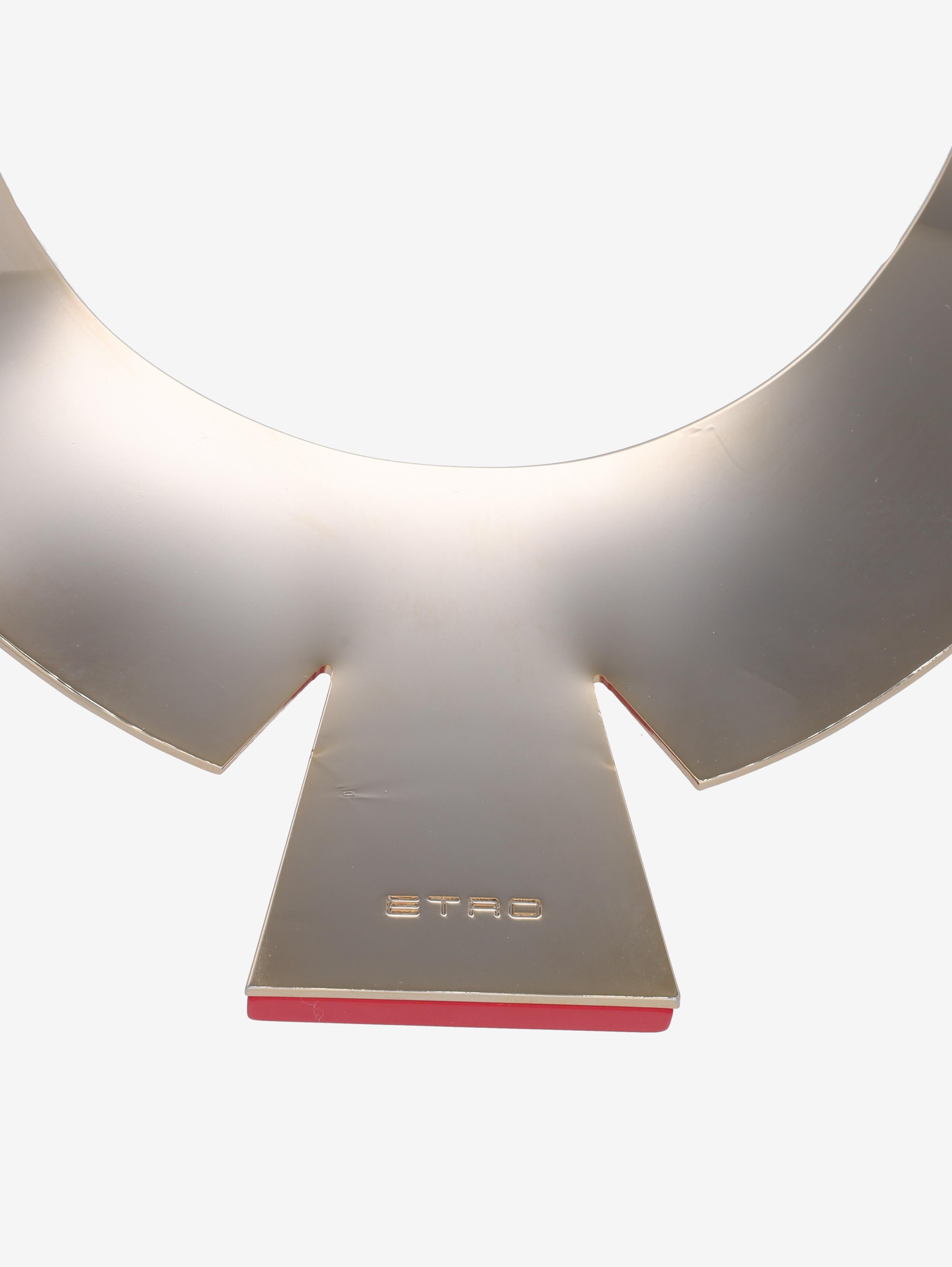 Etro Geometric Chocker Necklace. This necklace has an open-back design that fits rigidly around the neck. The piece comes with a geometric red middle detail.