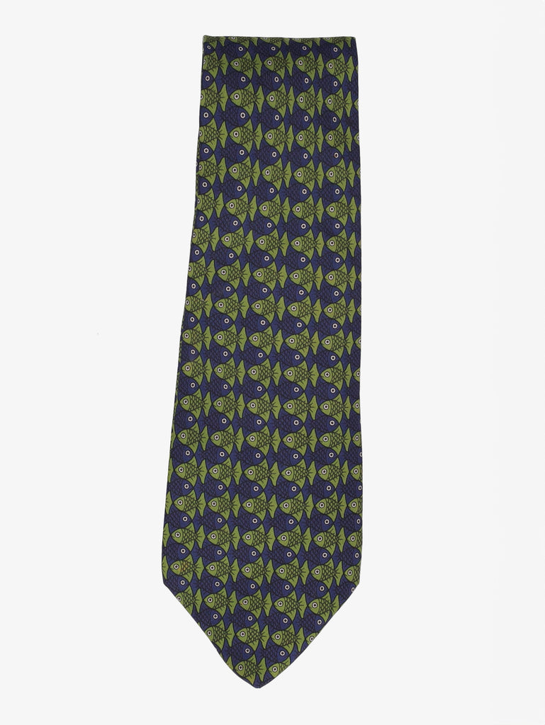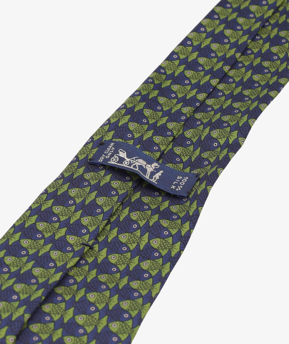 Hermès Fishes Print Tie is a silk tie with a print of green and blue fish interlocking in Escher style.