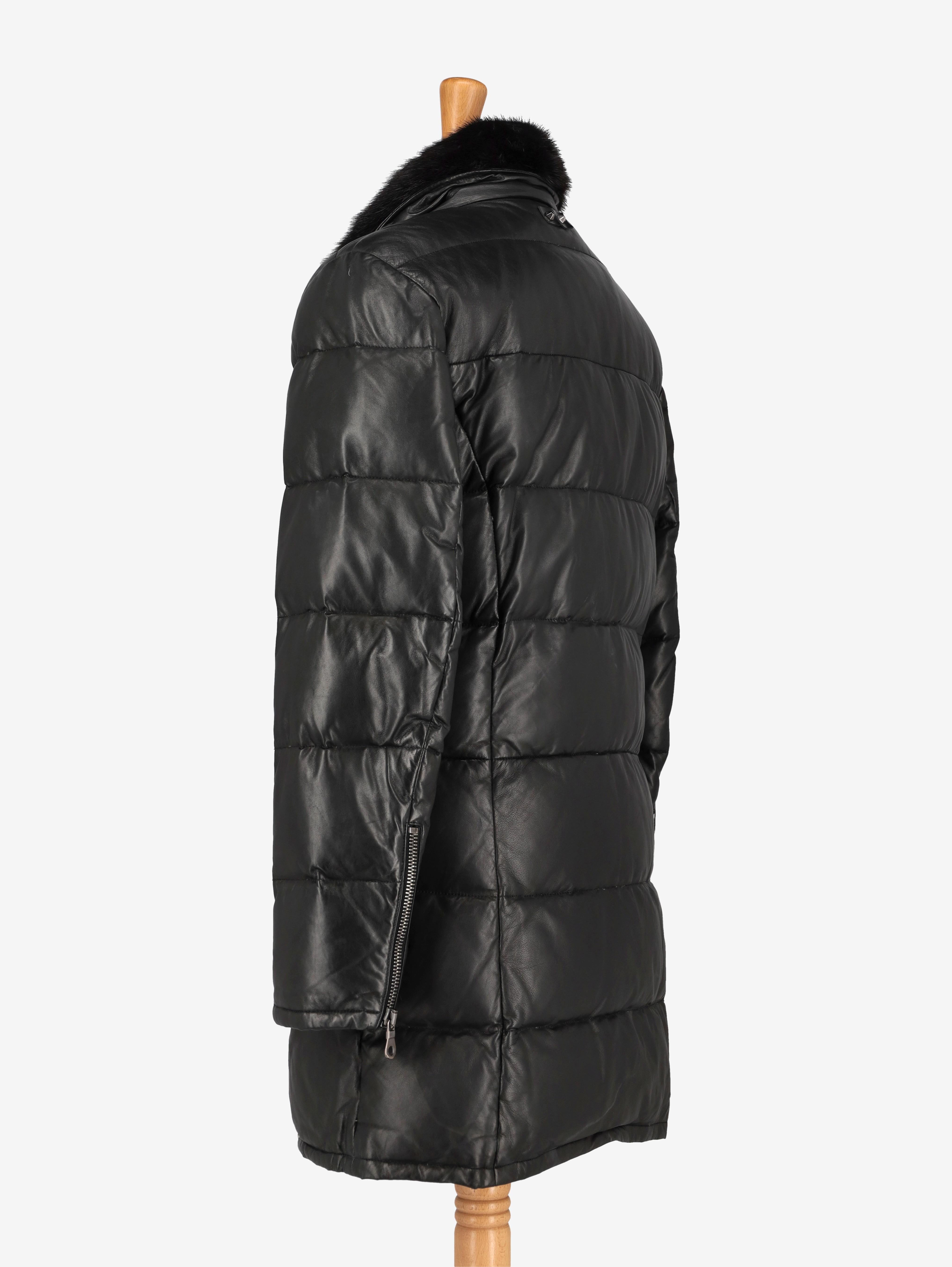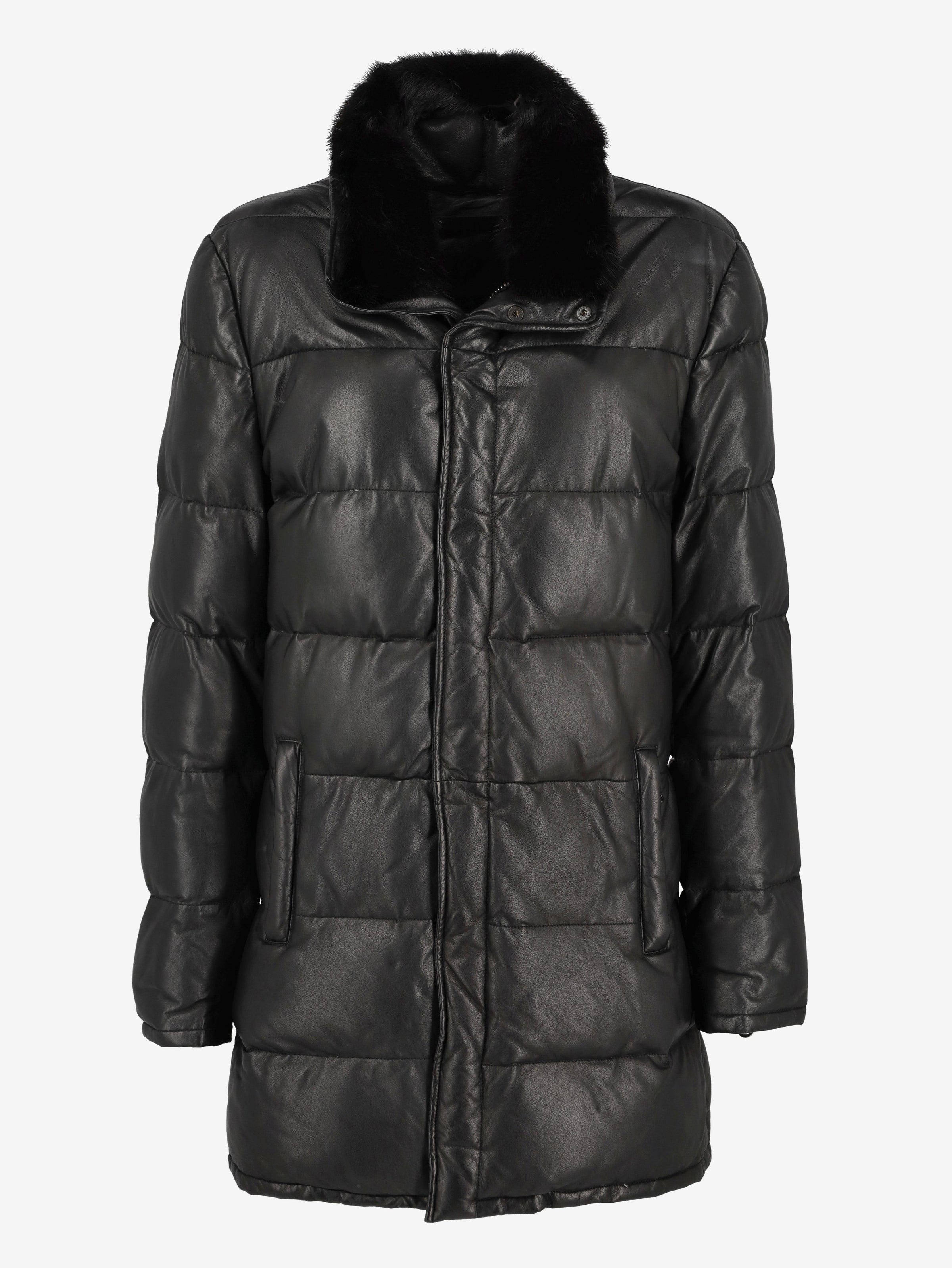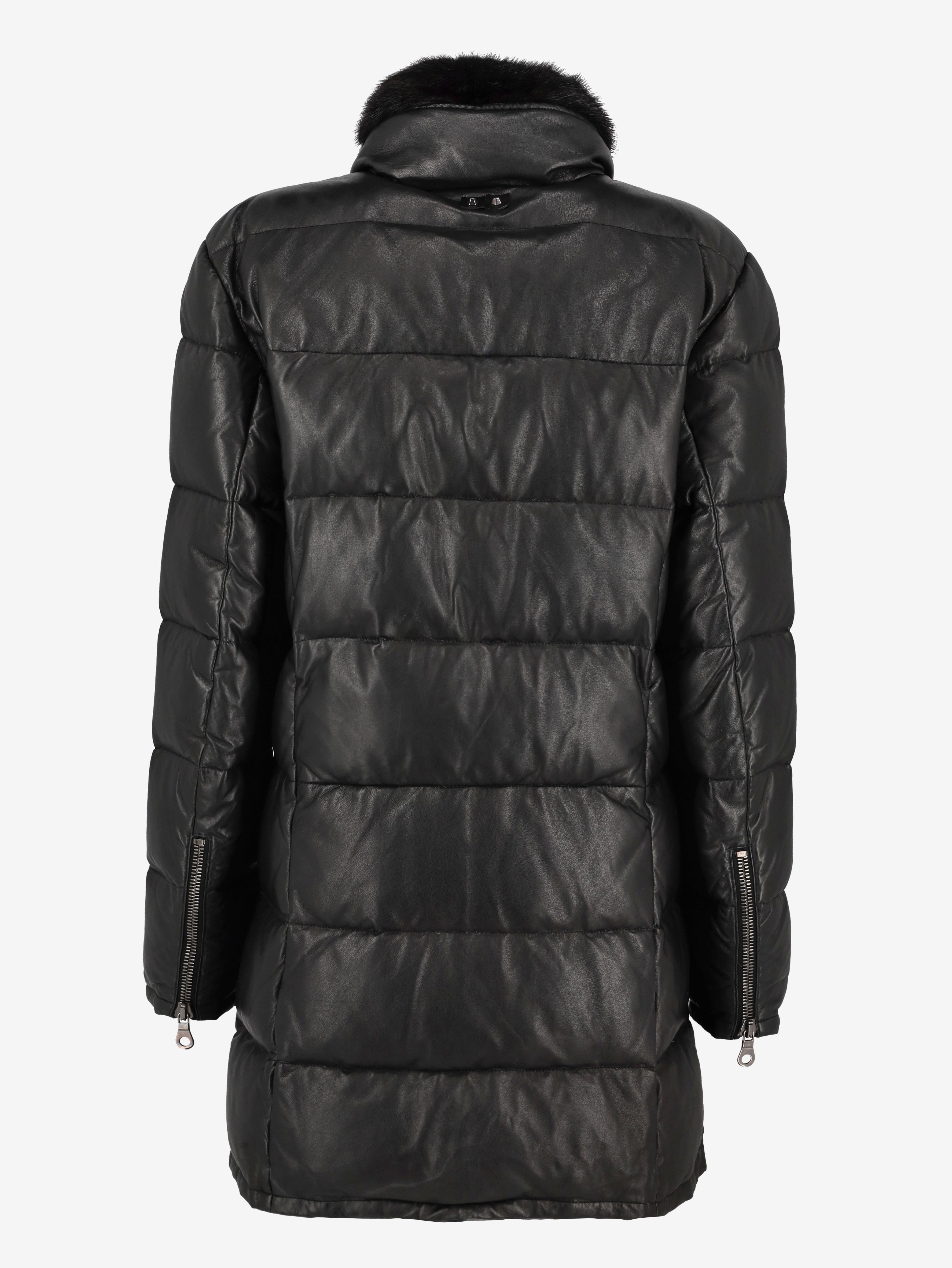 Vintage Leather Coat is a quilted coat with zip and button closure, stand-up collar, and removable fur trim around the neckline.