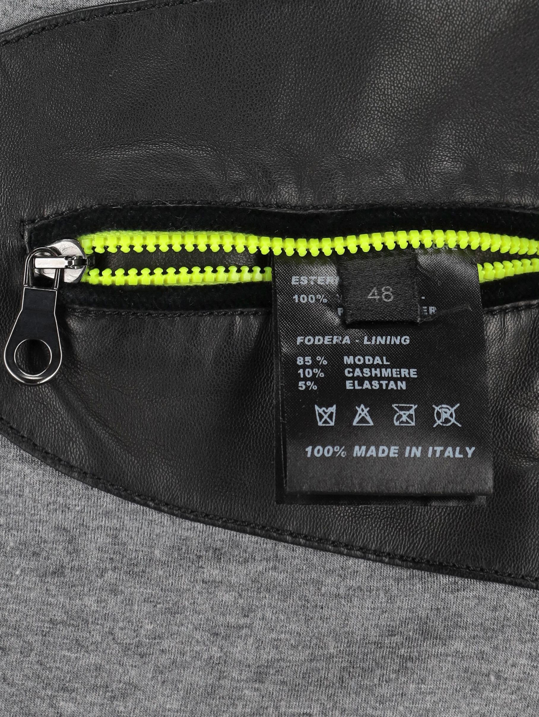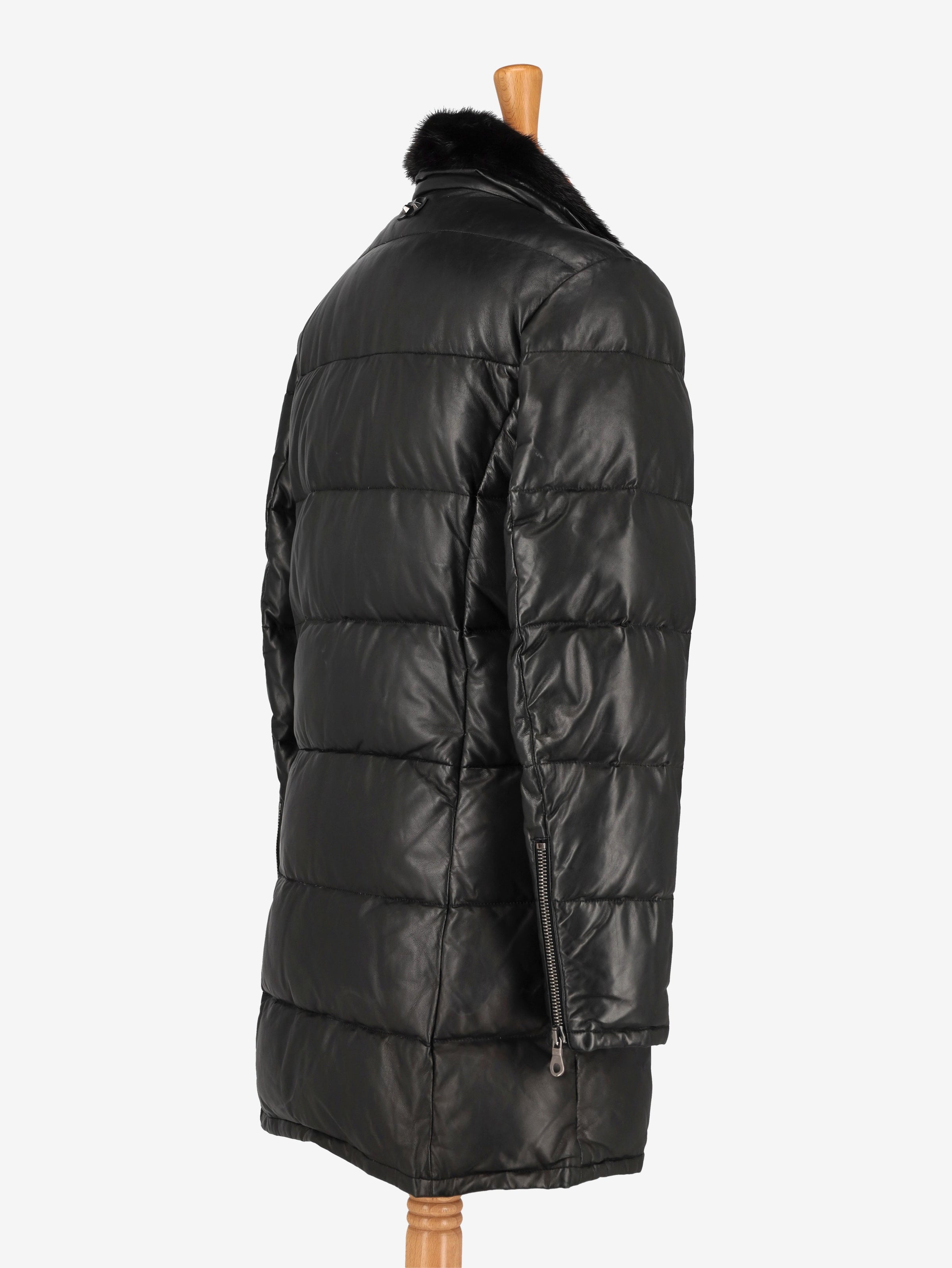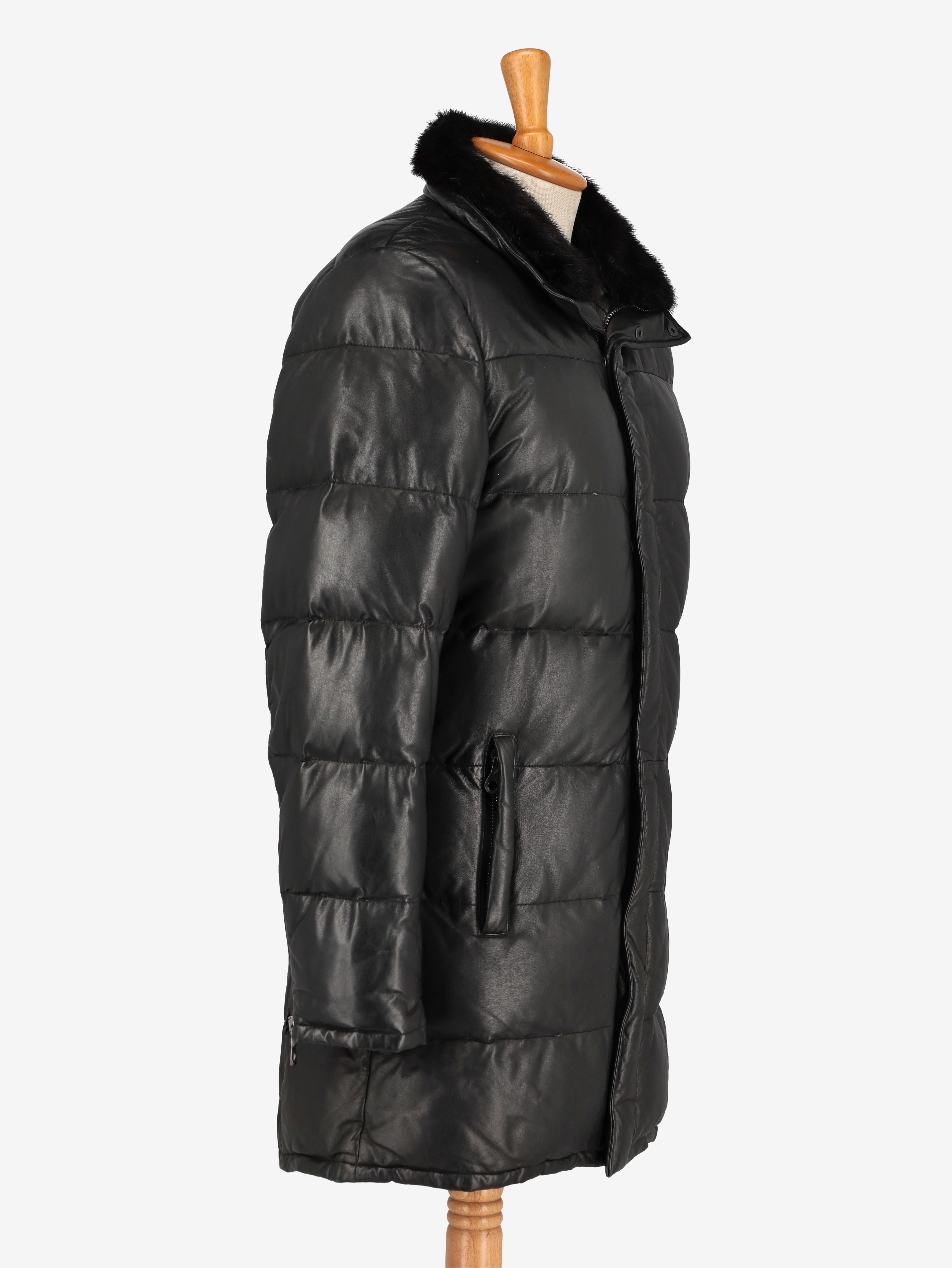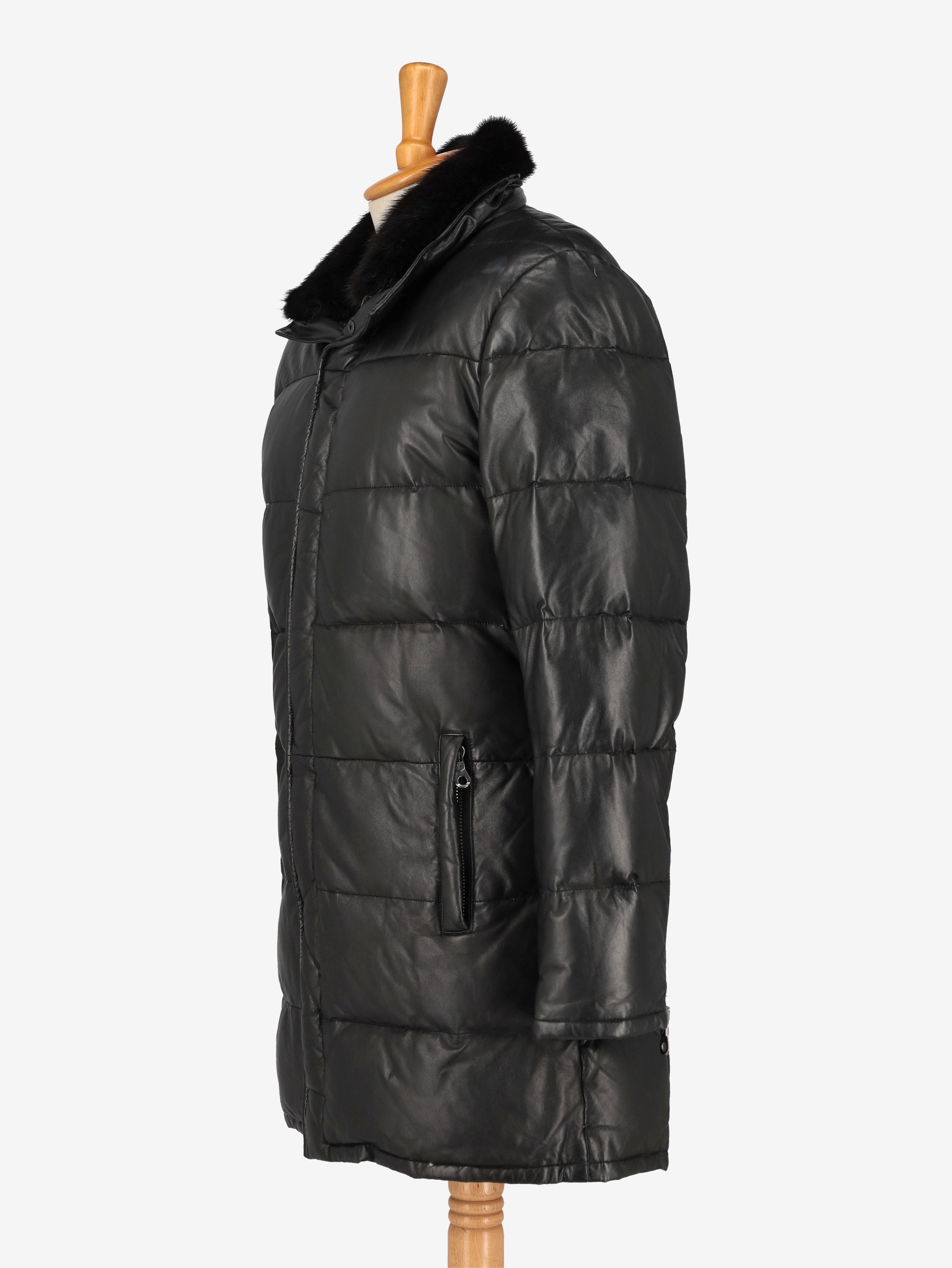 Vintage Leather Coat is a quilted coat with zip and button closure, stand-up collar, and removable fur trim around the neckline.