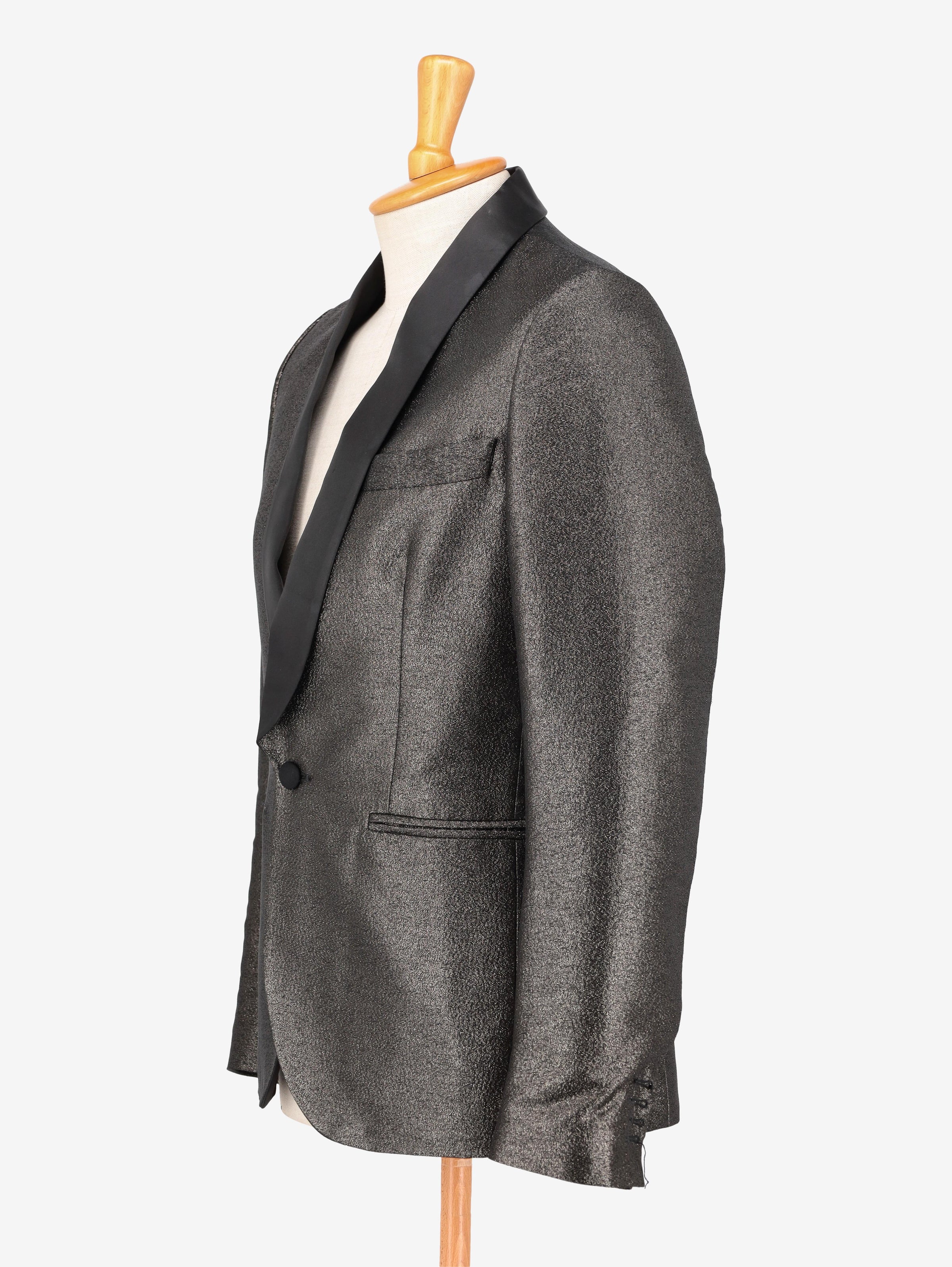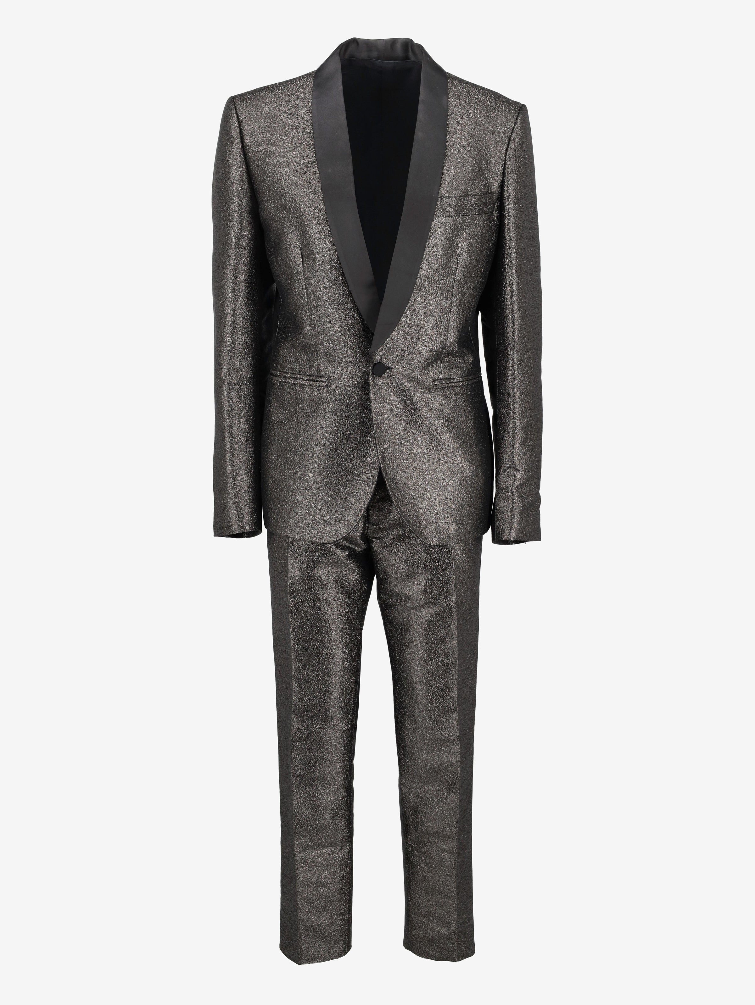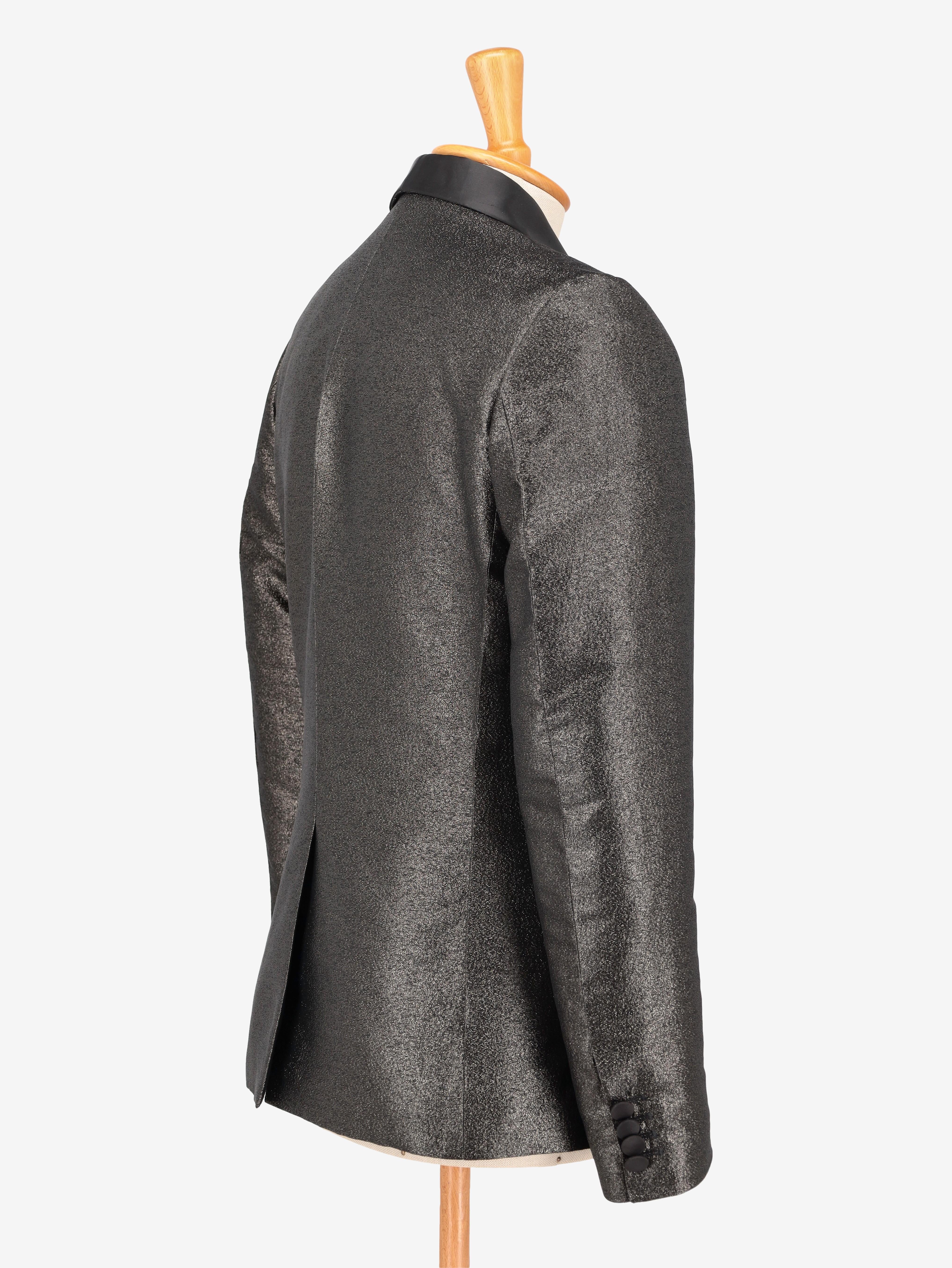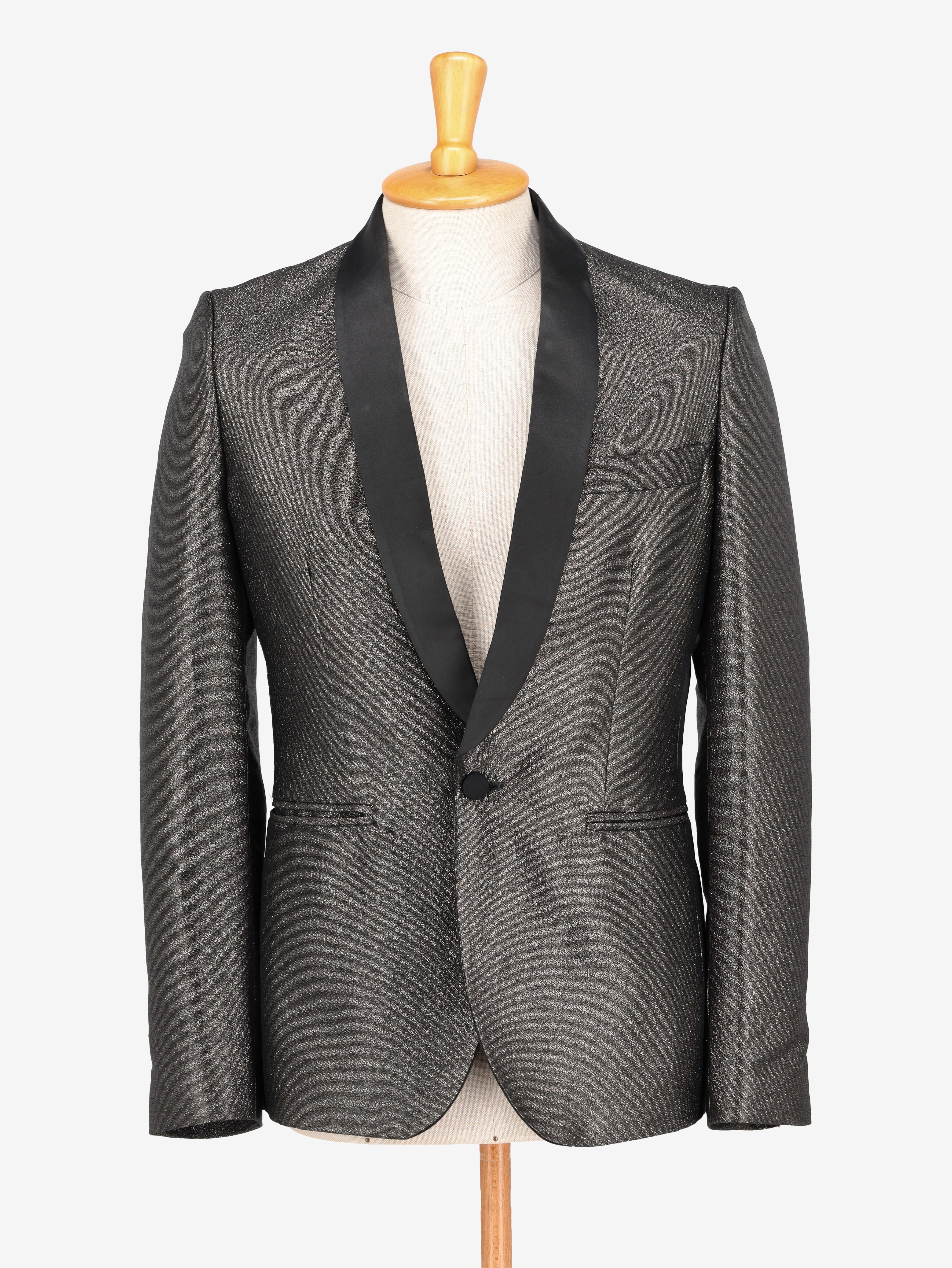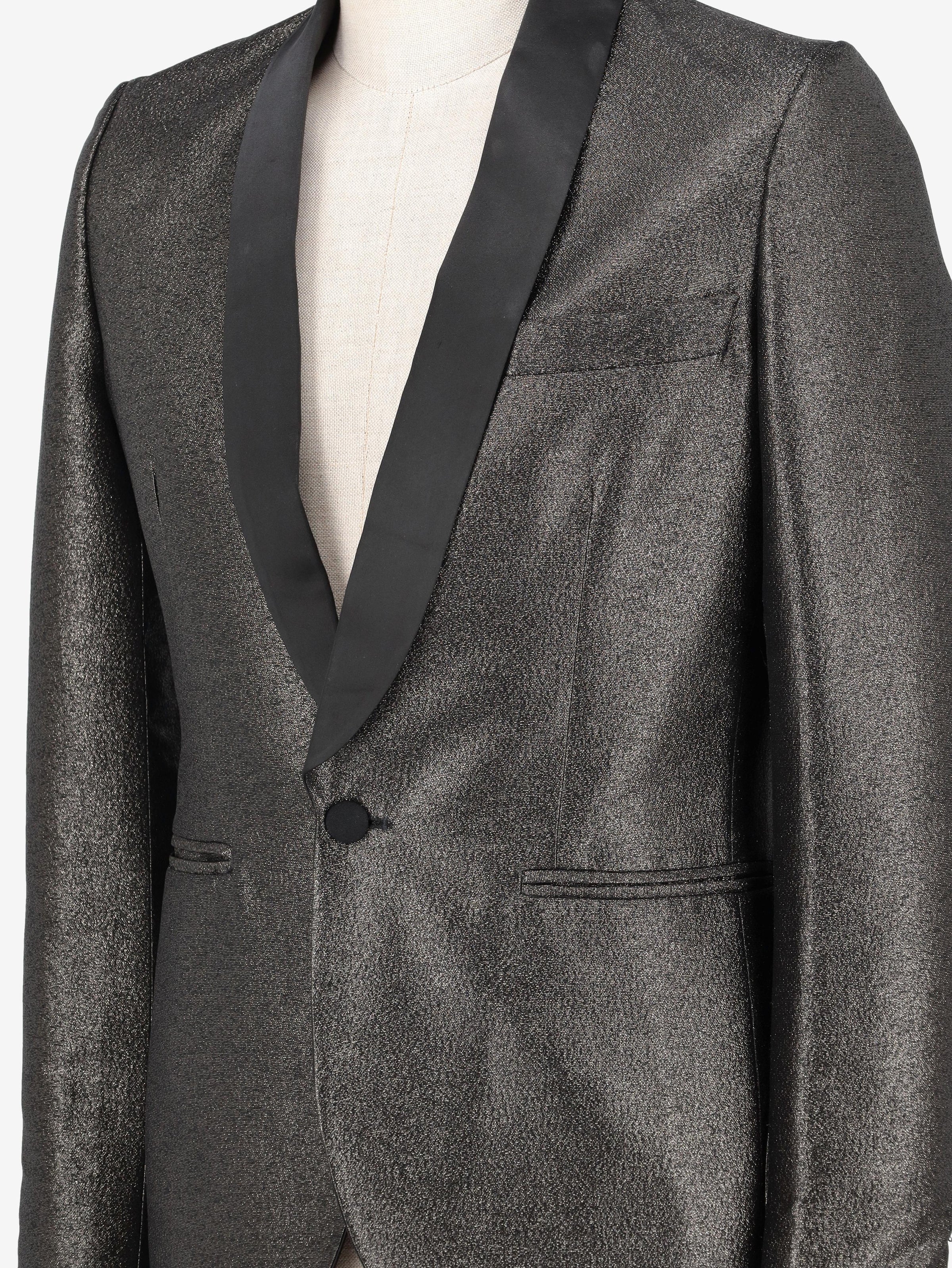 Vintage Silver Suit is a suit with a single-button jacket, black satin details on the lapel, and made entirely of structured silver fabric.