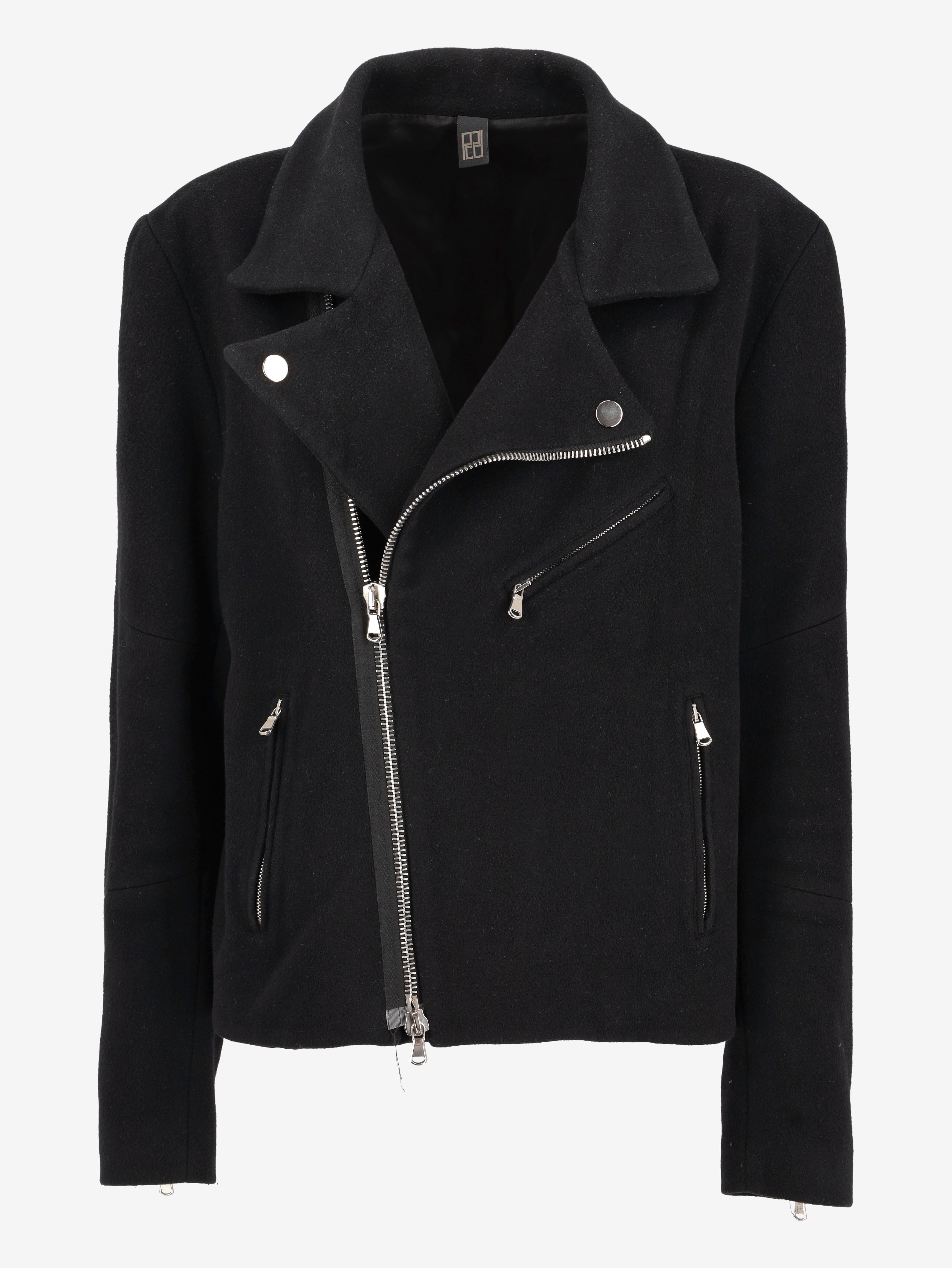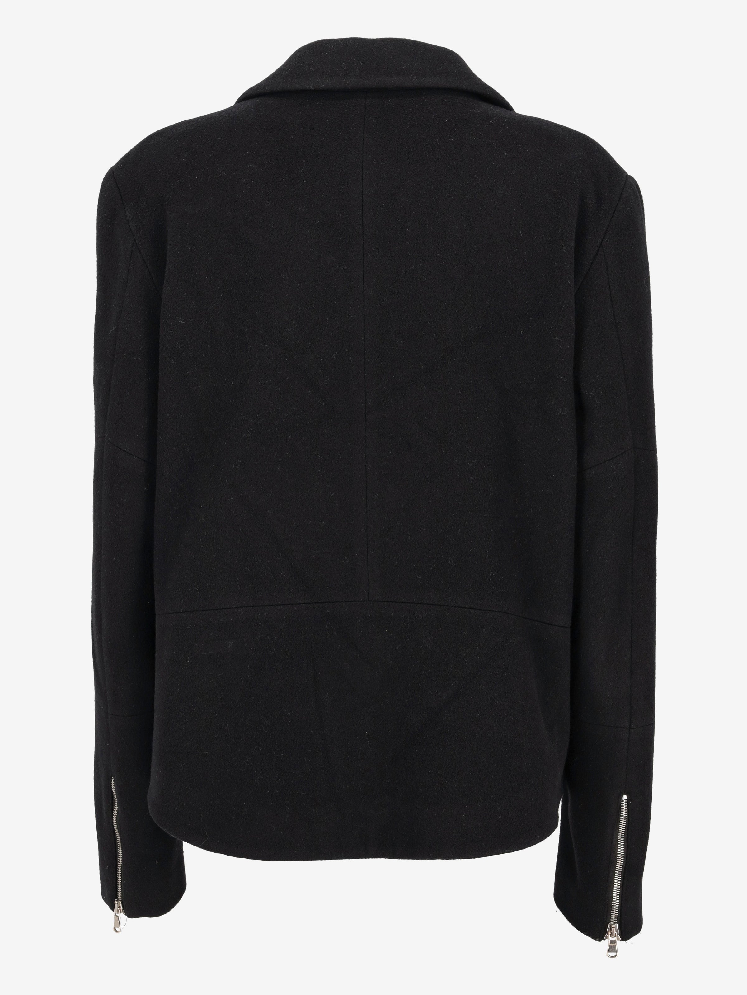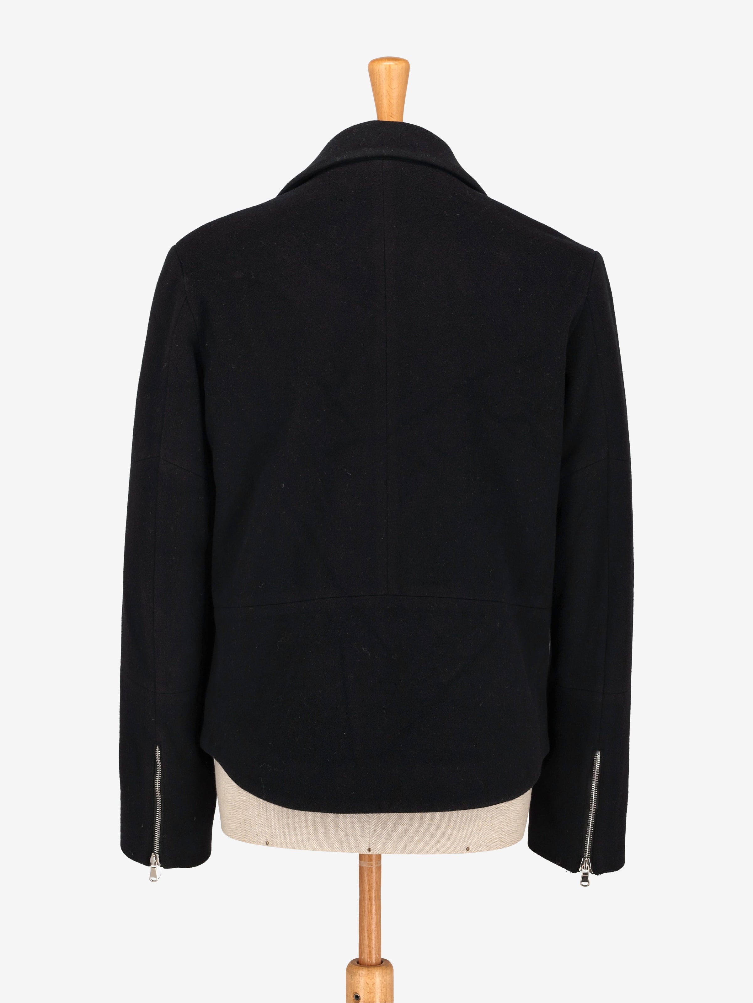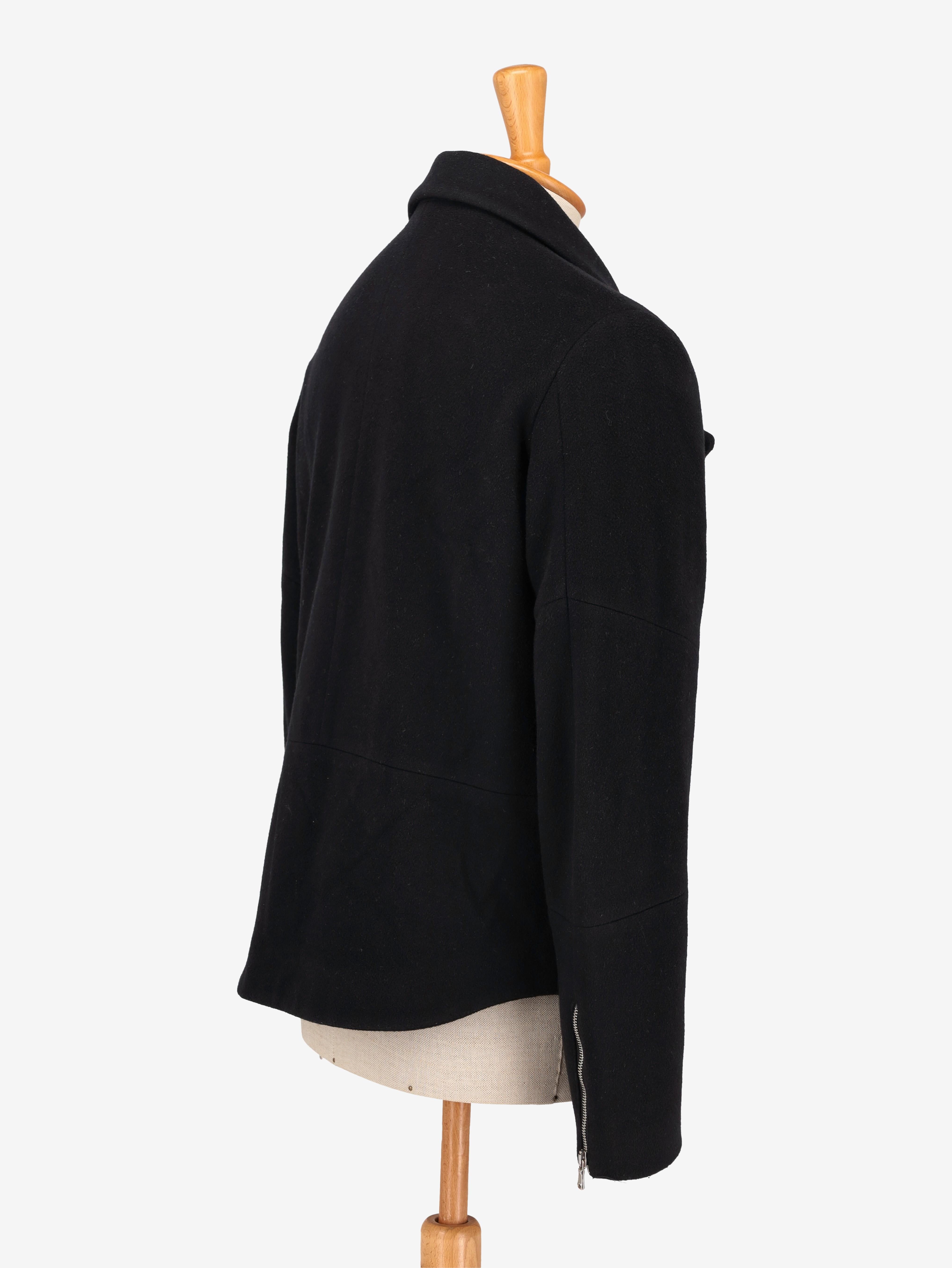 Vintage Wool Coat is a black wool biker jacket with zippered pockets and silver metal details.