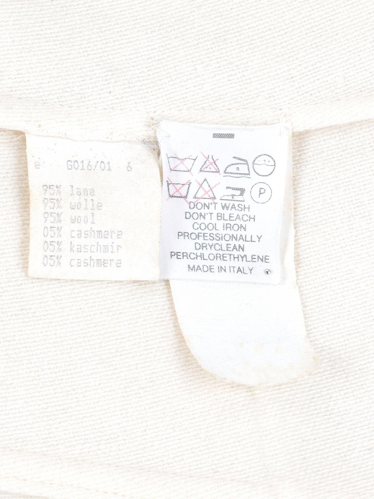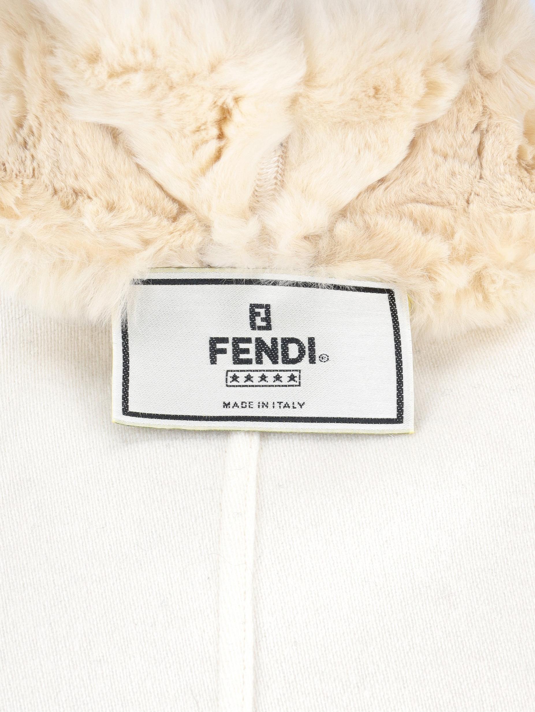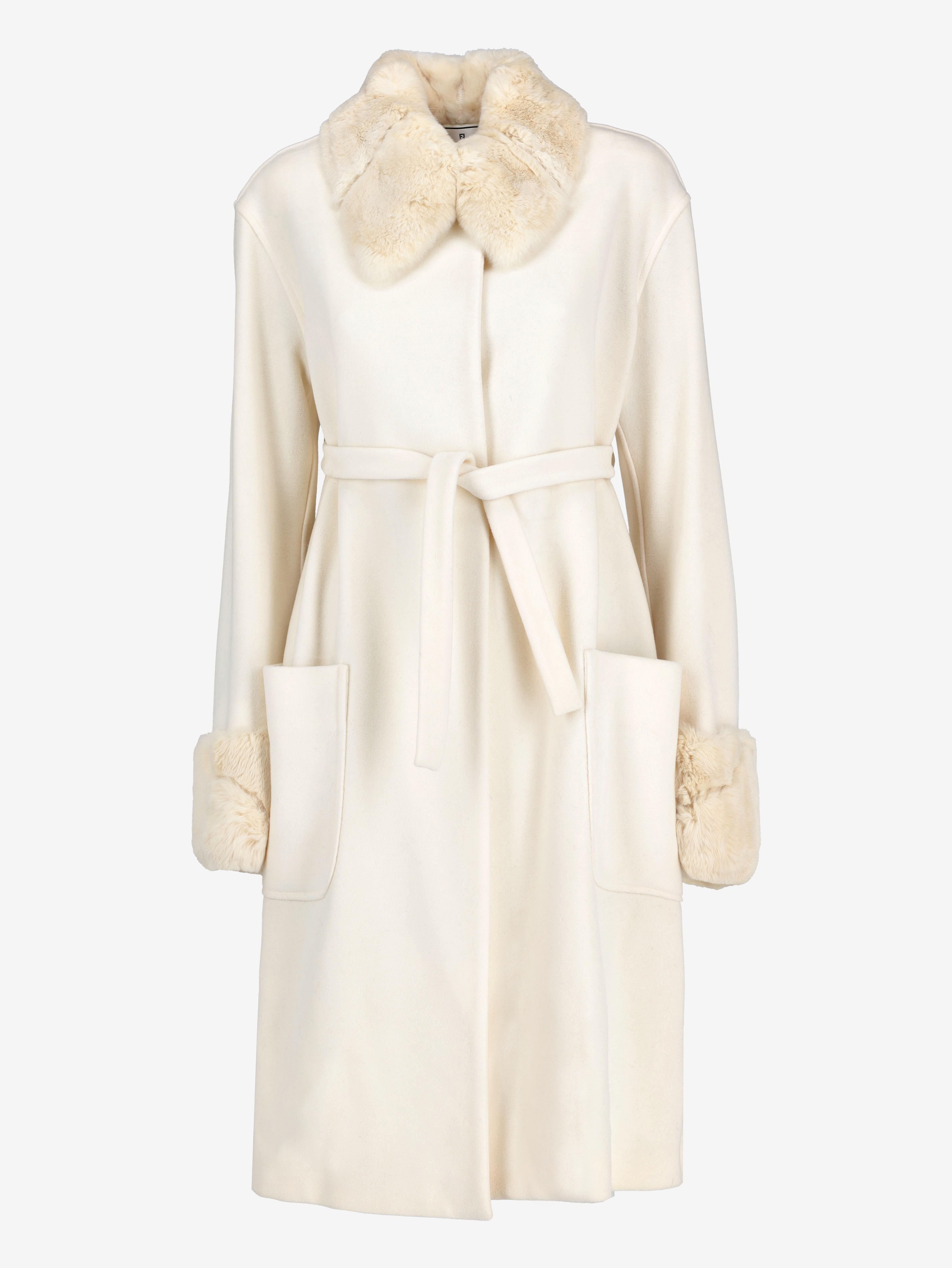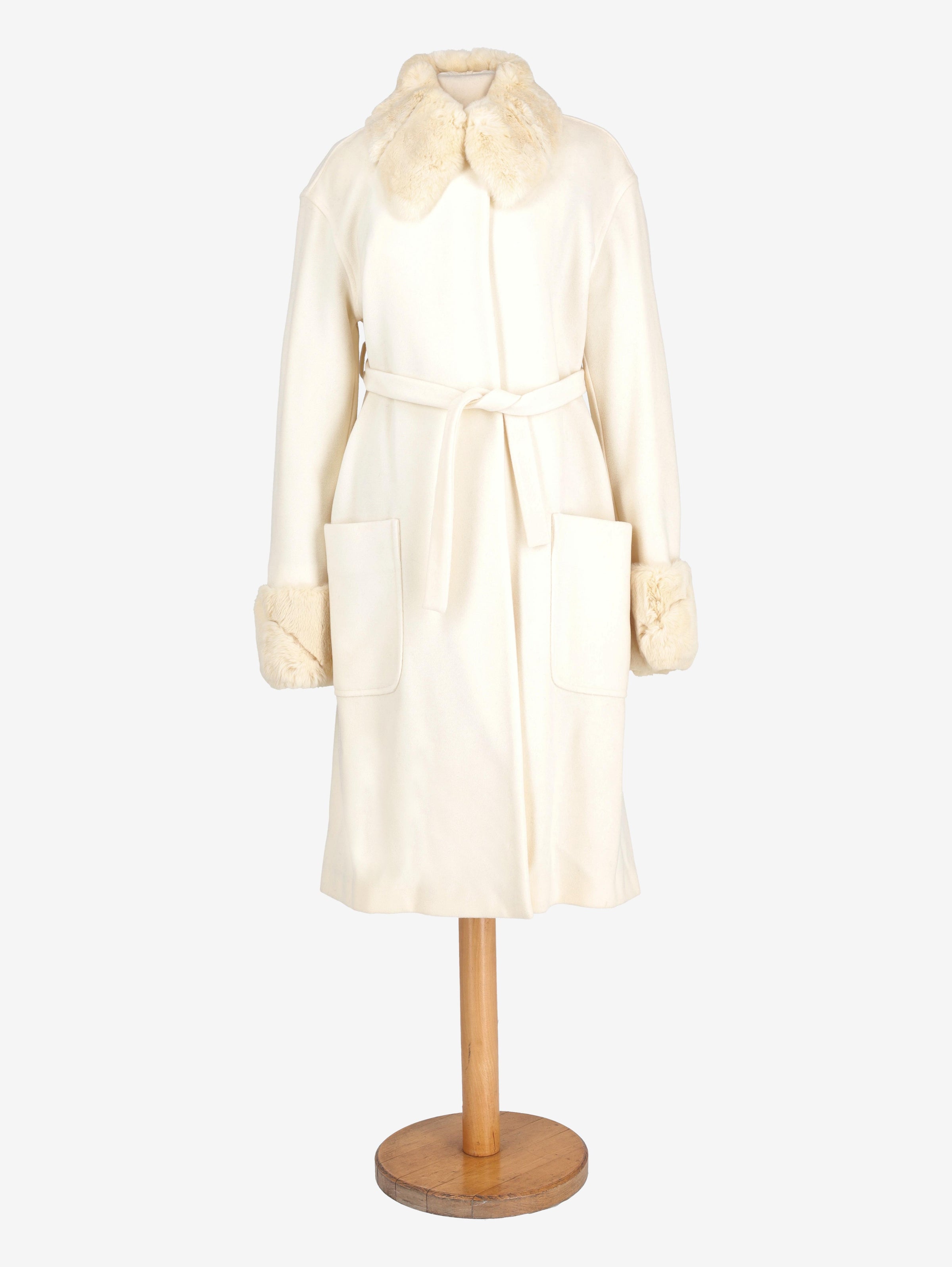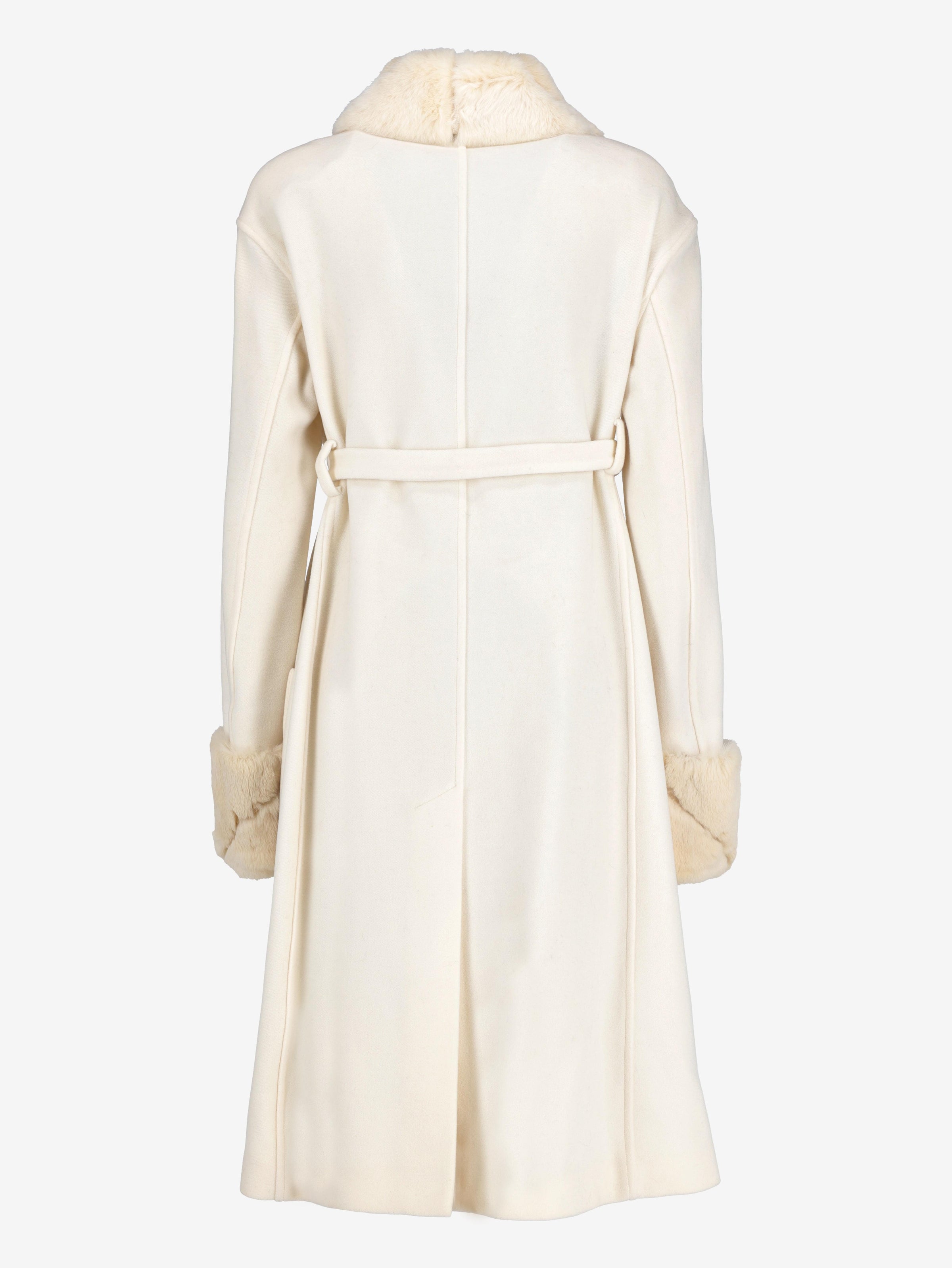 Fendi White Coat With Fur. This long coat features a single-button closure and a classic collar trimmed with fur. It includes front pockets and a small back slit, with fur detailing also on the sleeves.