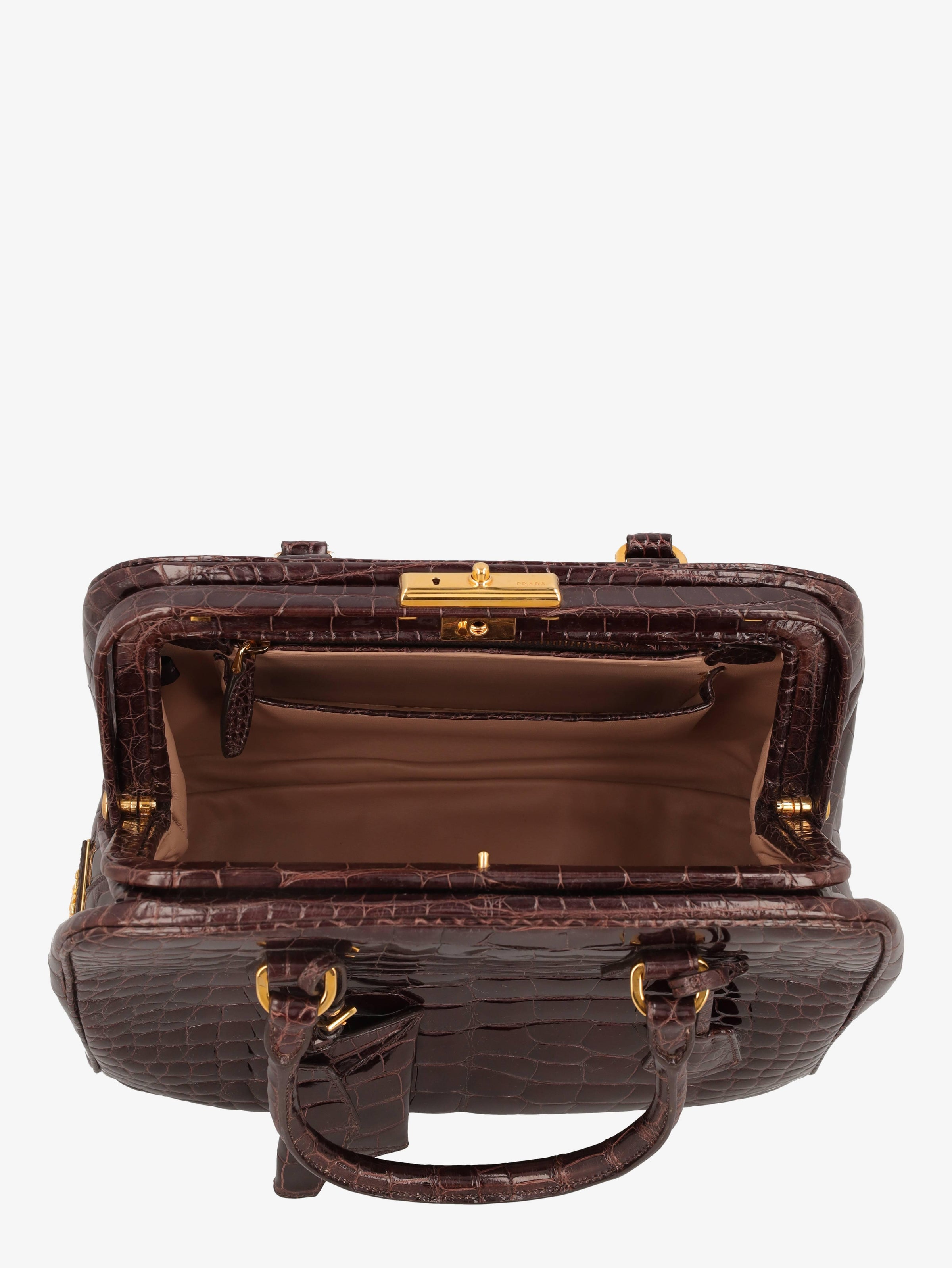Prada Crocodile Bauletto Bag in Dark Brown Crocodile Leather. This bag is a limited edition made of genuine crocodile leather with a glossy finish. Designed with a classic frame silhouette, it features dual rolled top handles, gold-tone hardware, a metal clasp engraved with Prada, and the iconic Prada triangle logo plaque on the side. The interior includes a small matching wallet, also crafted in crocodile leather. The bag can be securely closed with its original key.