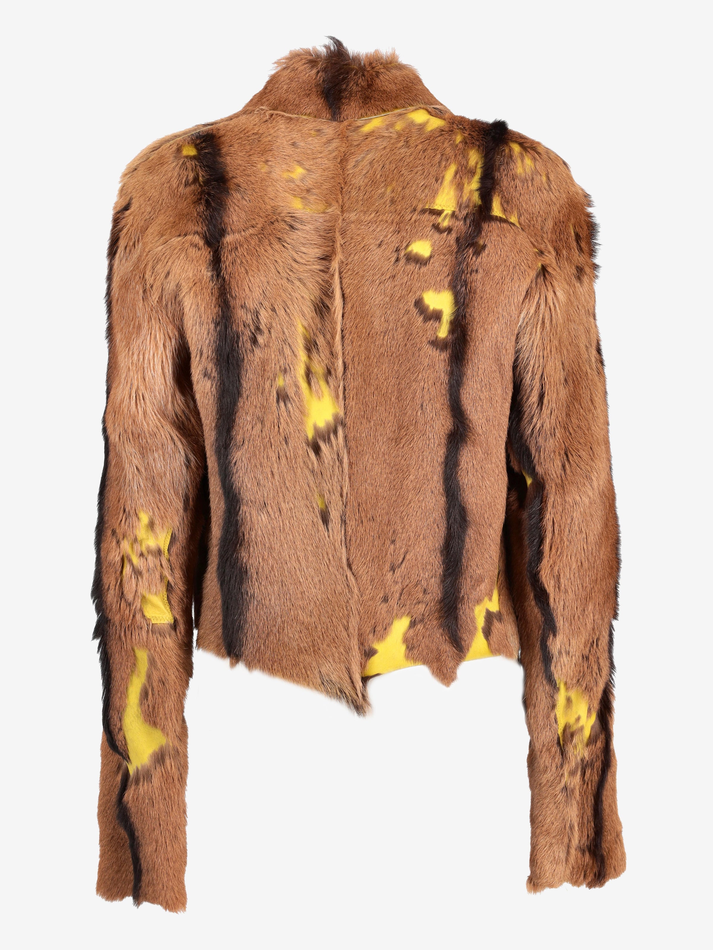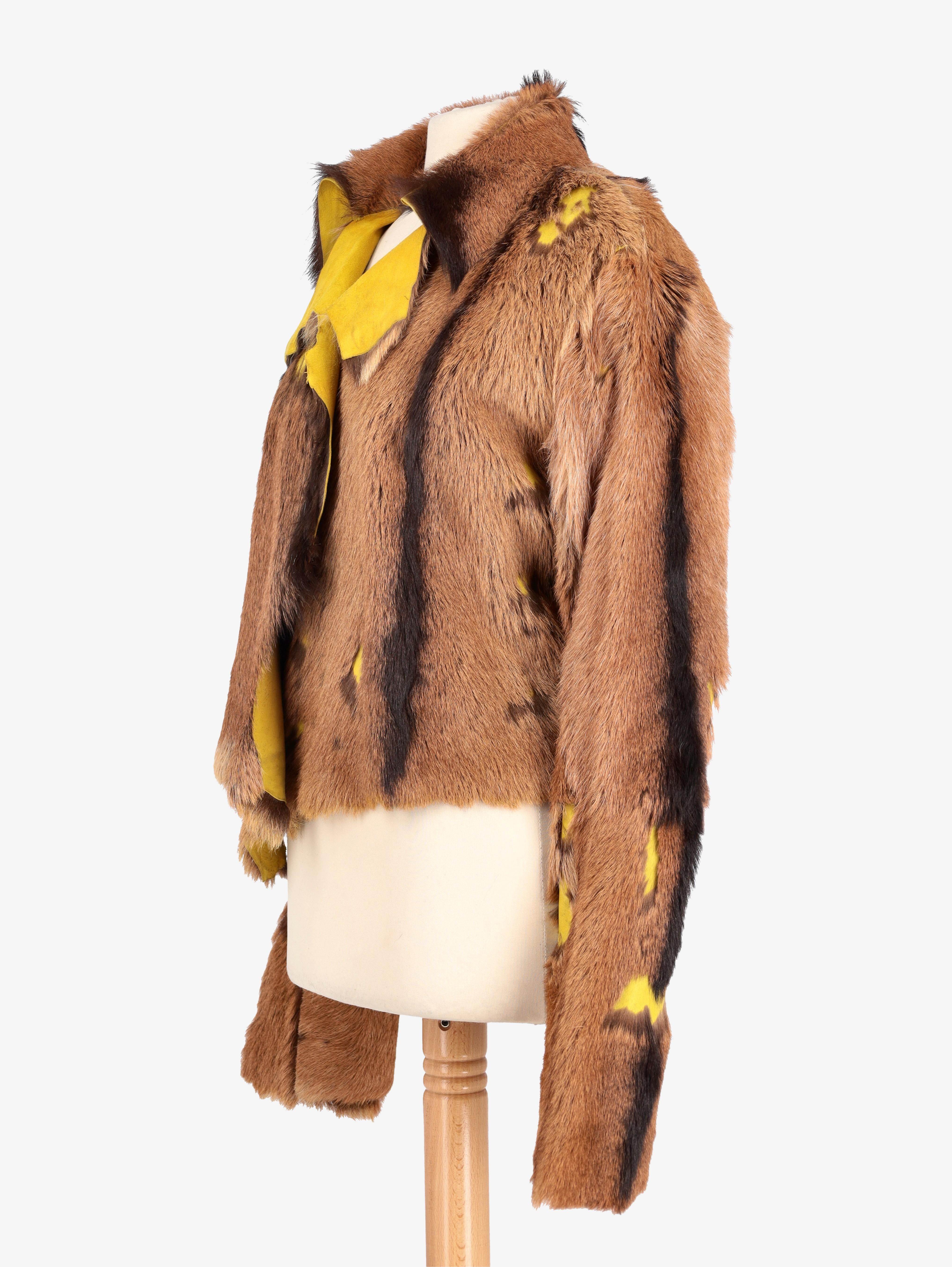 Vintage Leather Jacket With Fur. This jacket is crafted from genuine leather, featuring an acid green-tinted interior contrasted with rich brown fur on the exterior. The clean, minimal design is enhanced by free-cut edges at the front, creating natural movement