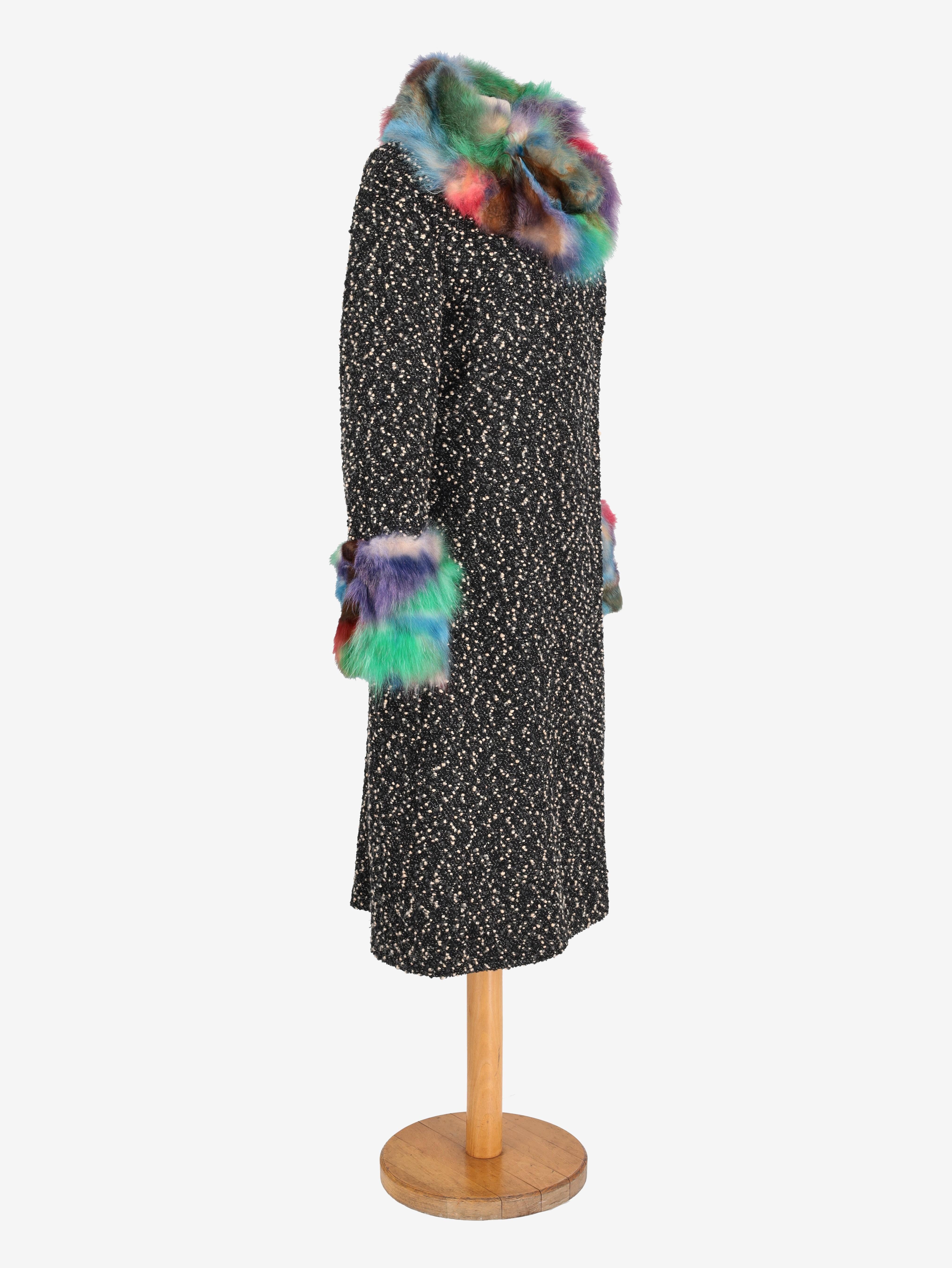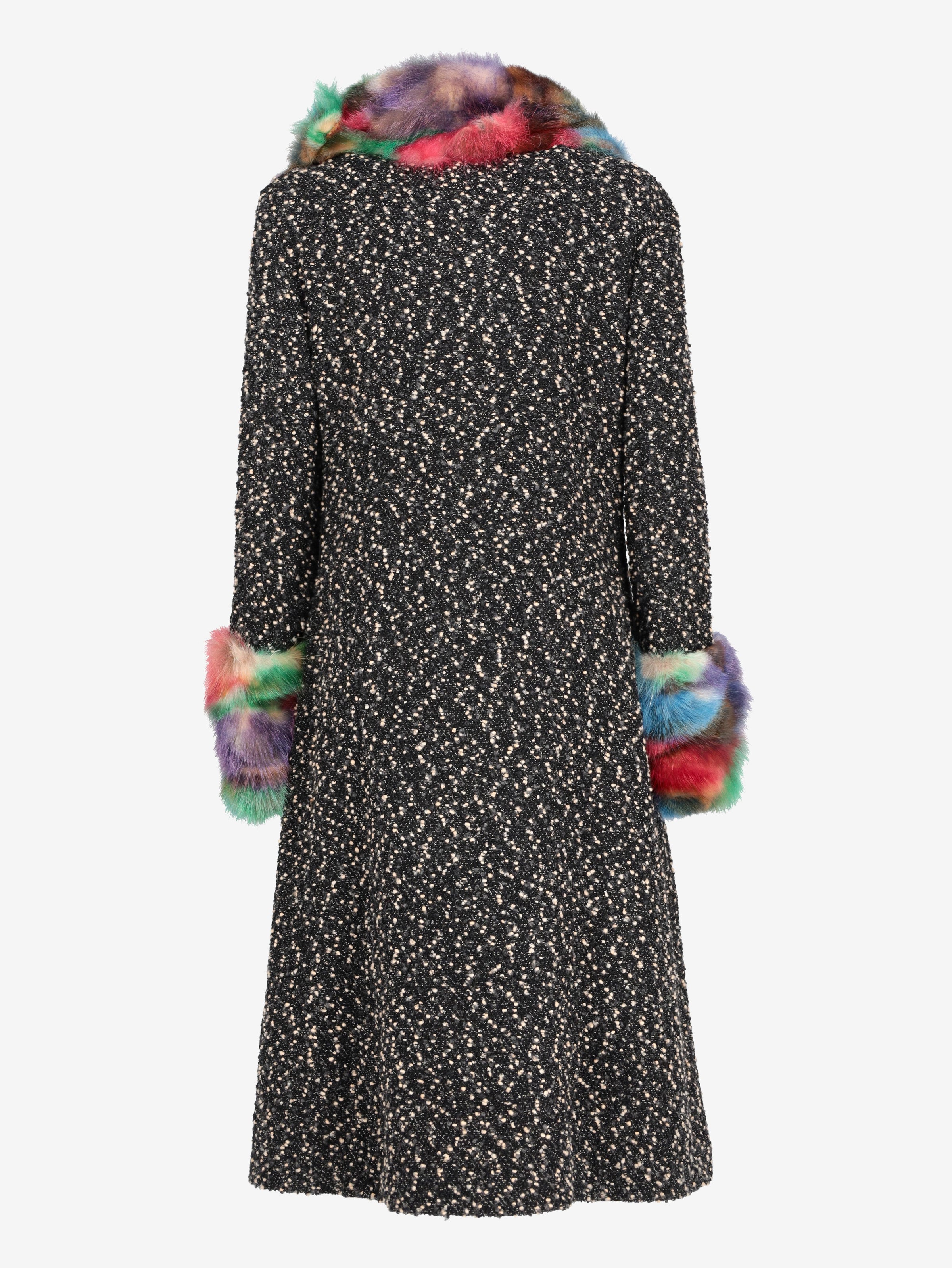 Voyage Coat With Multicolor Fur. This wool coat features multicolor fur inserts along the sleeve edges and neckline, adding texture and elegance. It includes side pockets for everyday convenience.