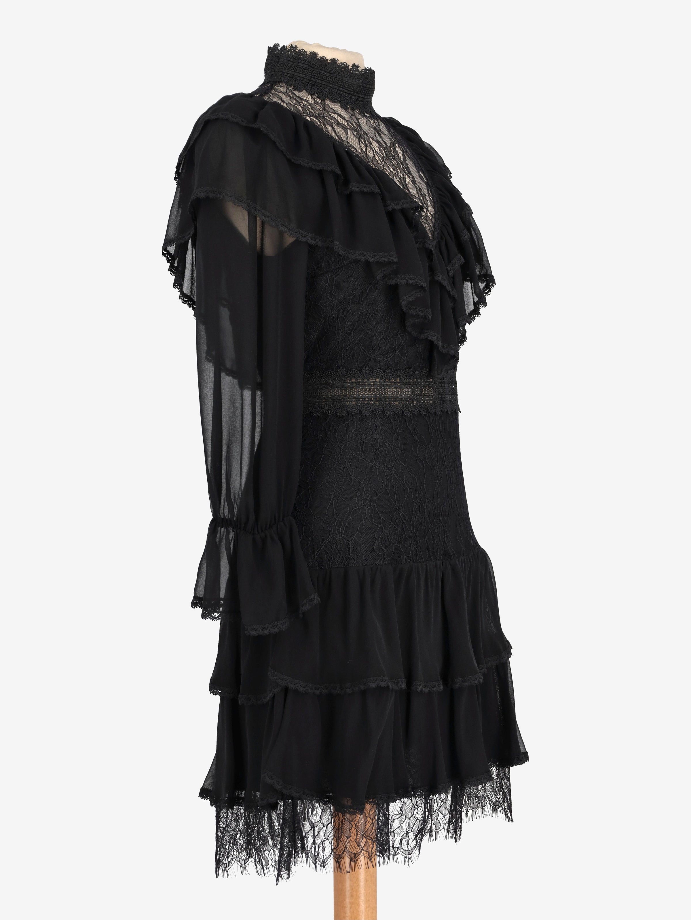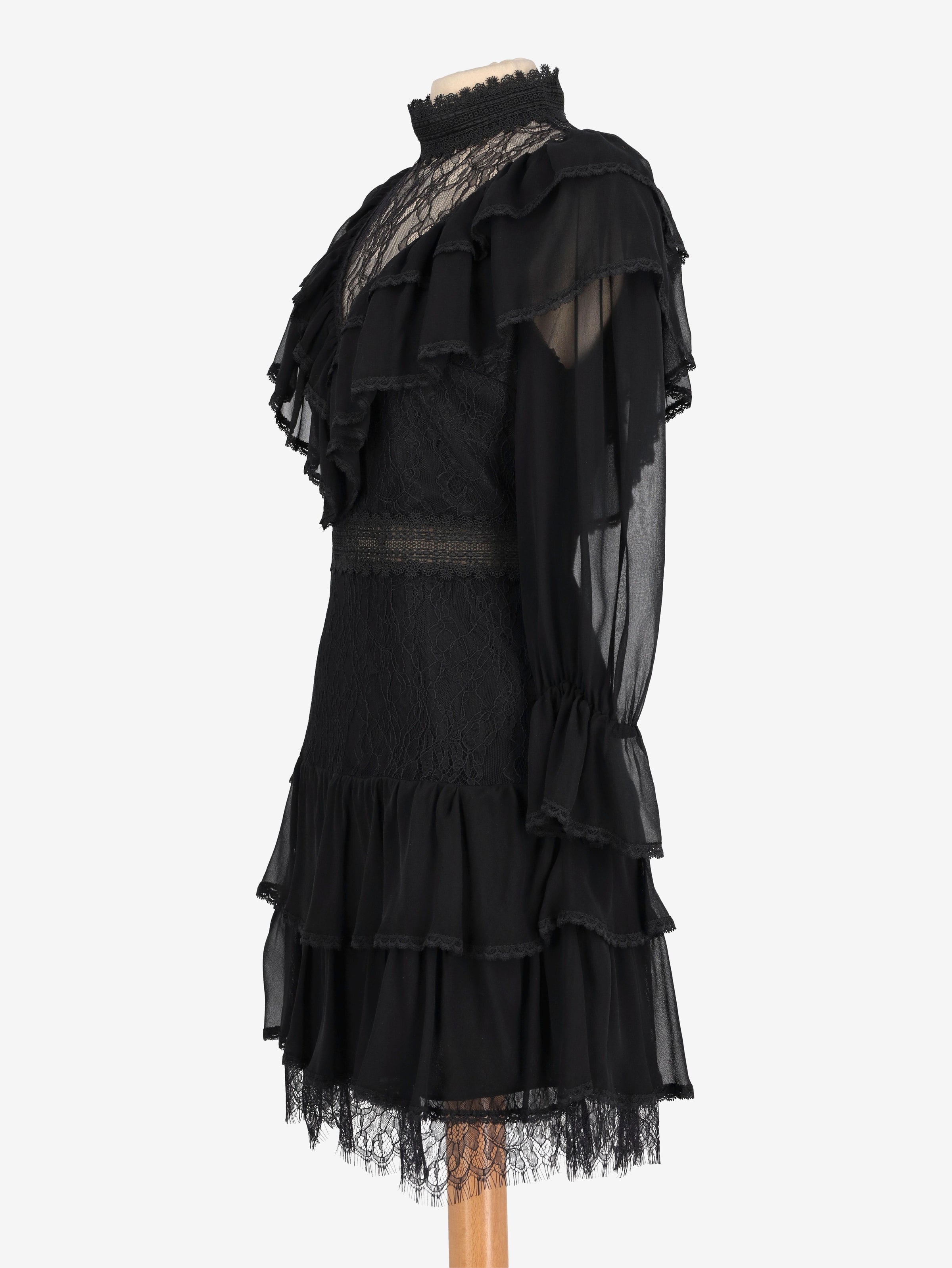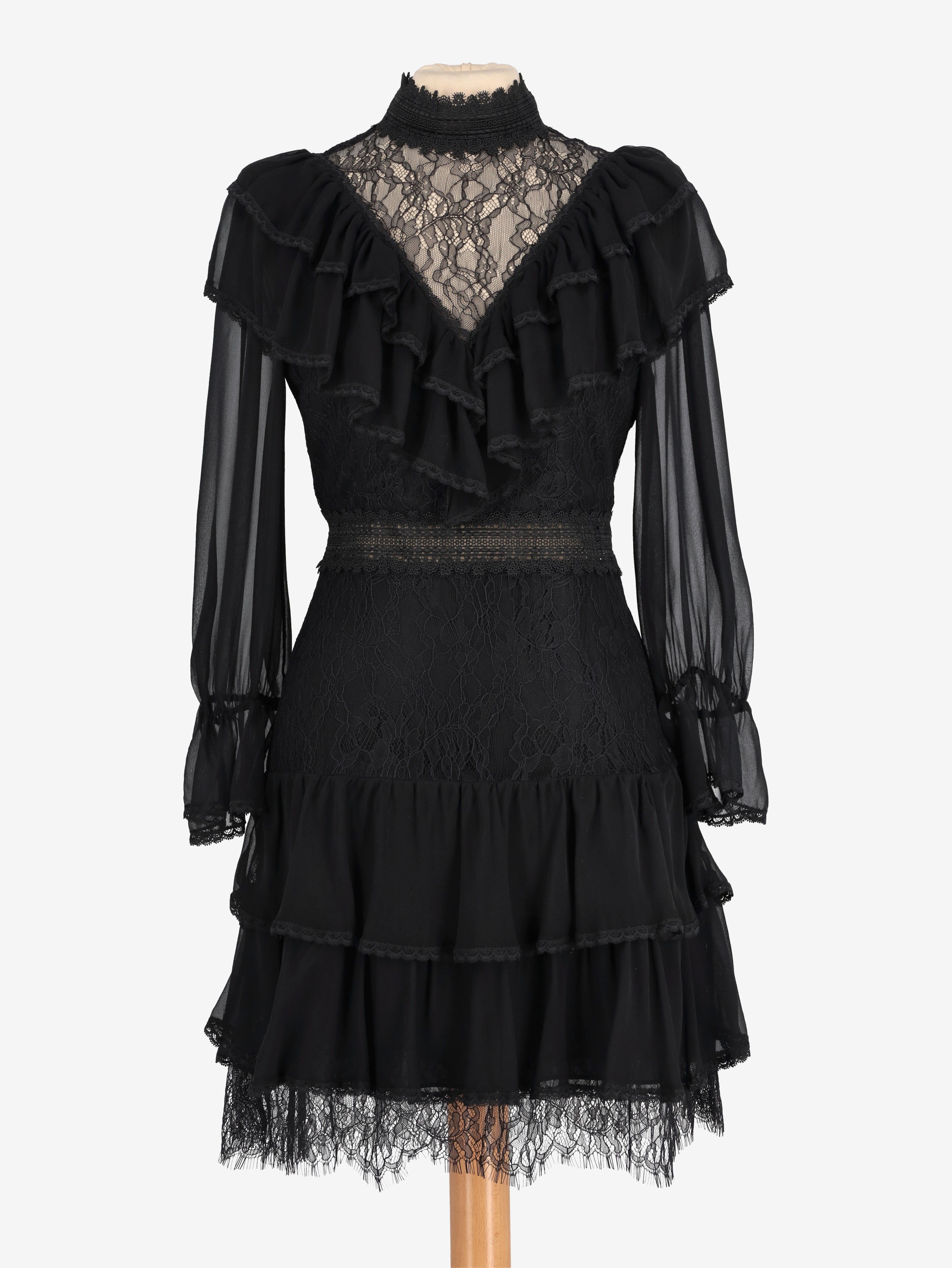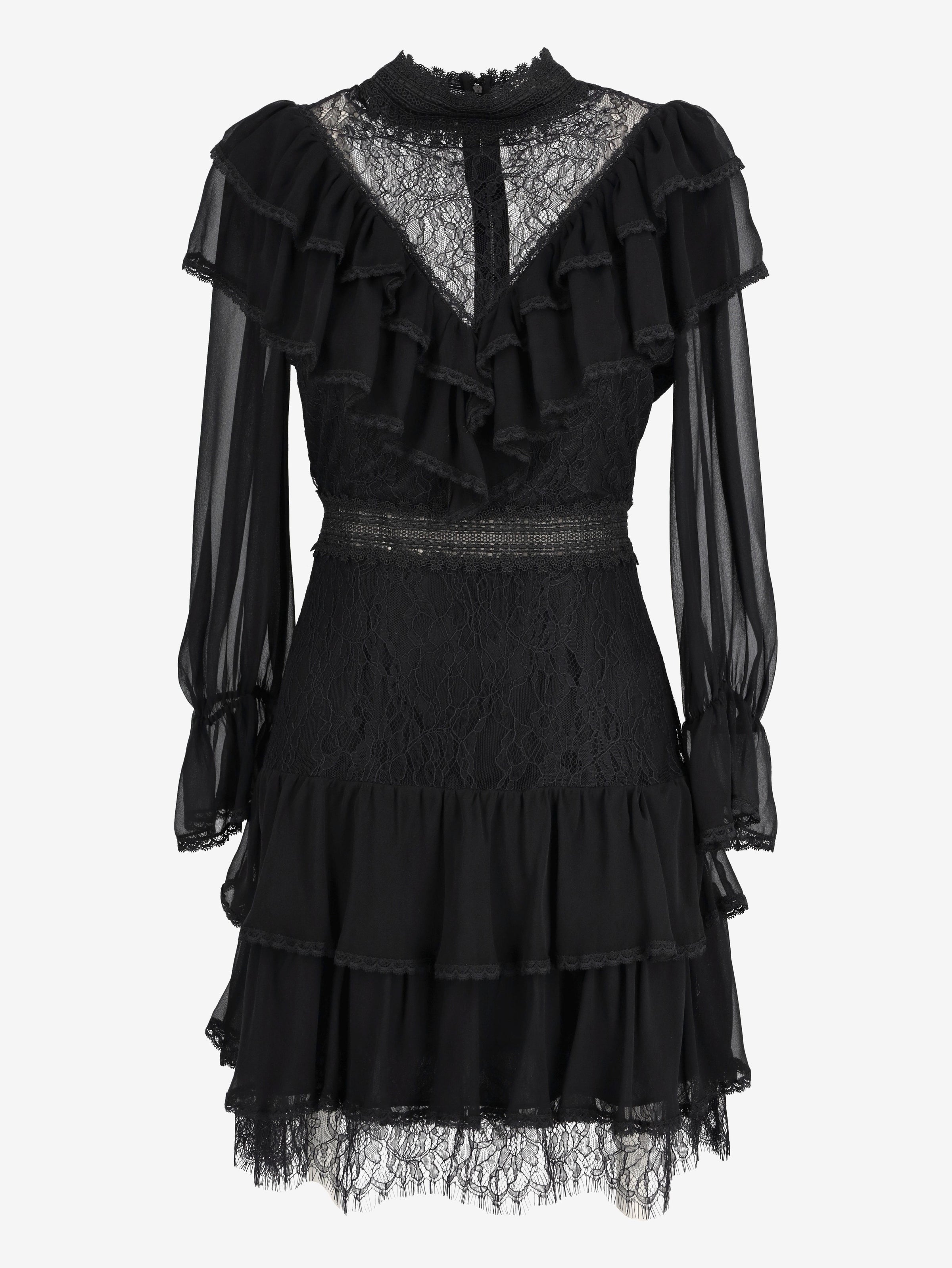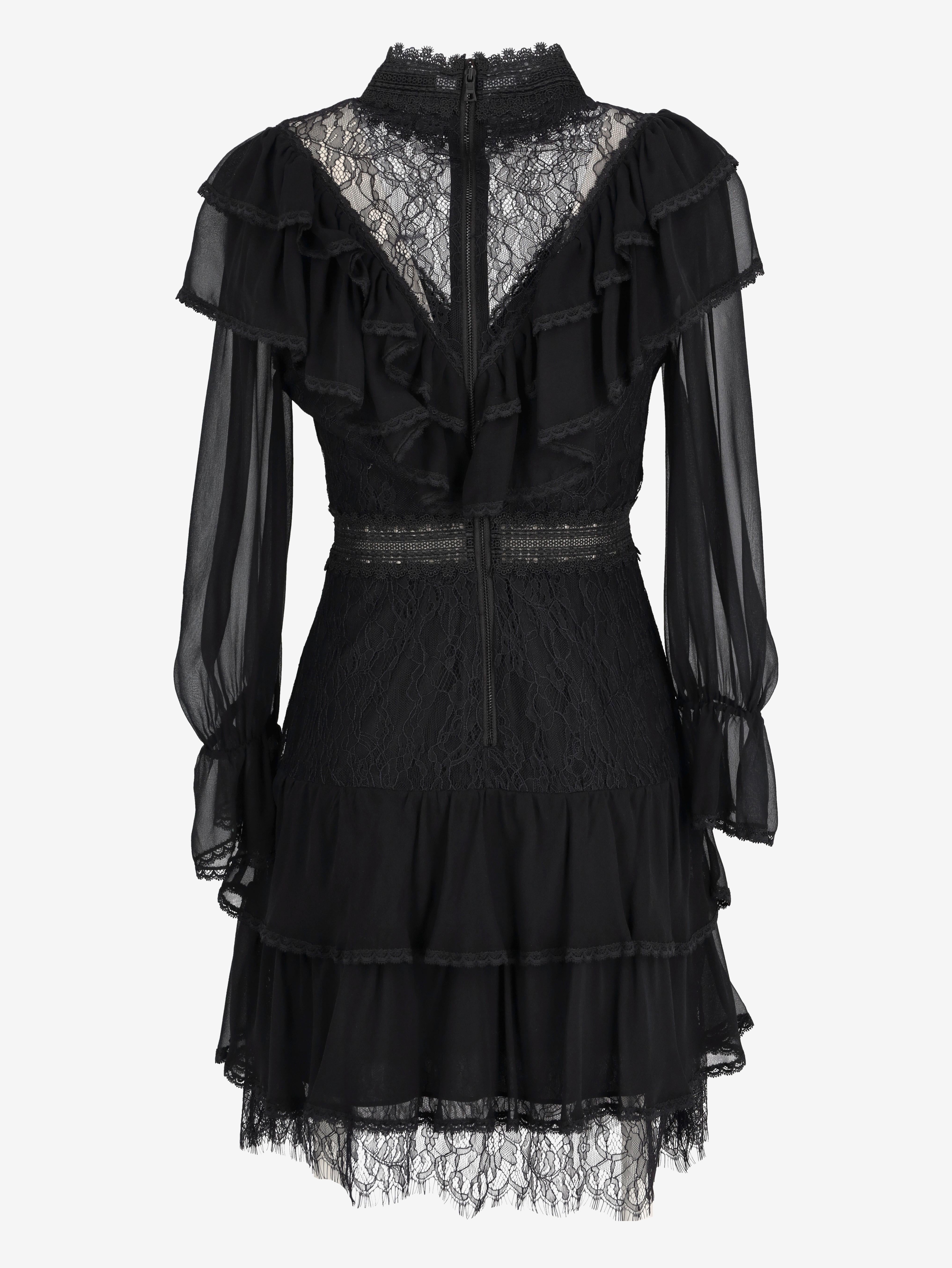 Alice+Olivia Romantic Lace Dress. This dress is crafted from sheer chiffon and lace, featuring a high neckline and ruffled detailing throughout the body. Semi-sheer long sleeves with softly gathered cuffs add delicacy, while the flowy skirt is finished with a lace-trimmed hem.