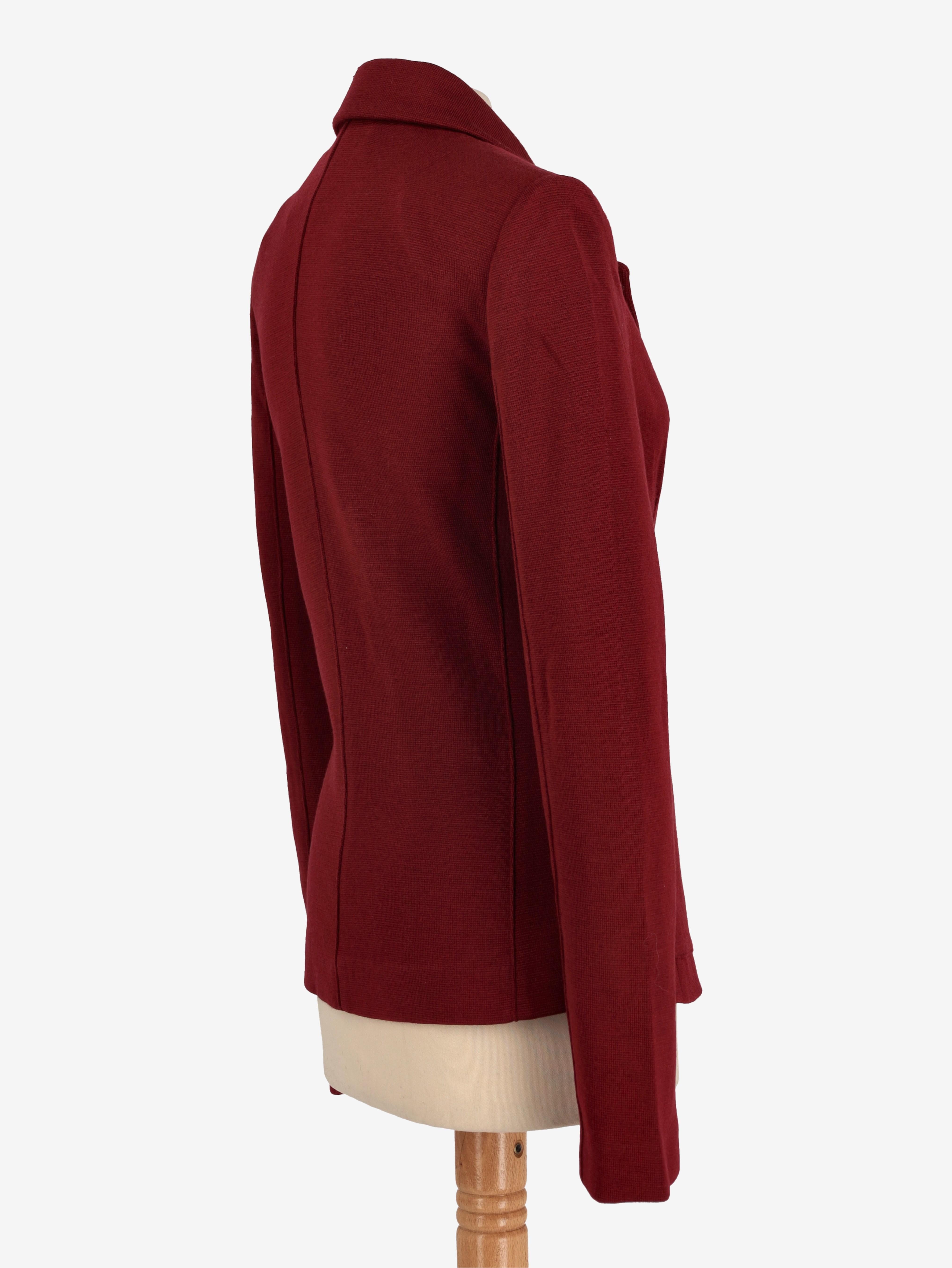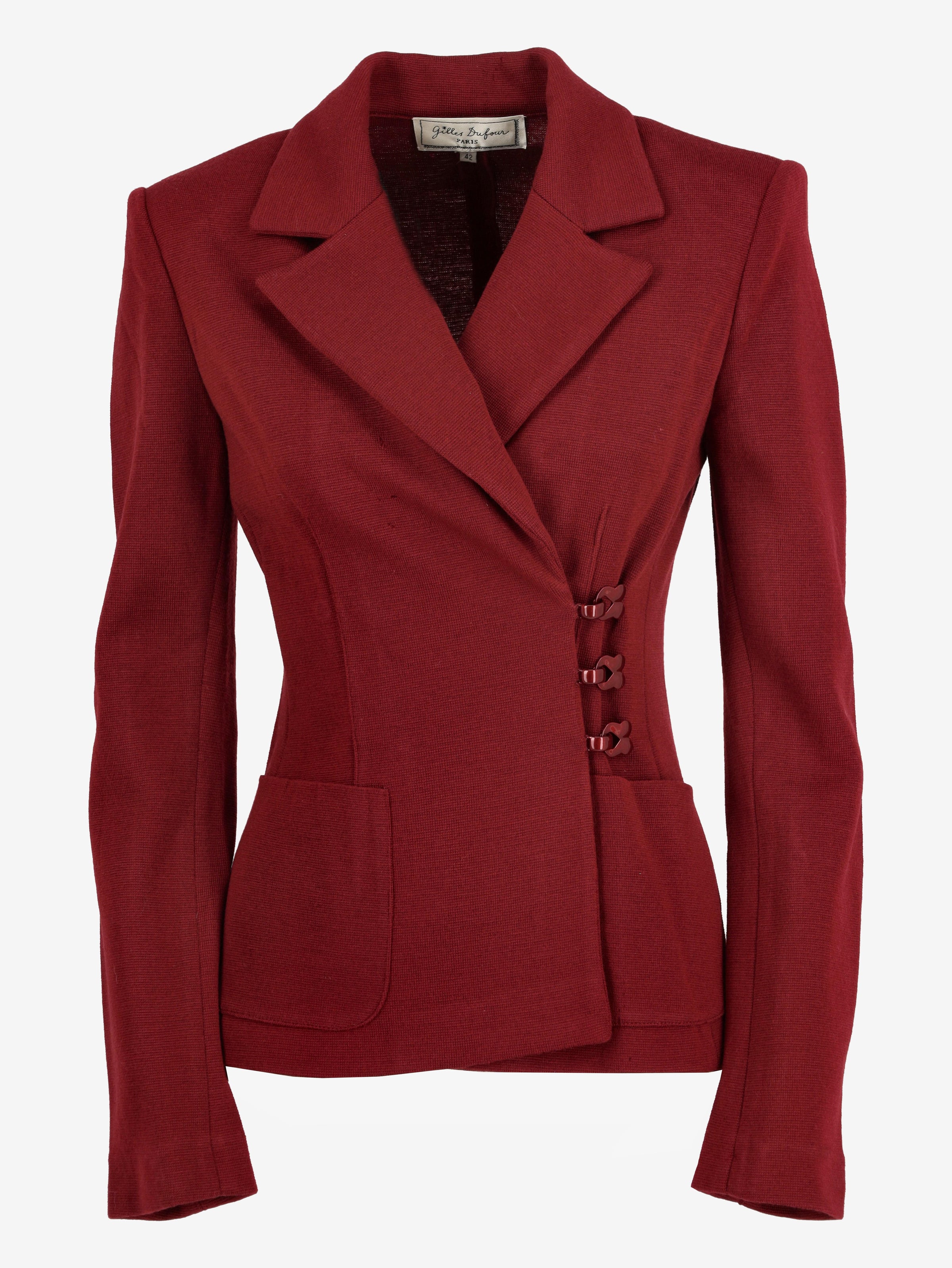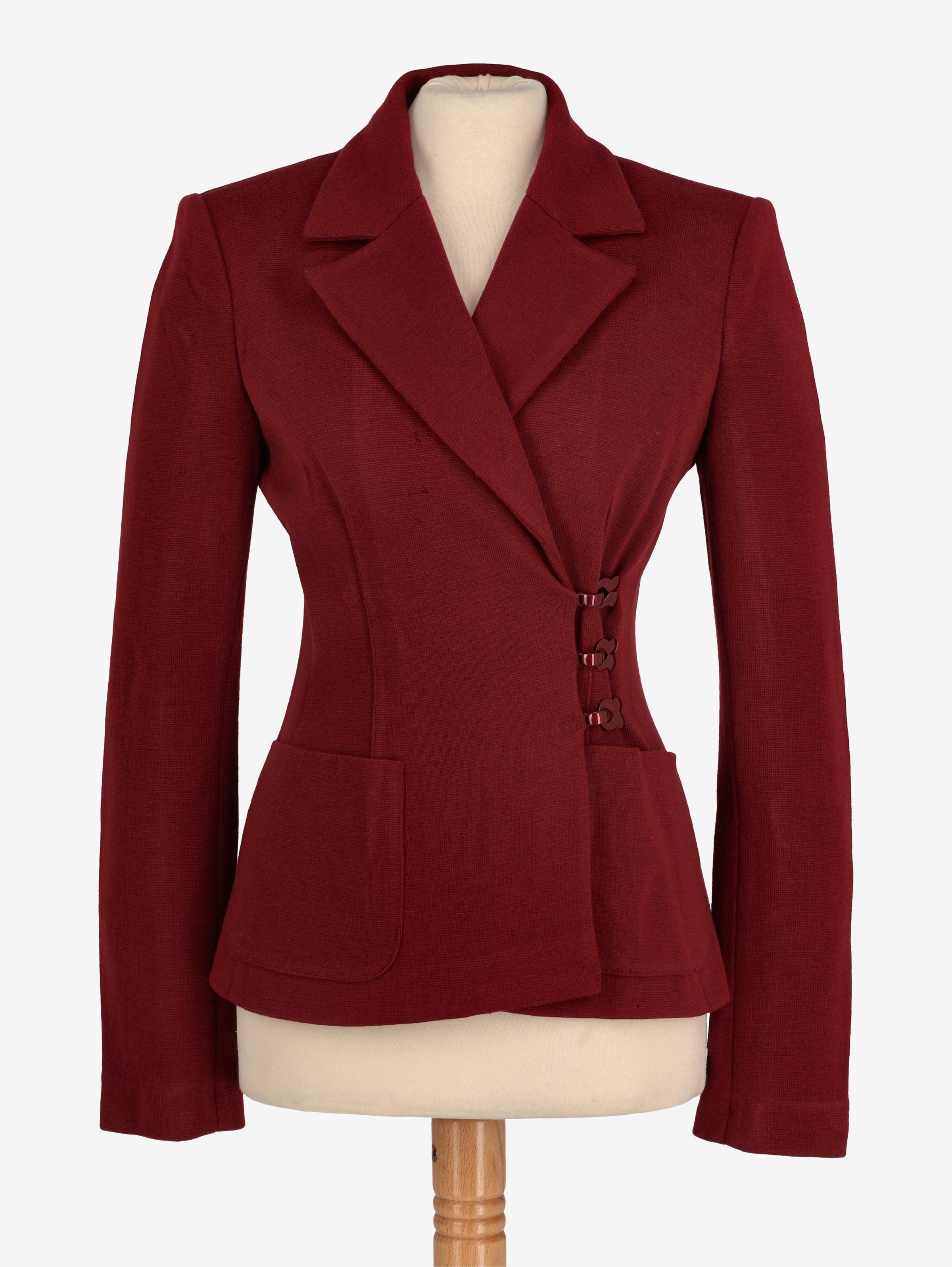 Gilles Dufour Tailored Wool Jacket. This jacket features a structured silhouette with a wide notched lapel and a fitted cut, complemented by decorative side hook fastenings and front patch pockets.