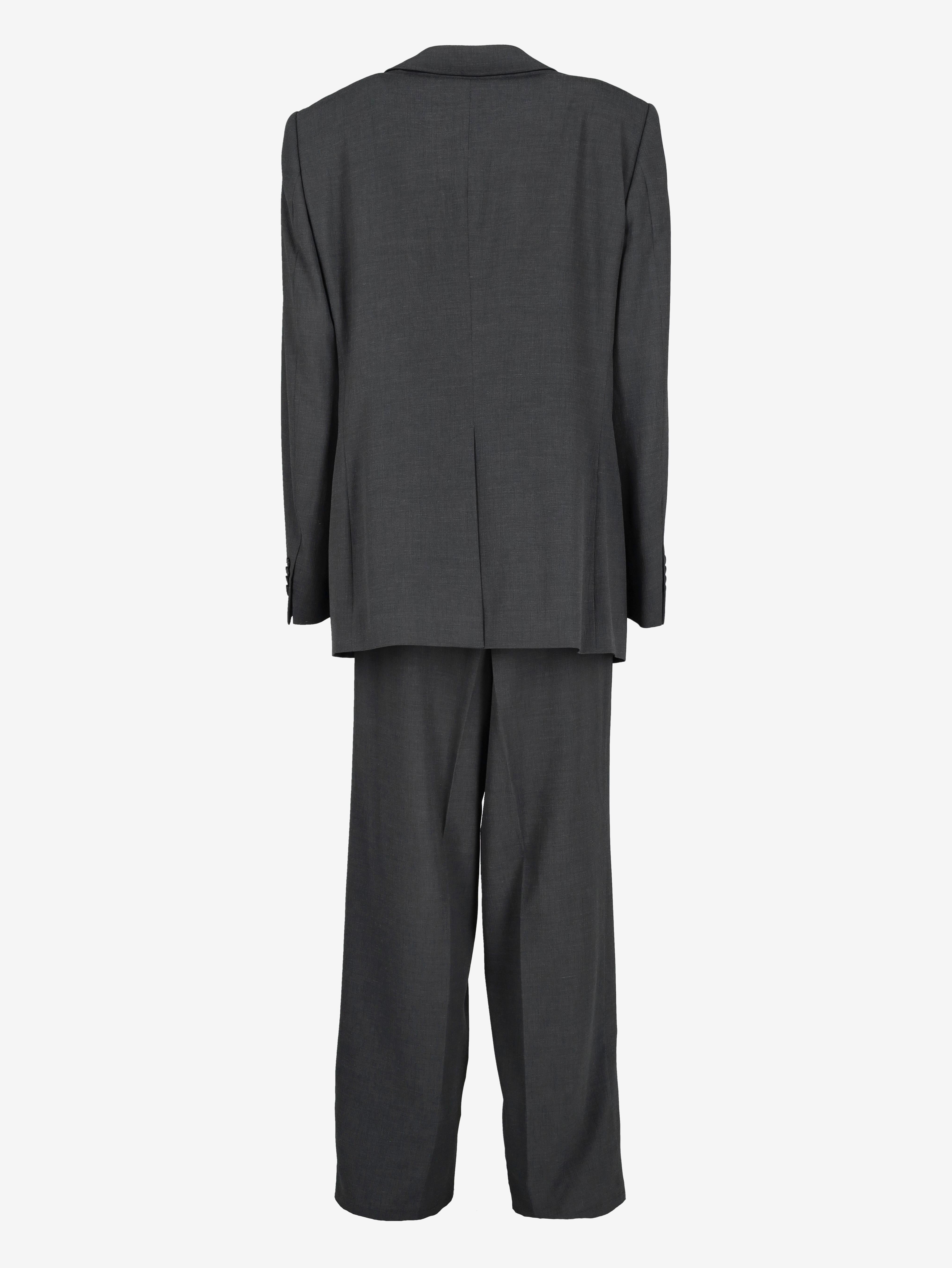 Emporio Armani Elegant Suit. This suit consists of a jacket with front pockets, a button closure, and a classic collar, paired with classic trousers featuring belt loops.