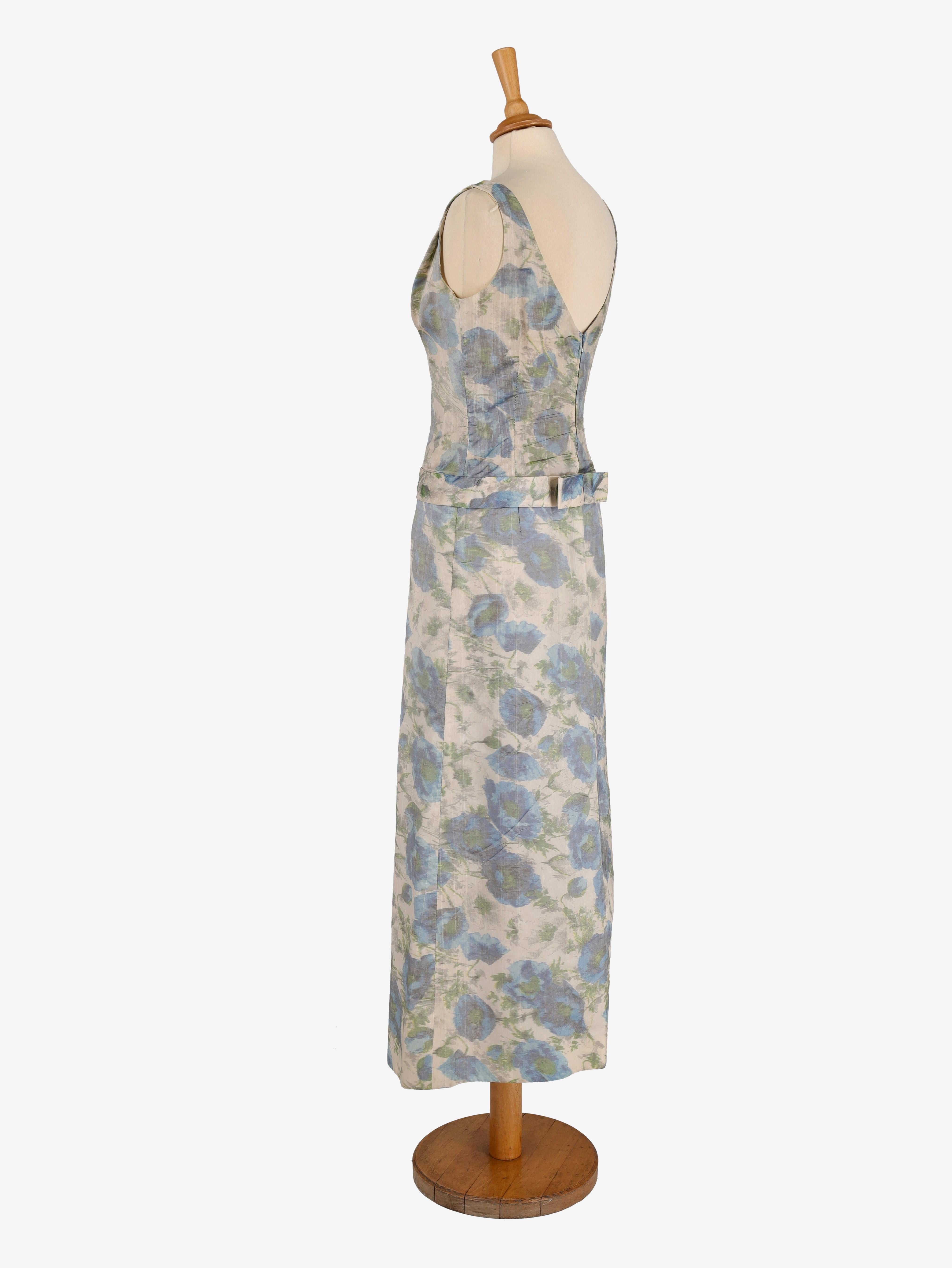 Vintage Flower Patterned Dress. This sleeveless dress features a V-neckline and an all-over floral pattern. It has a straight, vintage-inspired silhouette, with a back zipper and a small bow detail.