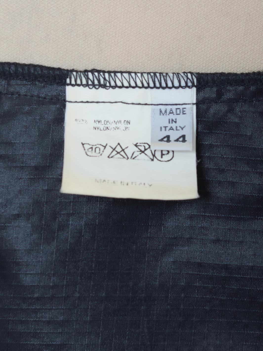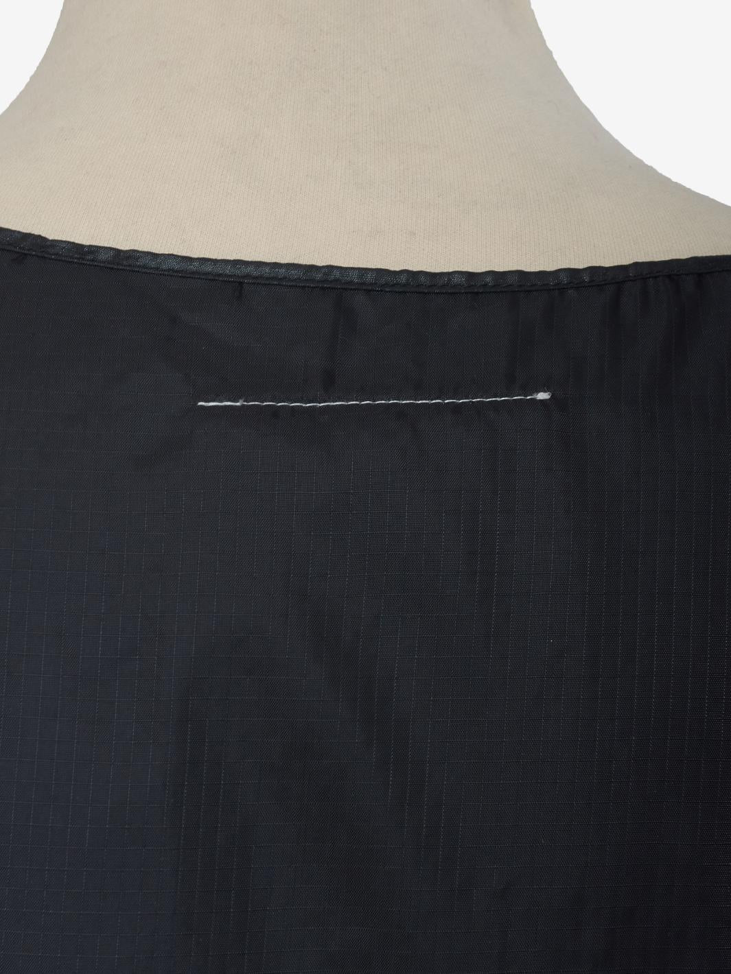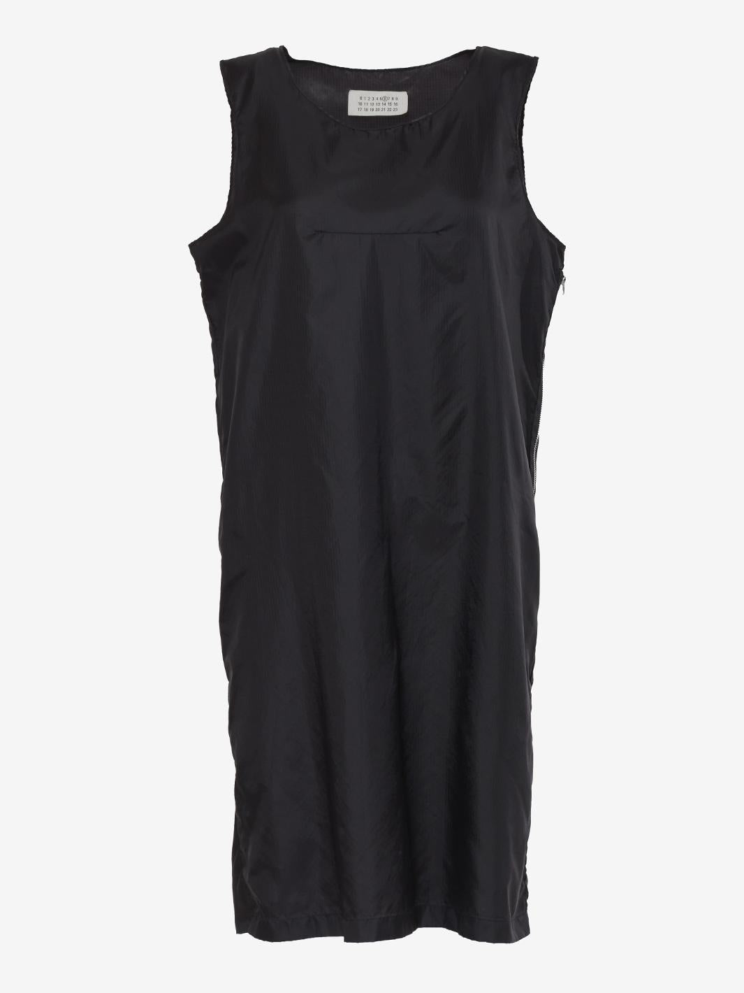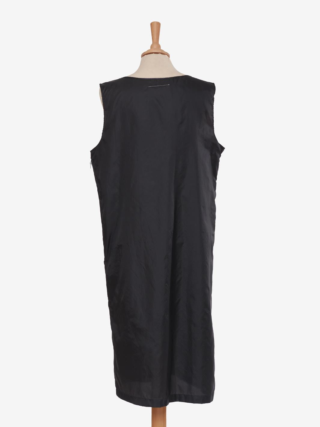 The design of this dress features a modern and elegant silhouette enhanced by the black nylon fabric. Nylon is a technical material that gives the dress a contemporary and experimental look, typical of Maison Margiela's innovative style.