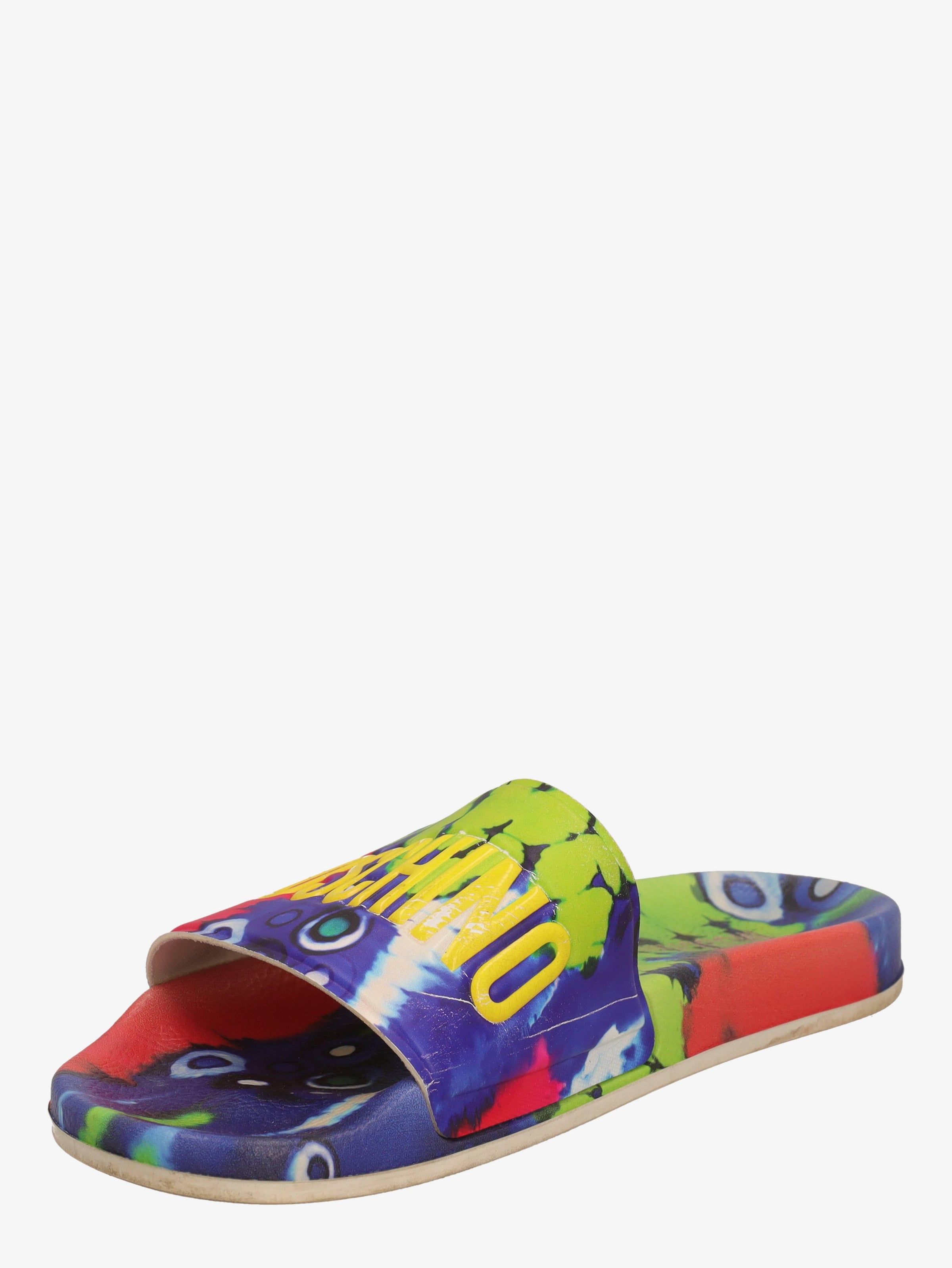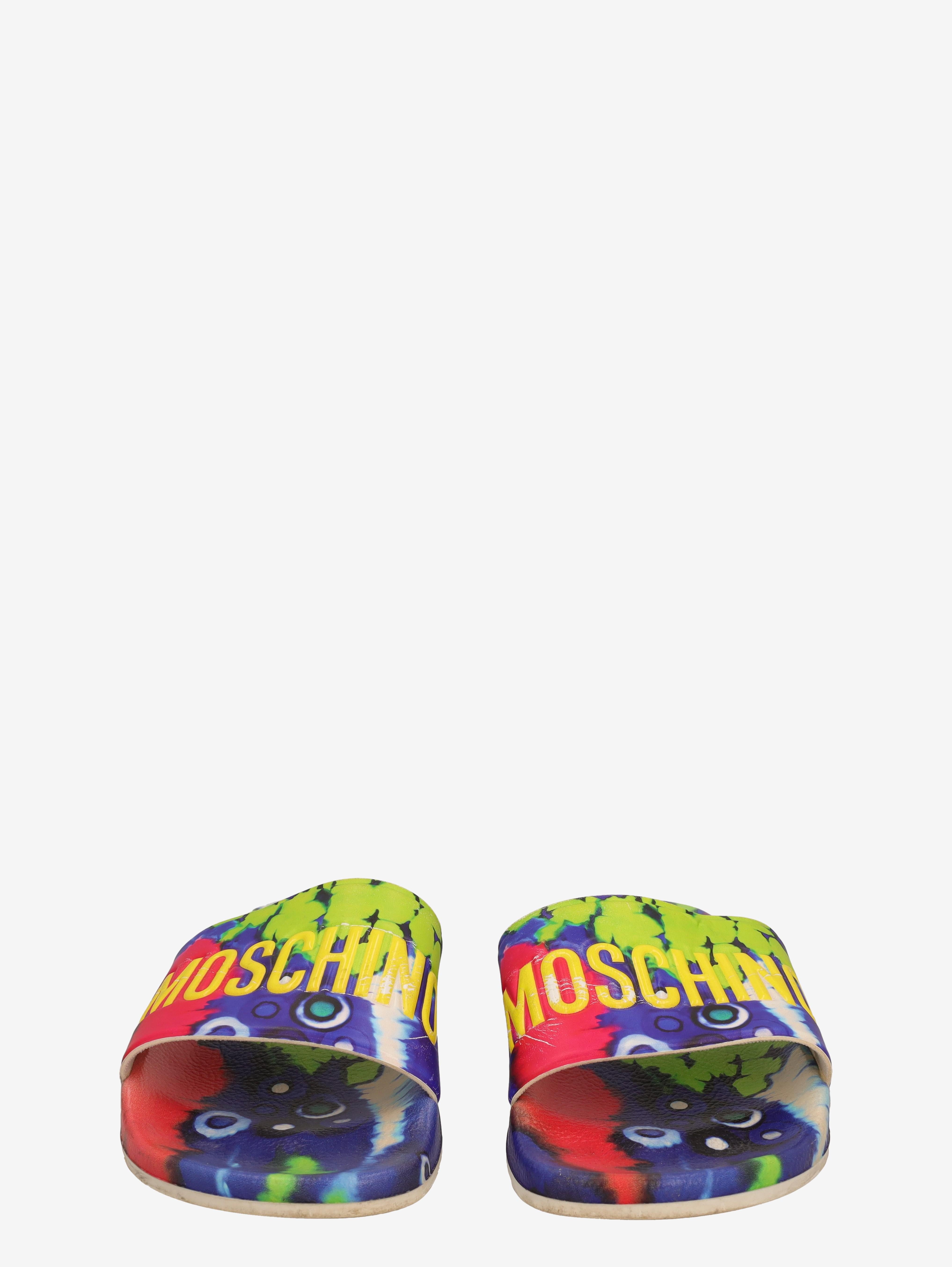 Moschino Tie-Dye Slippers. Theese slippers feature the Moschino logo on the front. There are signs of use.