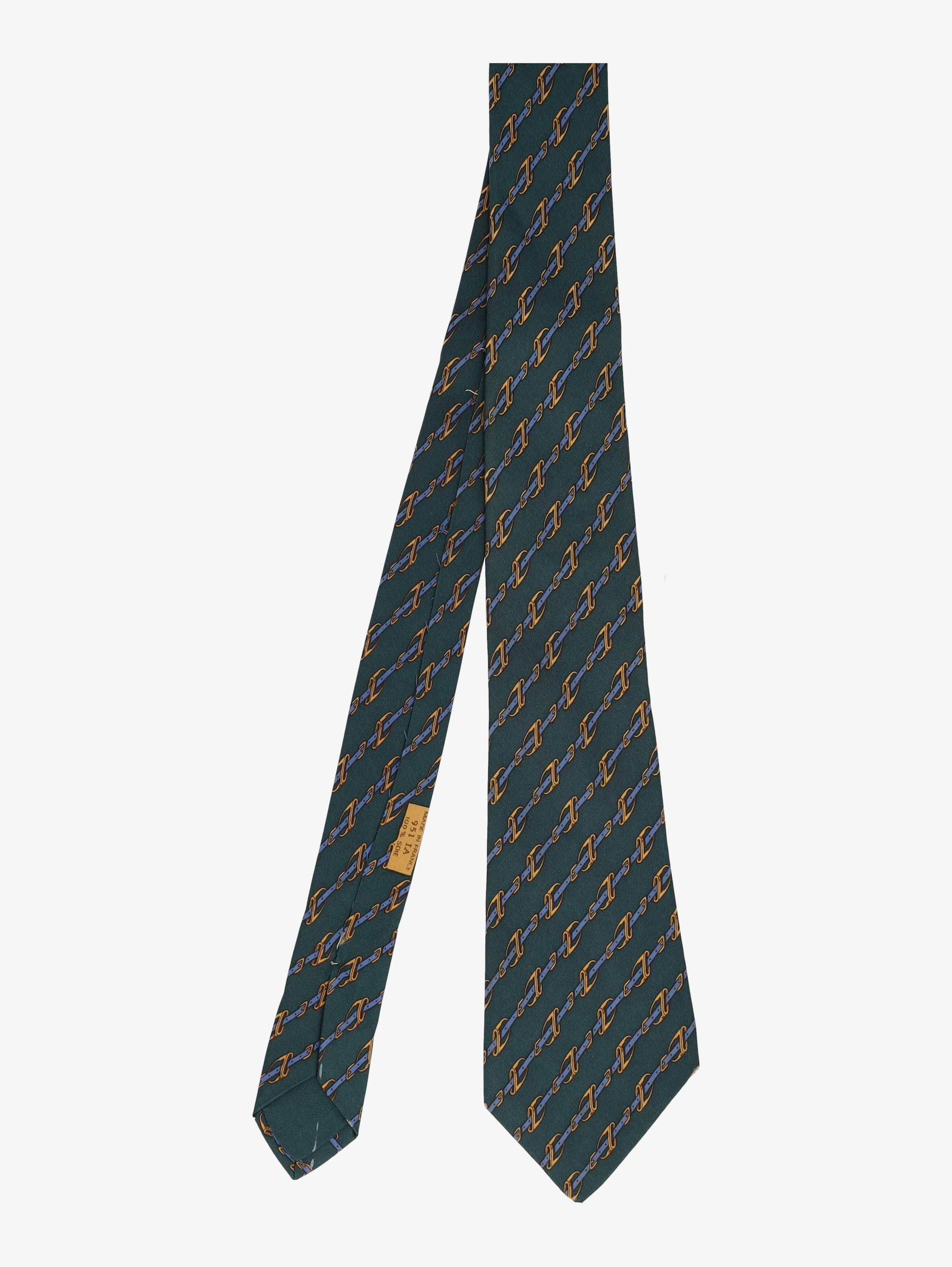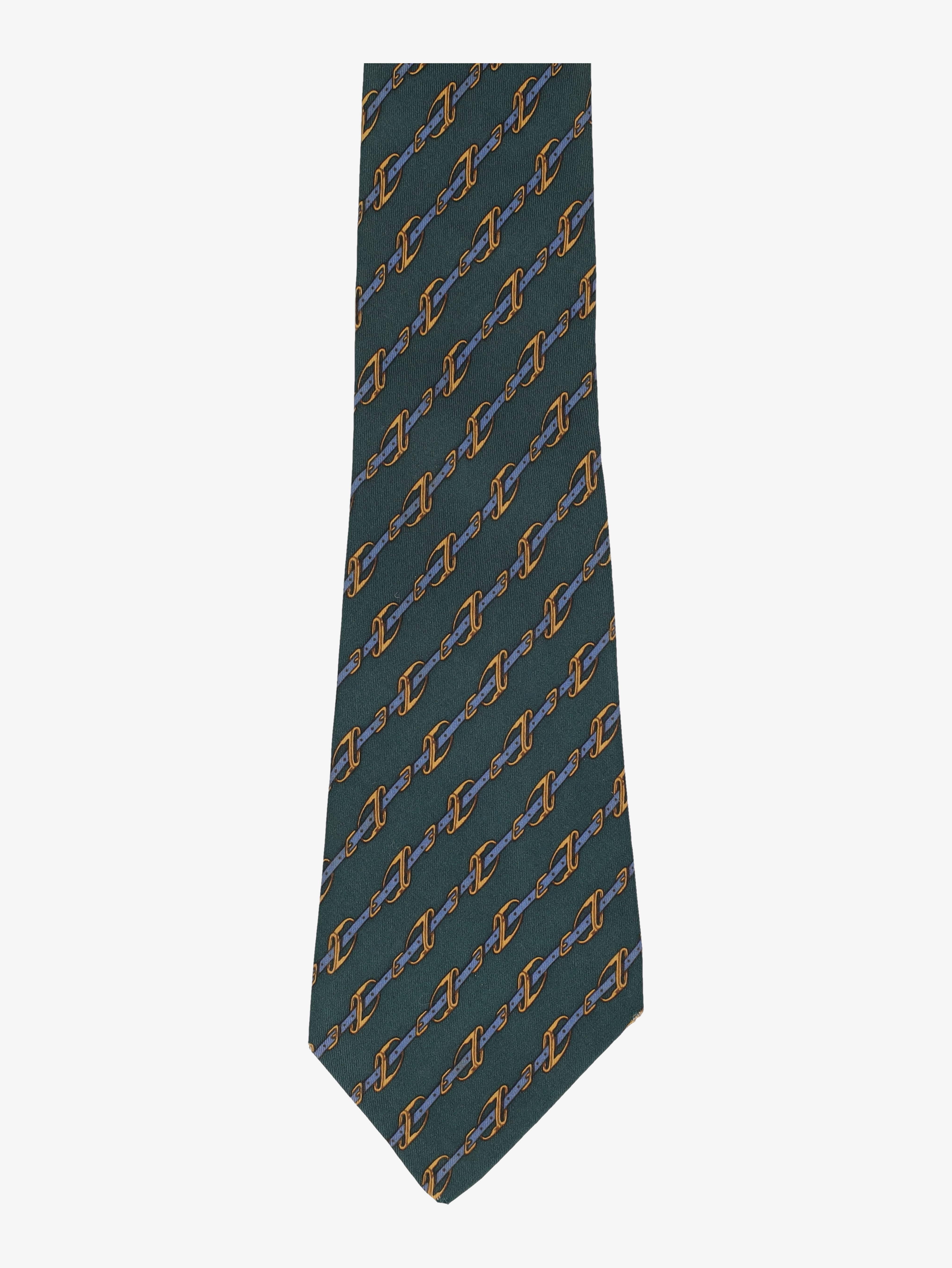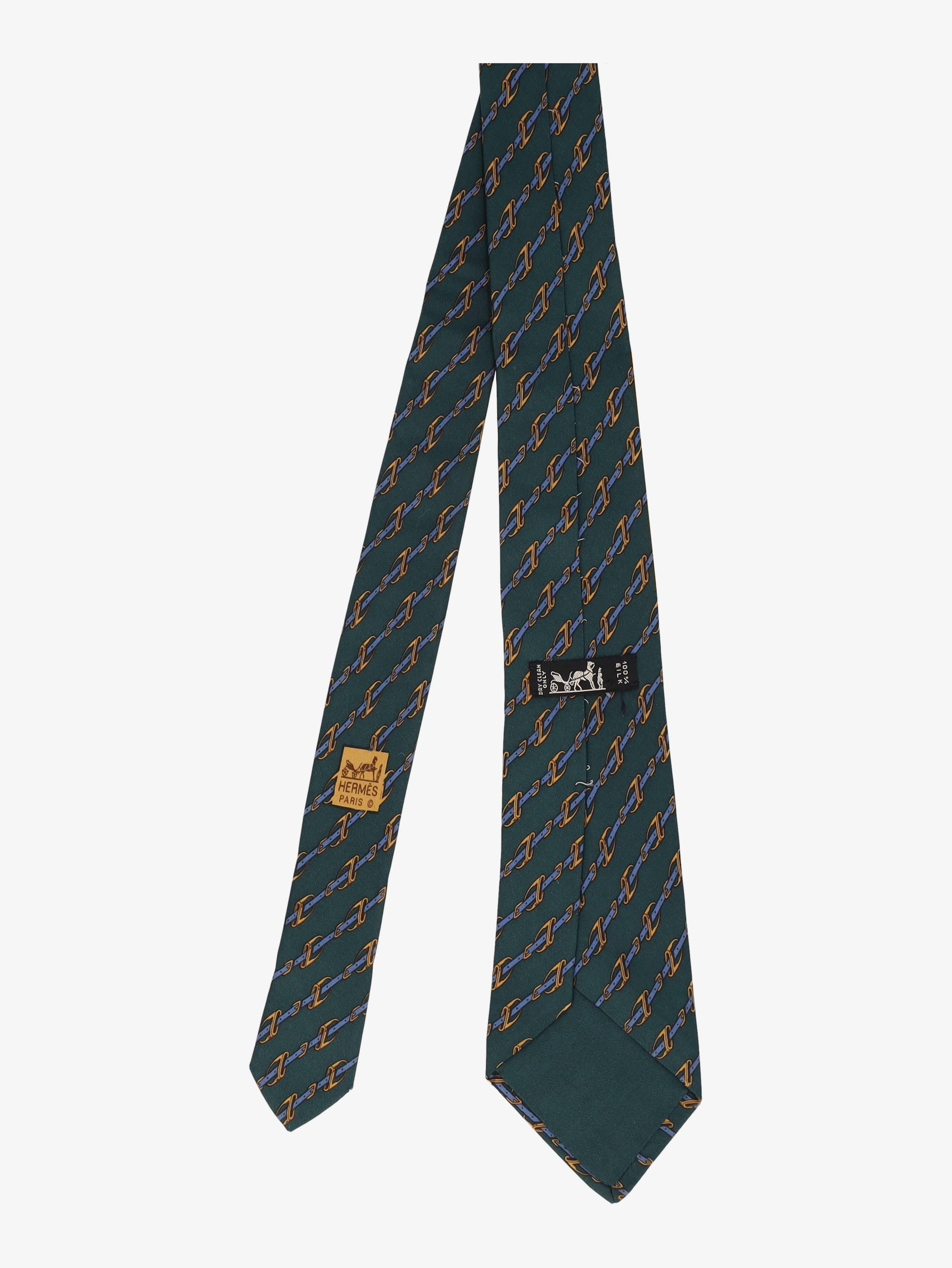 Hermès Horsebit Print Tie. This tie features a horsebit motif with gold-colored rings connected by blue bands on a dark green background.