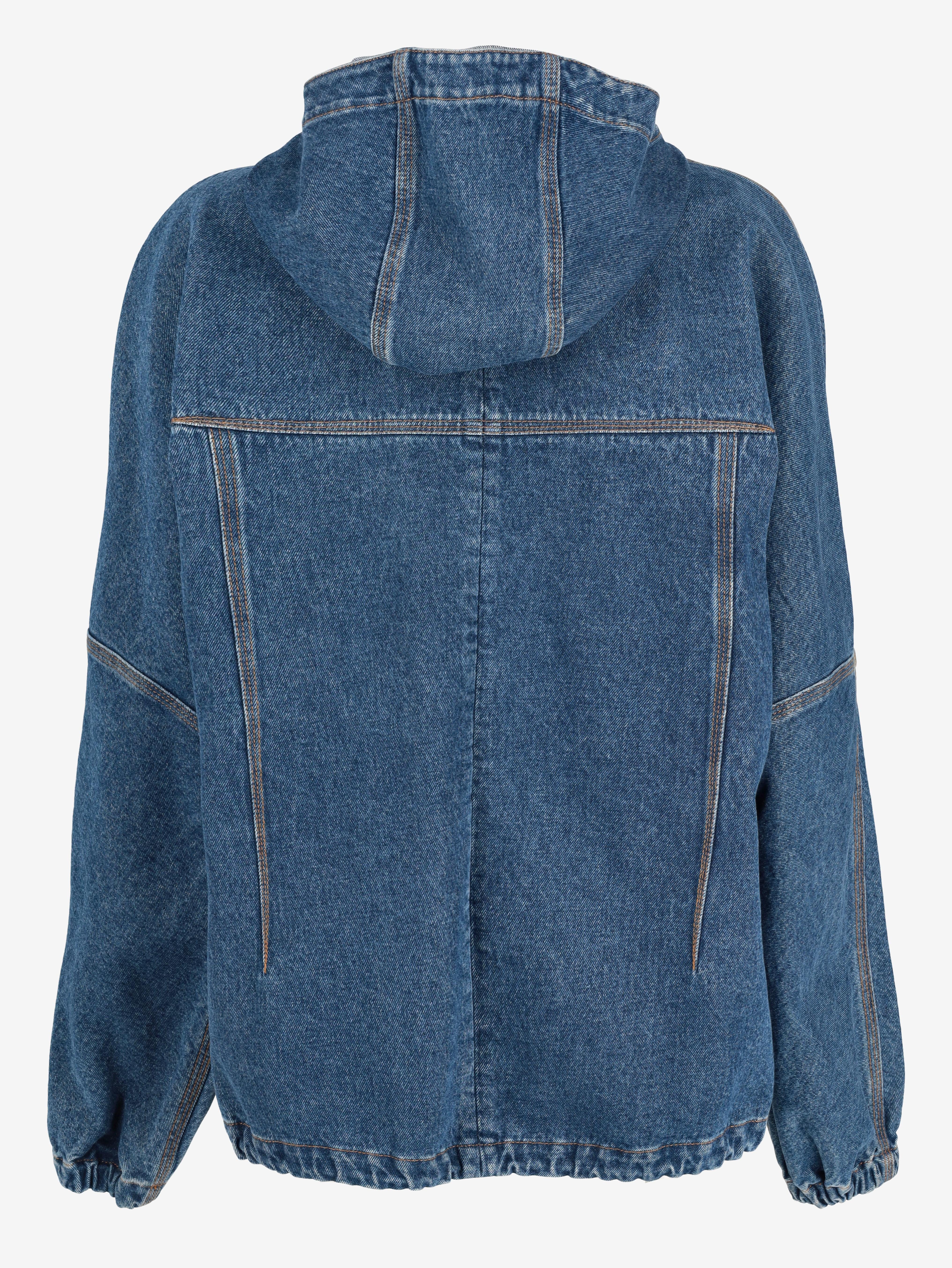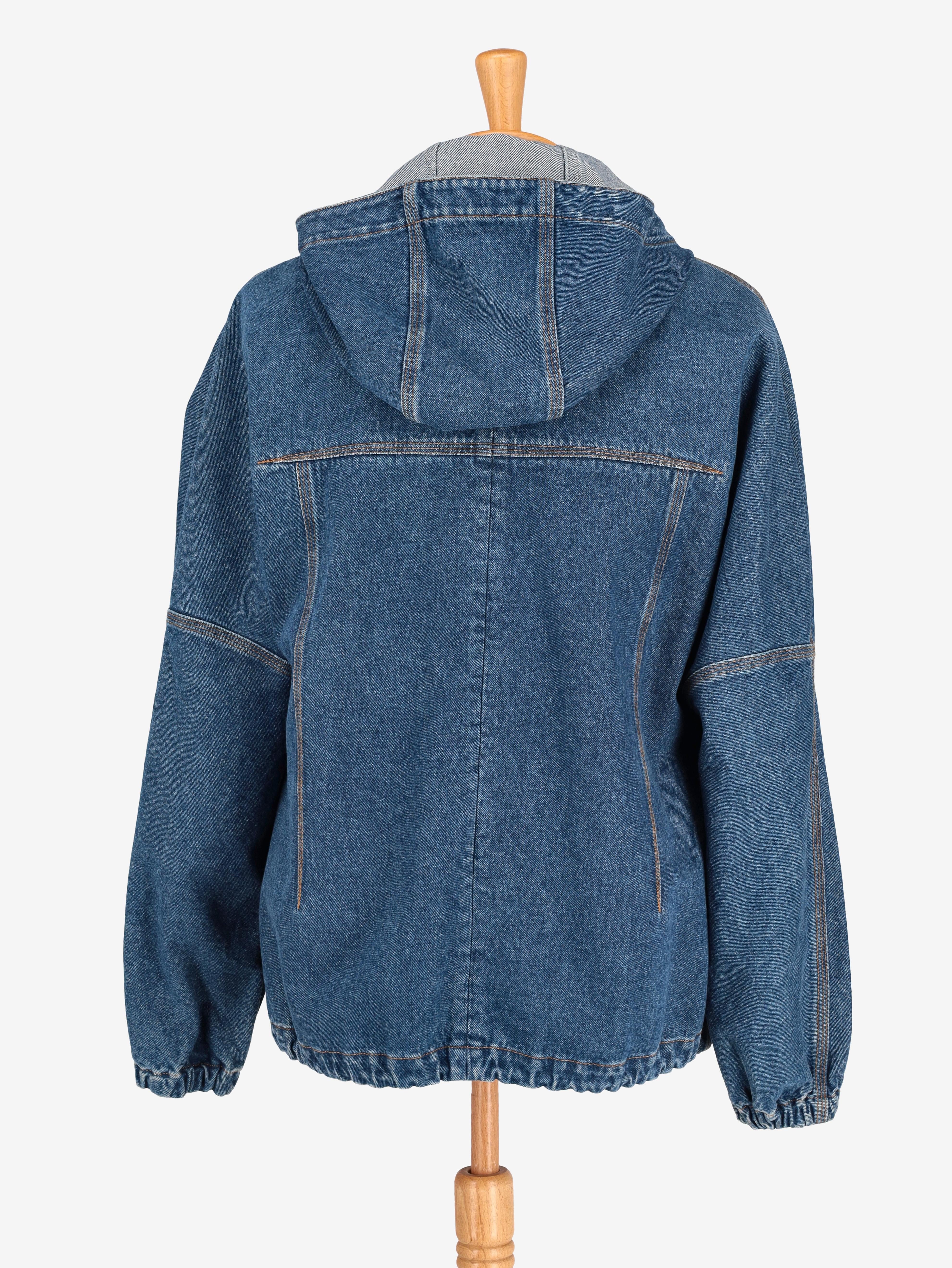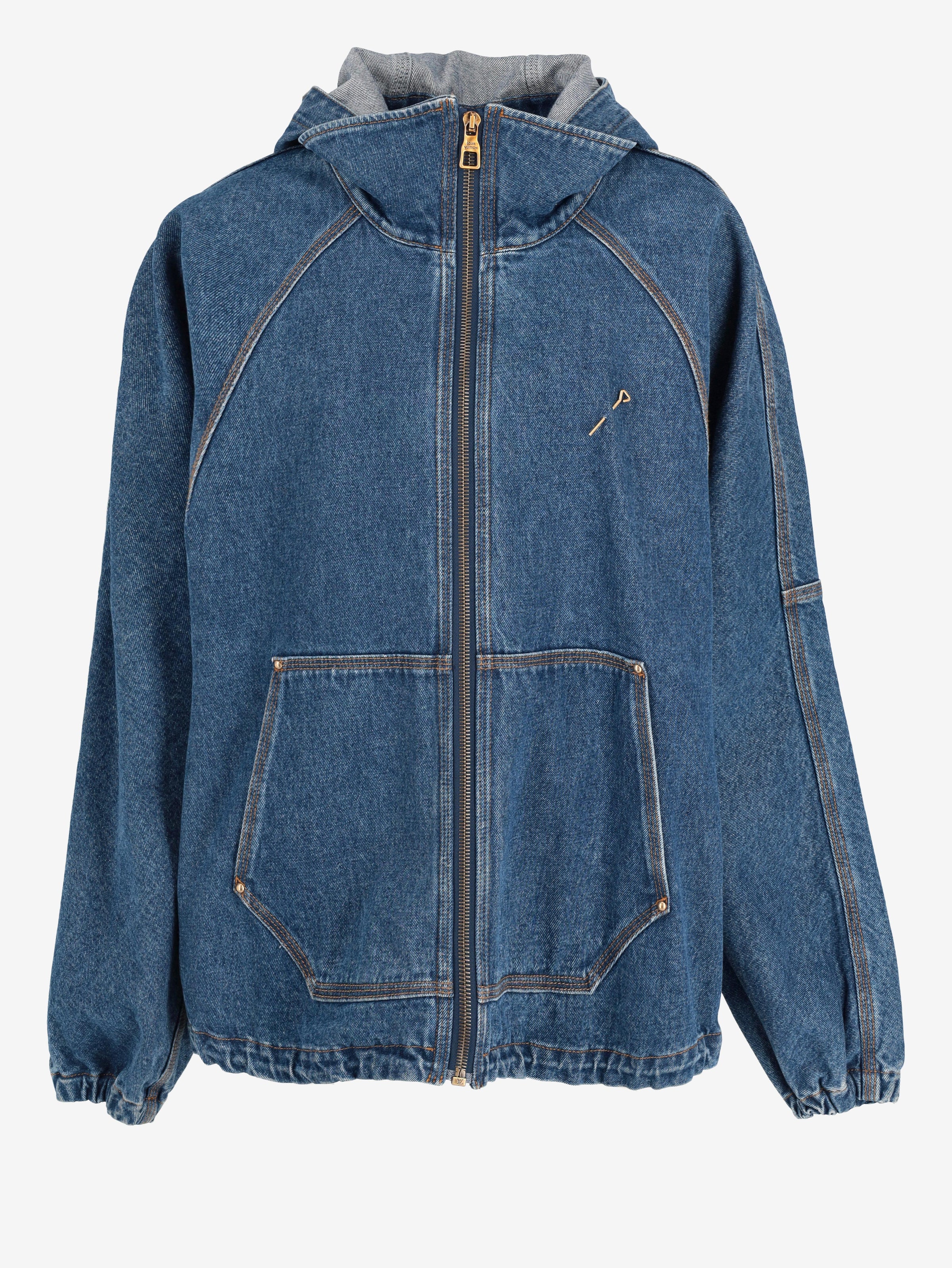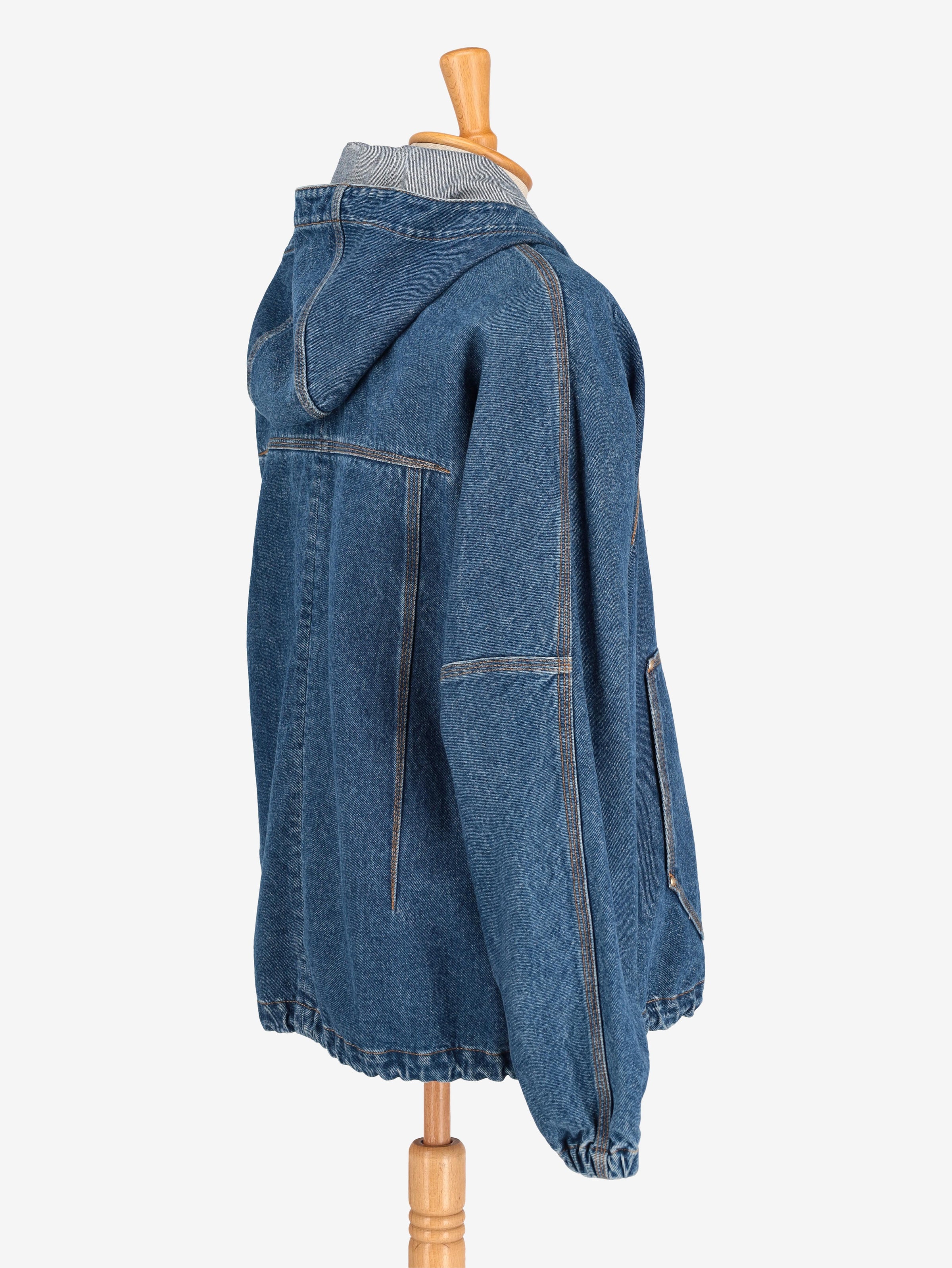Louis Vuitton Jeans Jacket. This denim jacket has a relaxed fit and features a zip fastening, a removable hood, a classic collar, and front pockets. The sleeves are gathered at the cuffs for a slightly tapered finish, and the hem is adjustable for a customizable fit.