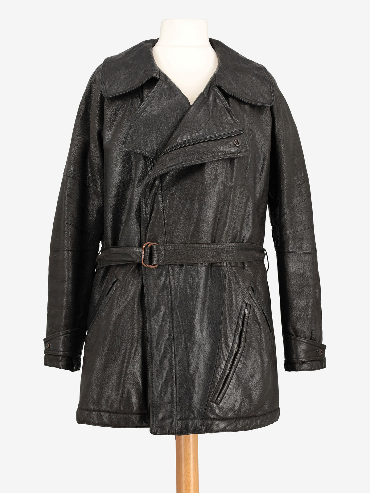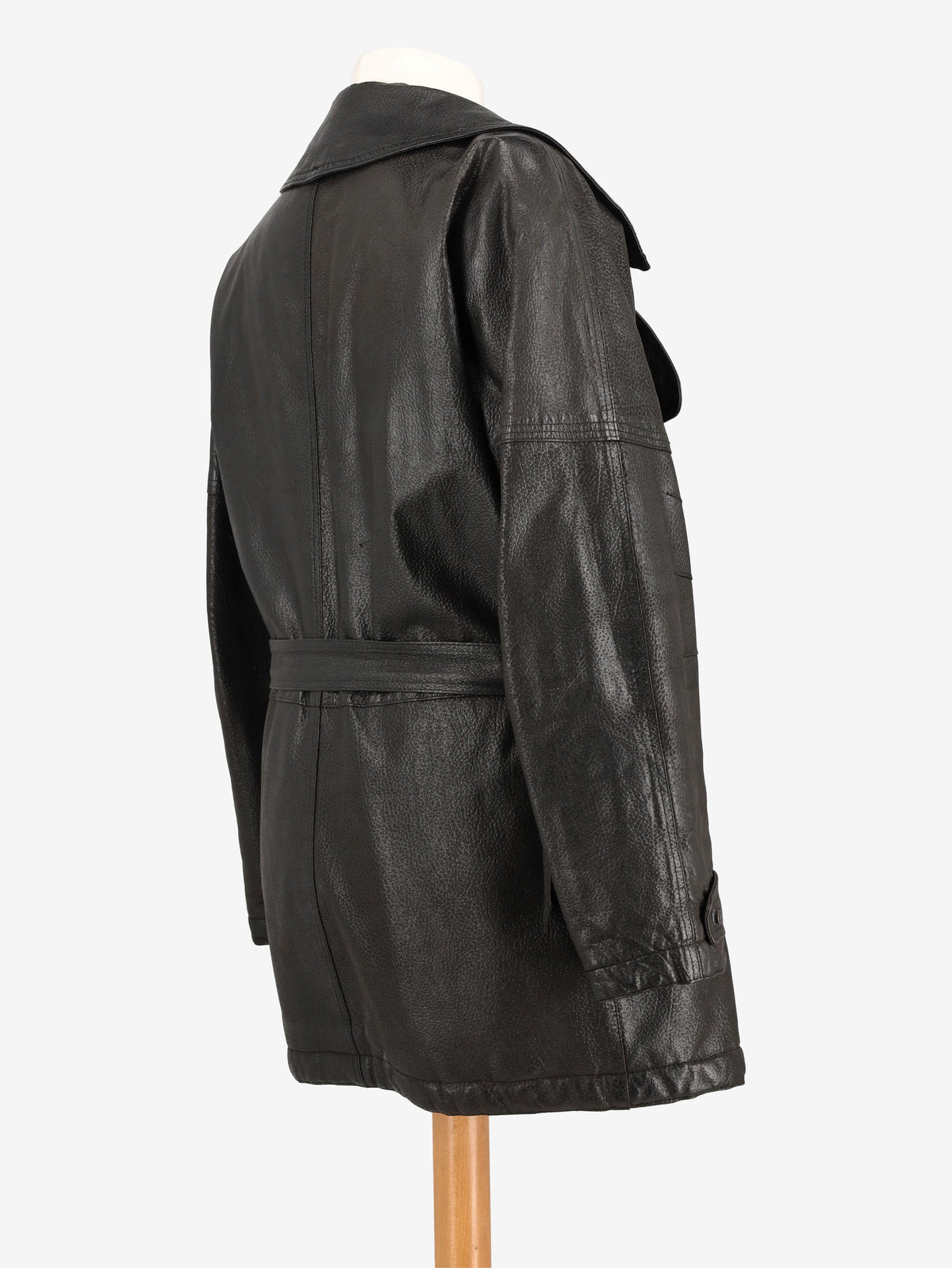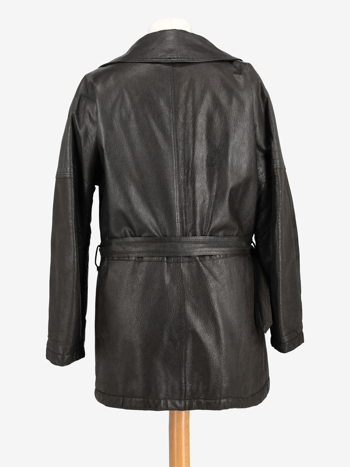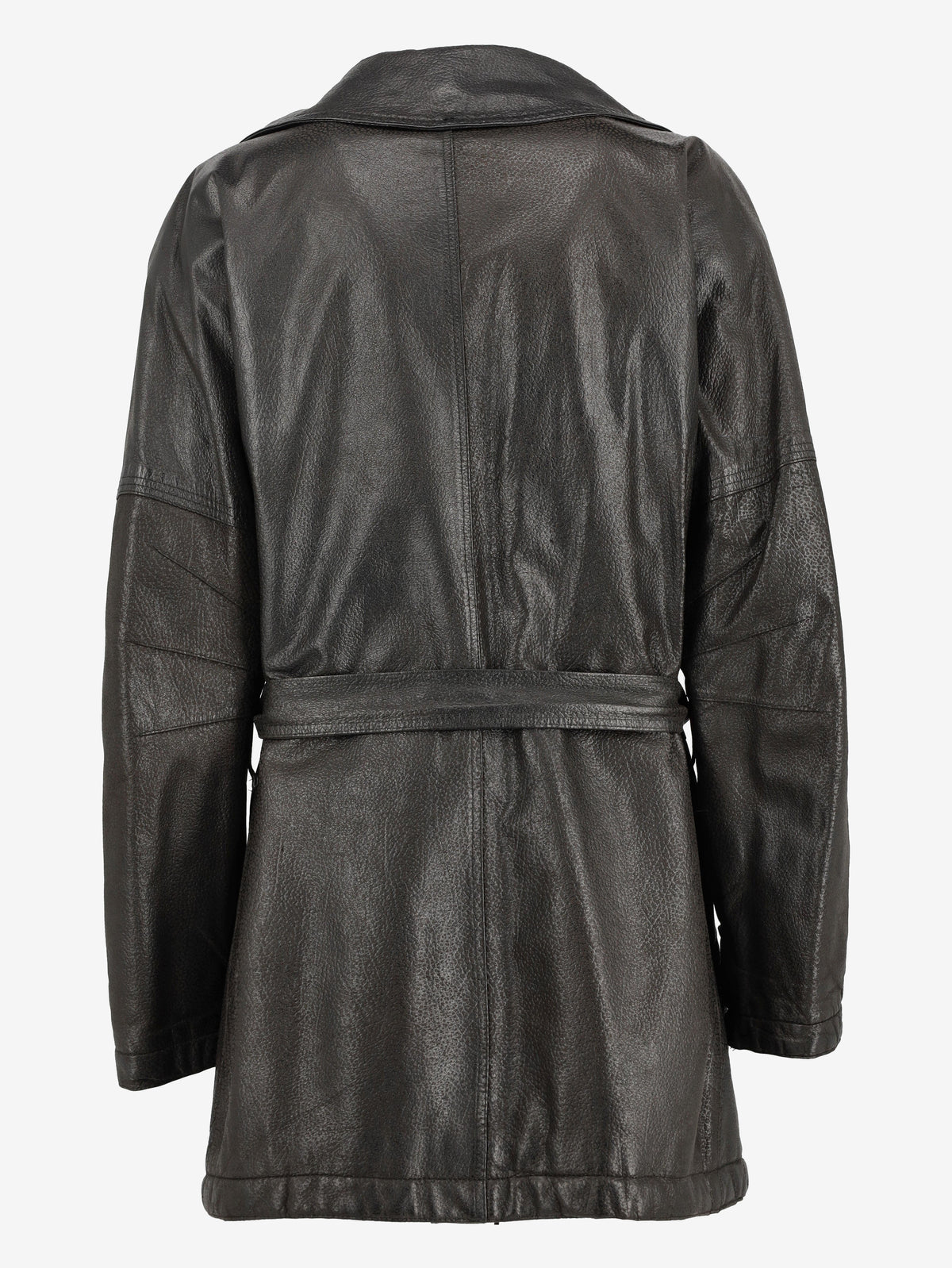 Gianfranco Ferrè Leather Jacket is a long leather jacket with two front pockets, zipper and button closure, faux fur lining and waist belt.