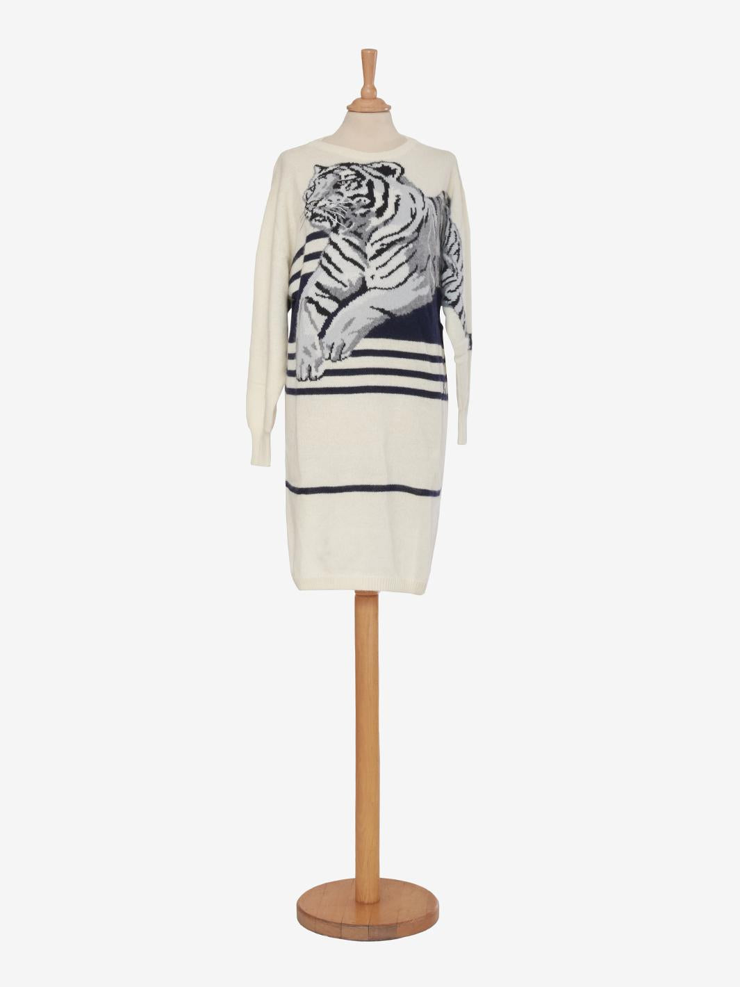 The Krizia wool midi-length dress with tiger embroidery is a fashion statement piece that blends the elegance and warm comfort of wool with a touch of boldness and creativity inspired by wild nature.