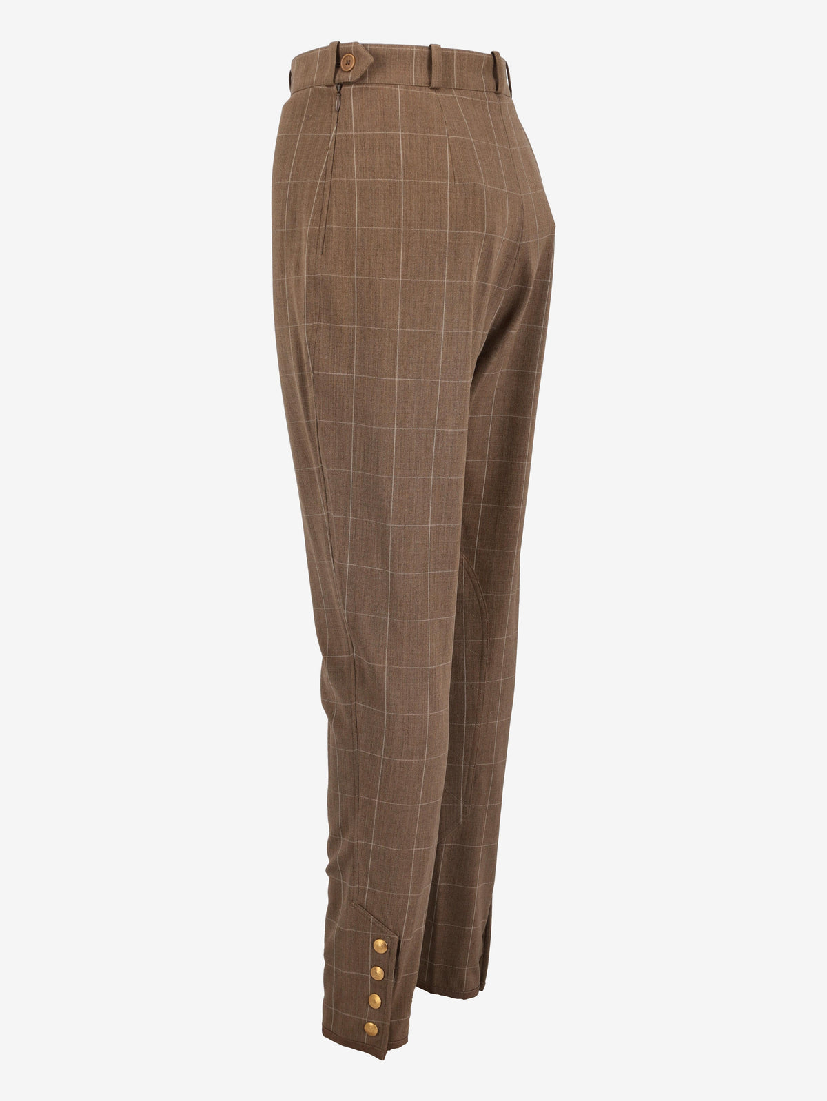 Hermès Checked Riding Trousers is a pair of riding trousers with a brown-coloured checked pattern, gold logo buttons on the ankle, zip and side button fastening and belt loops. Wear and tear on lower leg