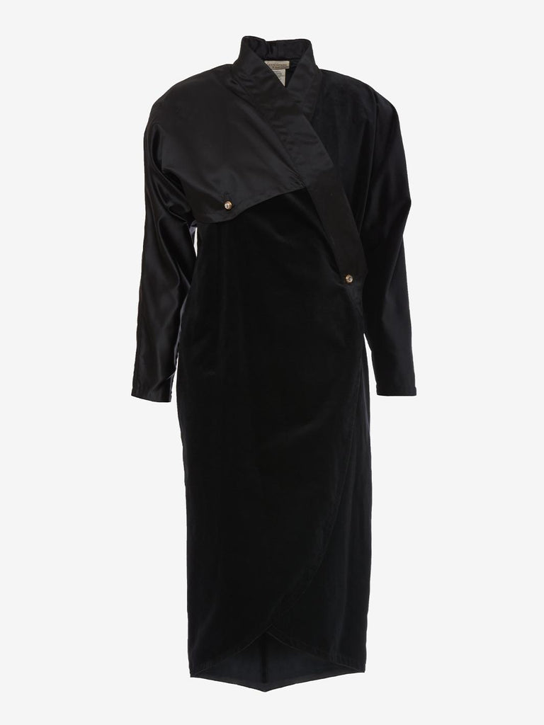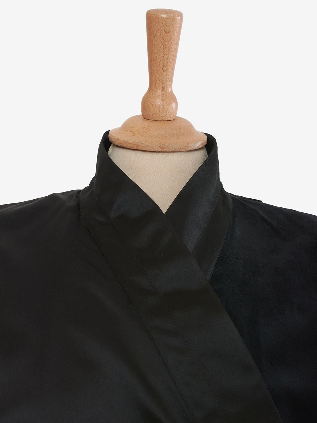 The right sleeve is made of silk, a fabric that is smooth and soft to the touch, while the left sleeve is made of cotton velvet, a fabric that is thicker and velvety to the touch. This contrast of textures gives depth and movement to the dress, creating a play of light and shadow that makes it even more interesting.