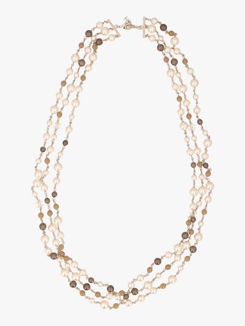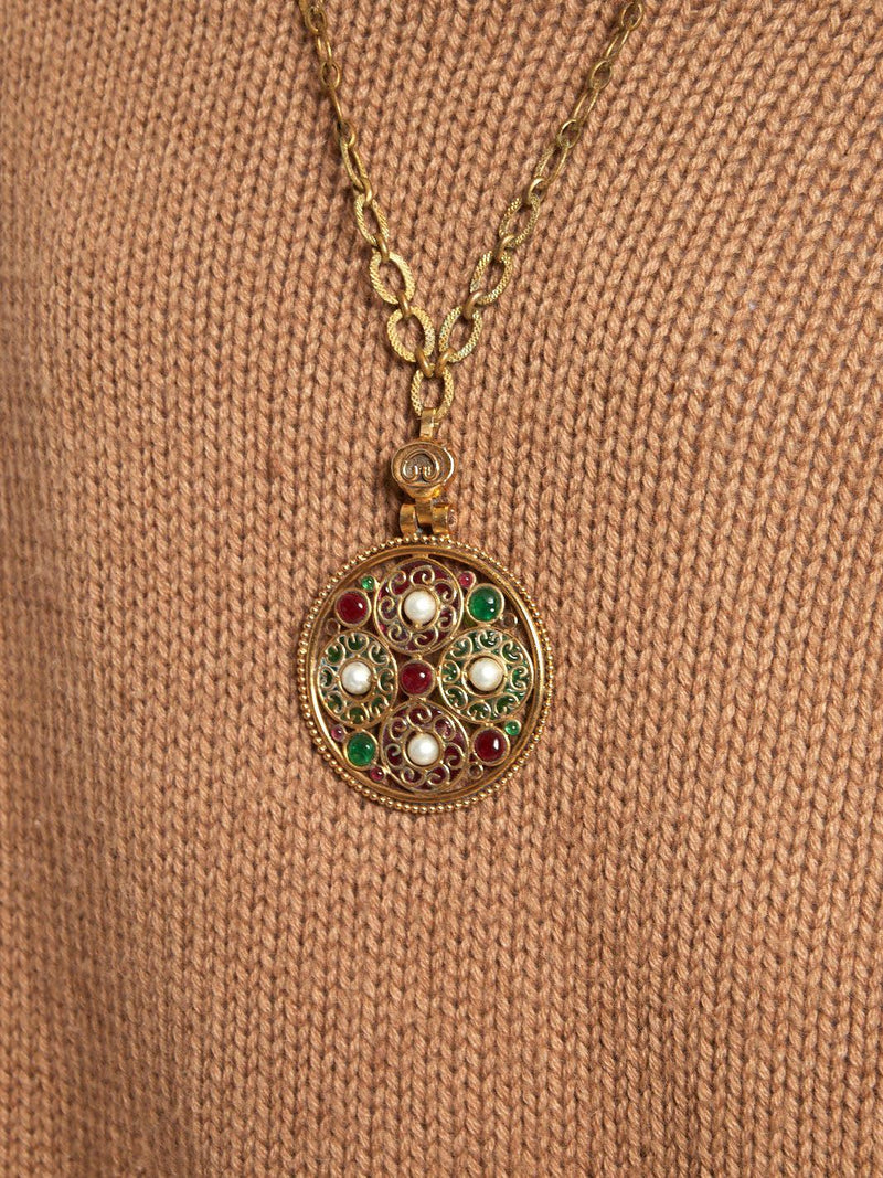 1960s Chanel glass paste medallion with pearls and long golden chain