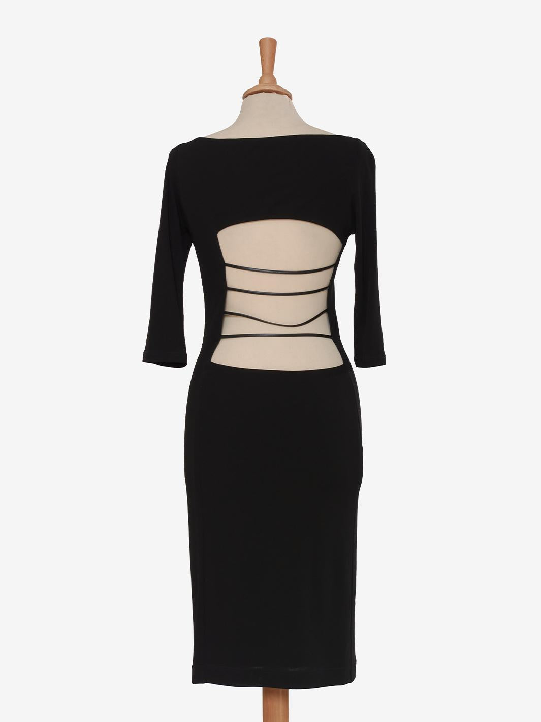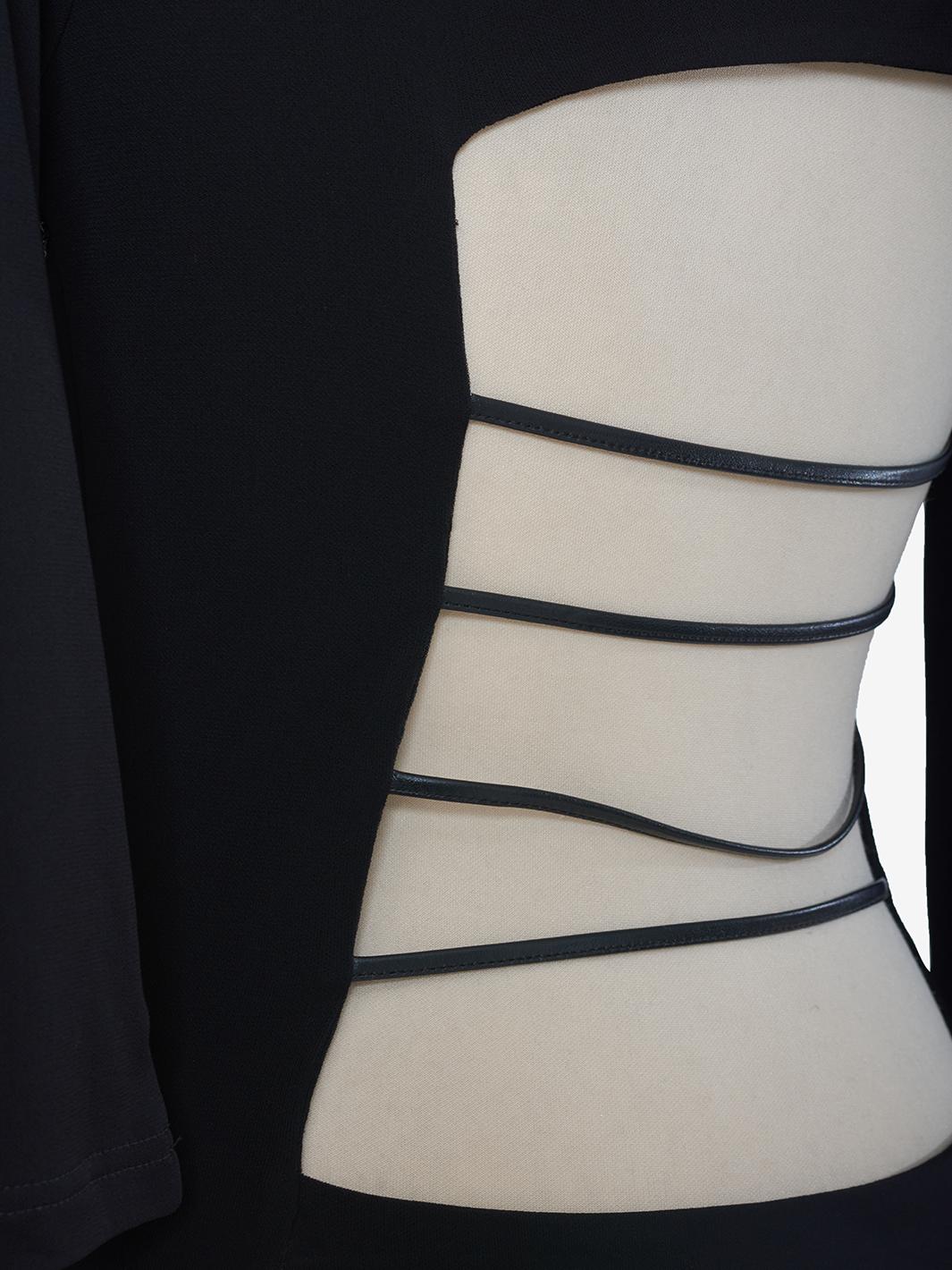 The design of this dress features a modern and provocative silhouette, enhanced by the back opening and leather lace insertion. The black fabric creates an atmosphere of elegance and mystery, while the leather laces add a touch of sensuality and rebellion to the dress.