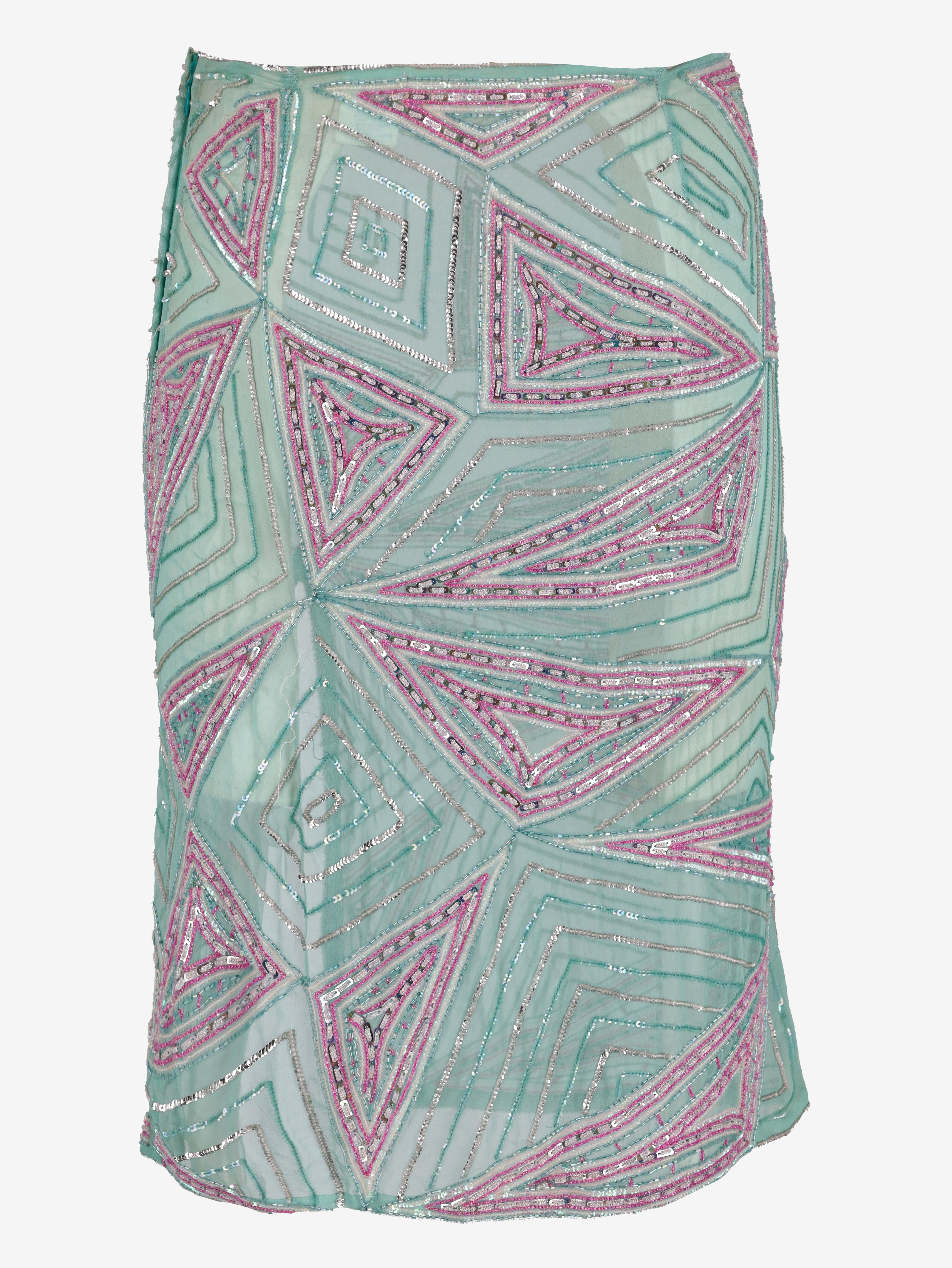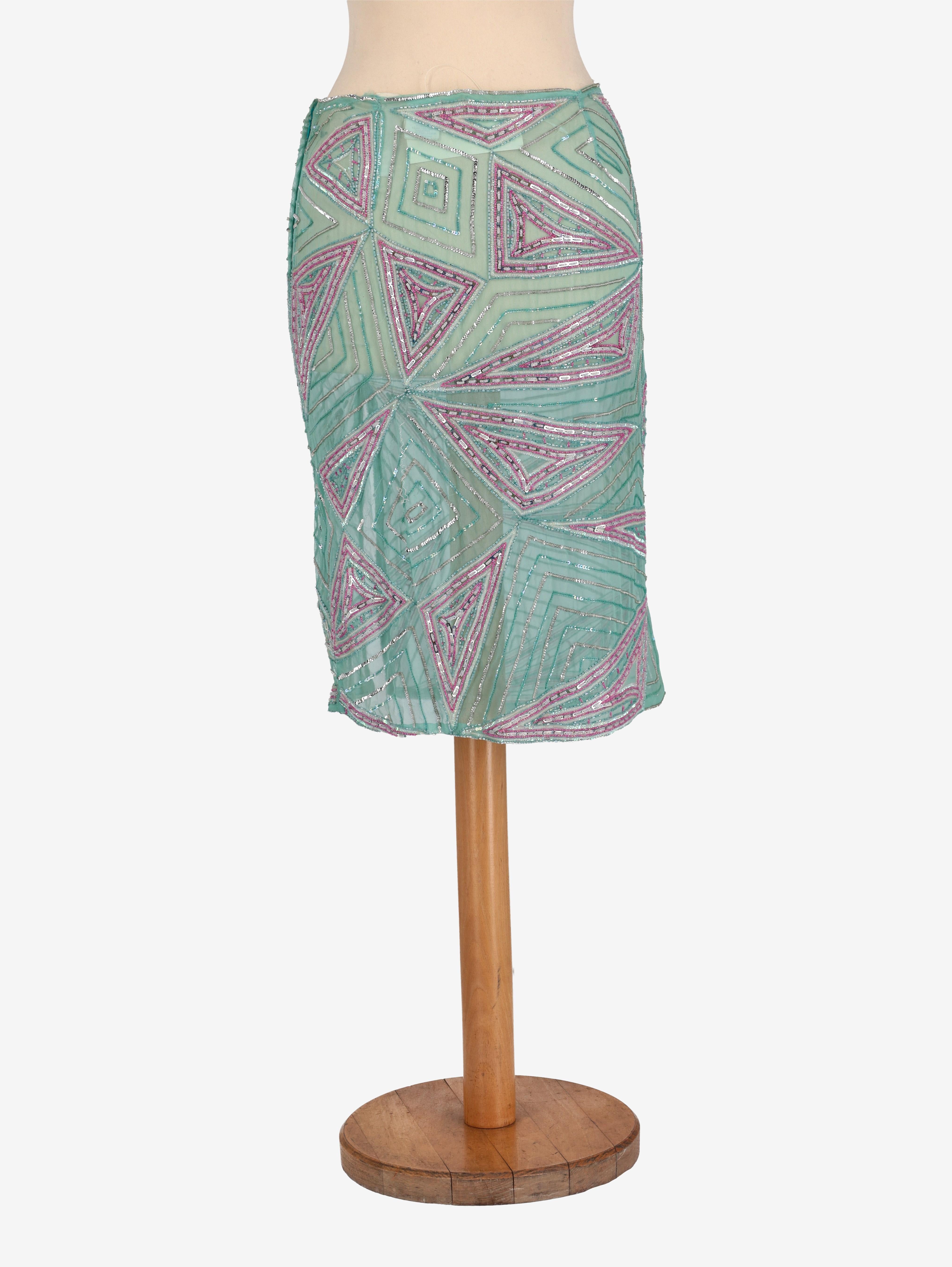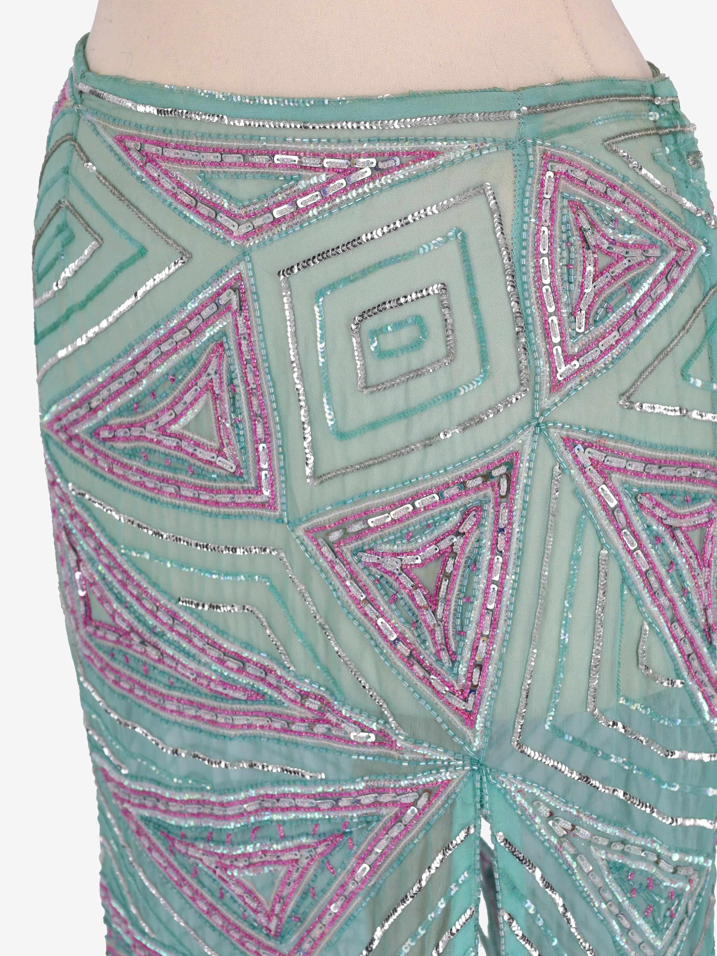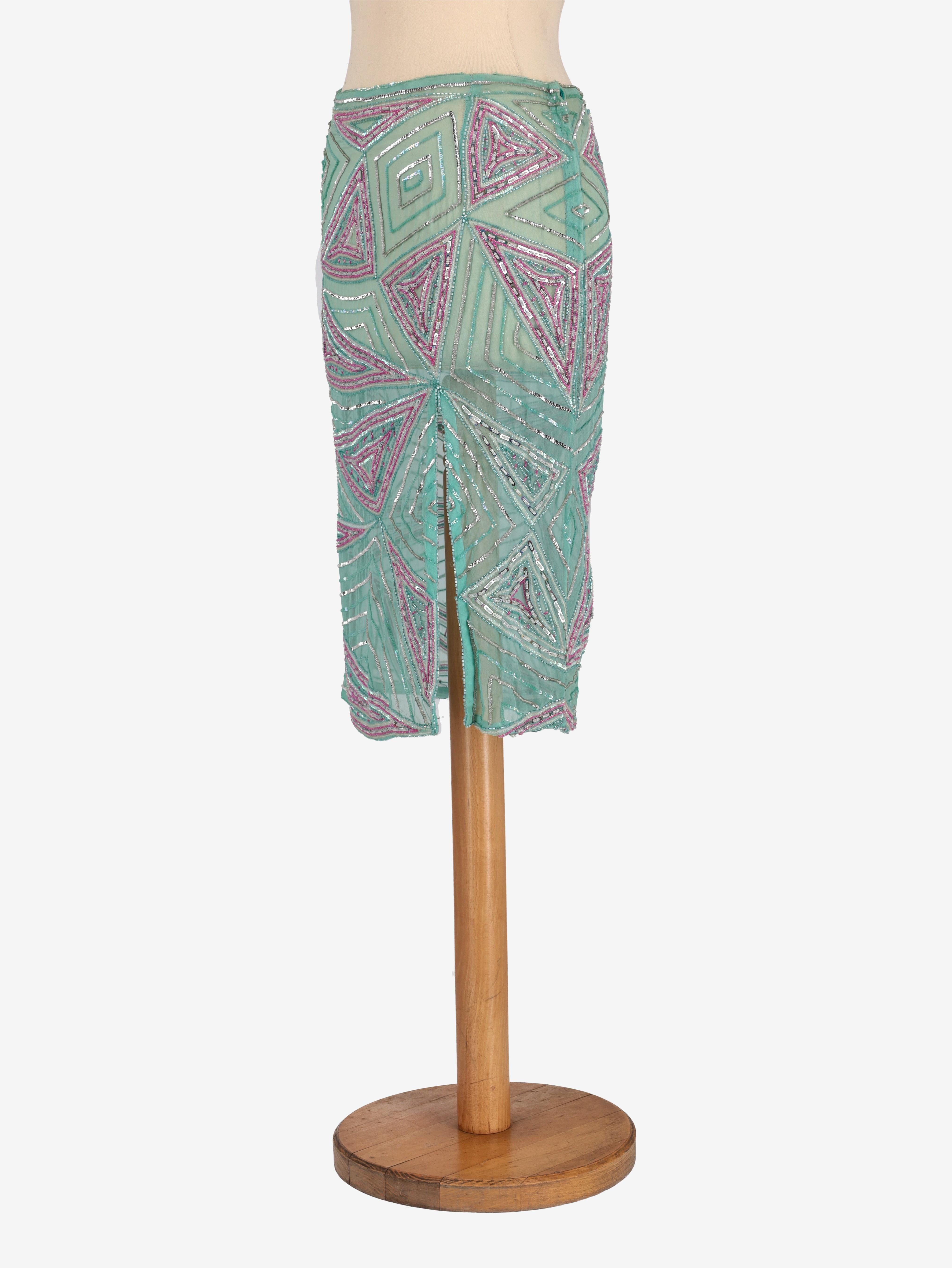 Gonna ricamata Julien Macdonald. Questa gonna è di media lunghezza e ricamata con cristalli di vetro e poliestere che creano un motivo geometrico. Presenta uno spacco sul davanti e una chiusura laterale con cerniera.