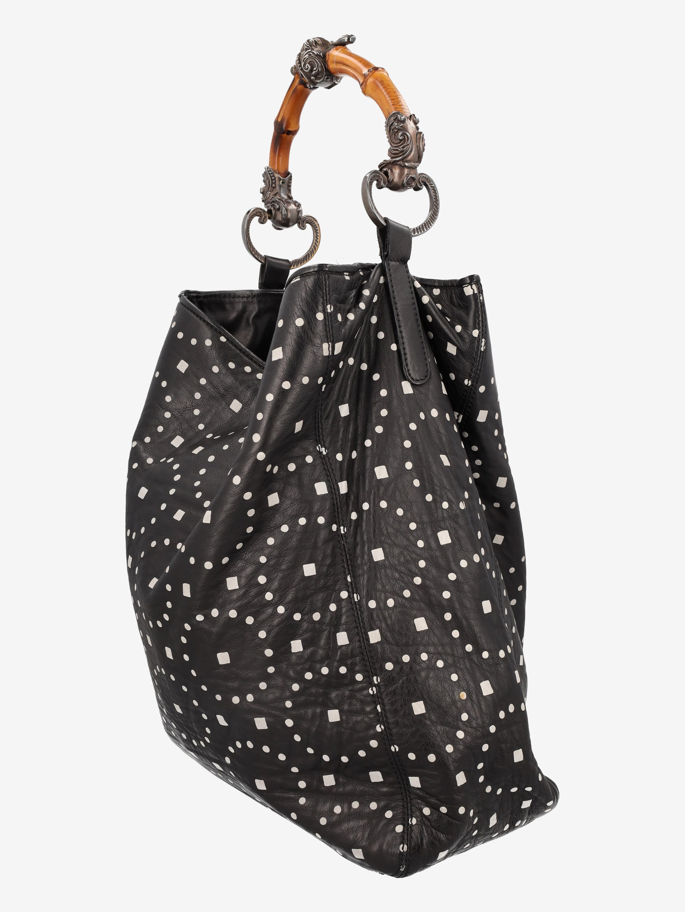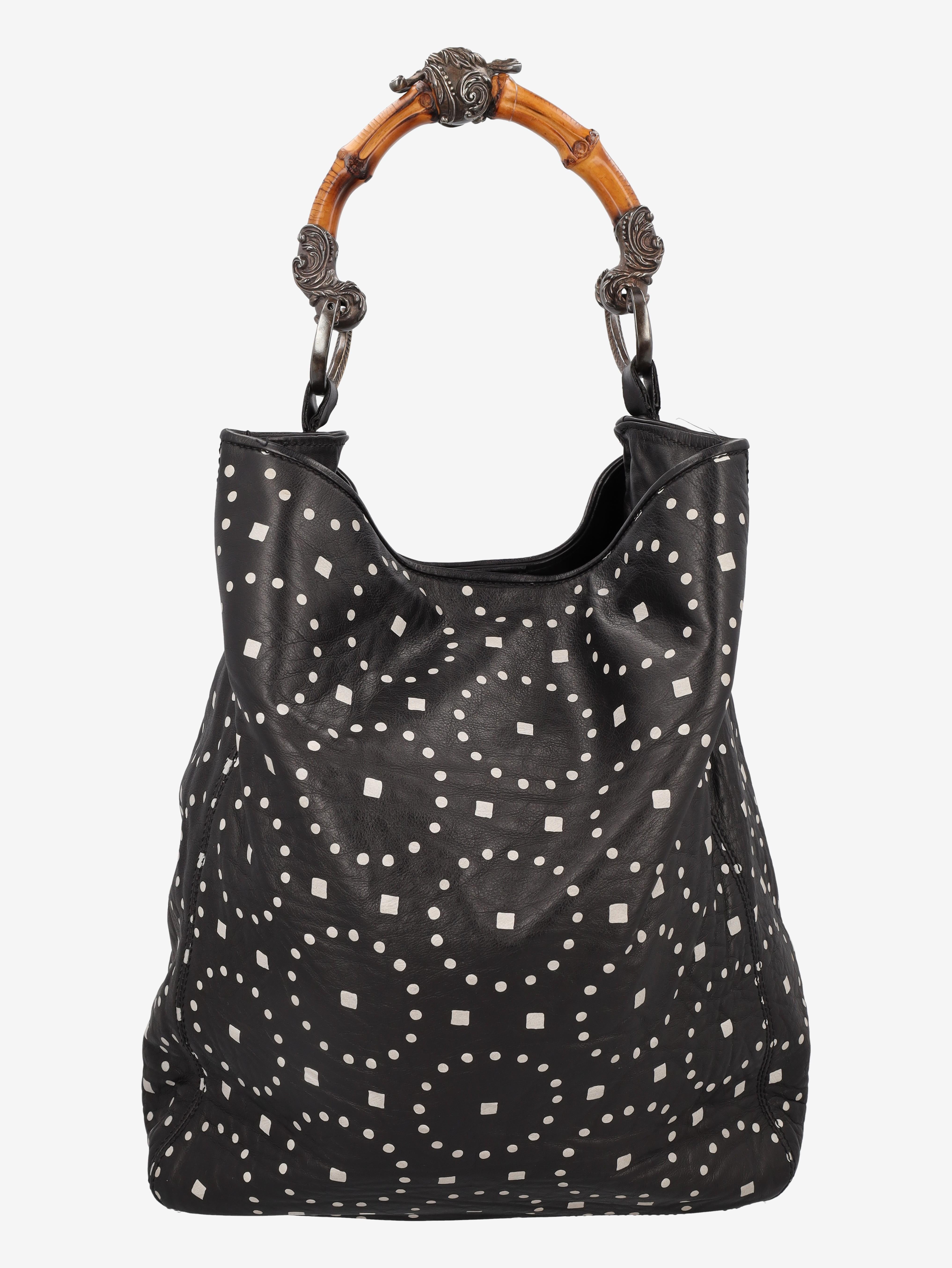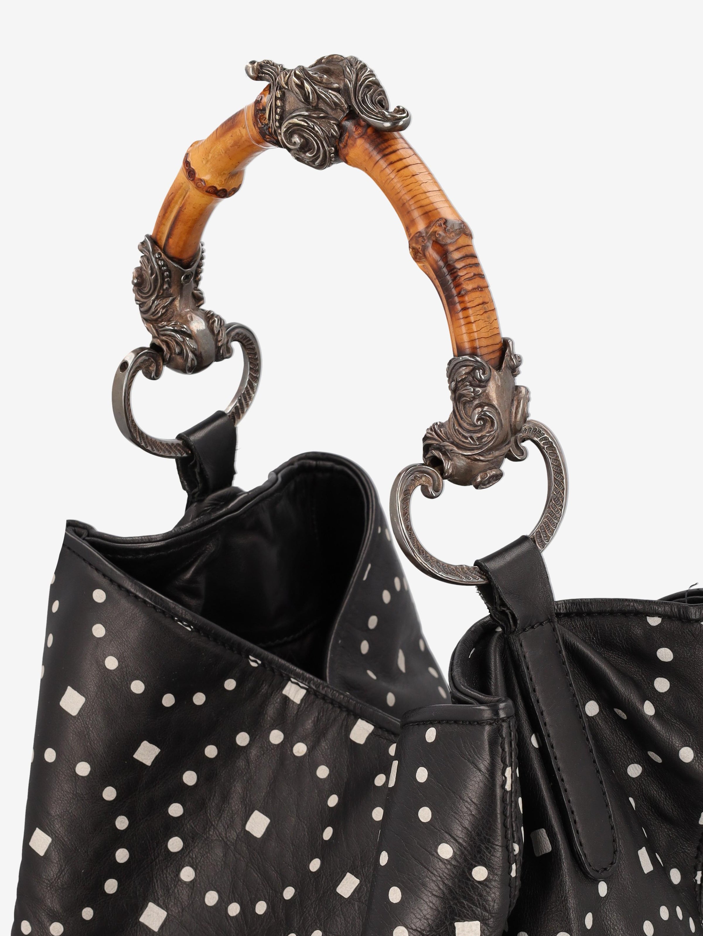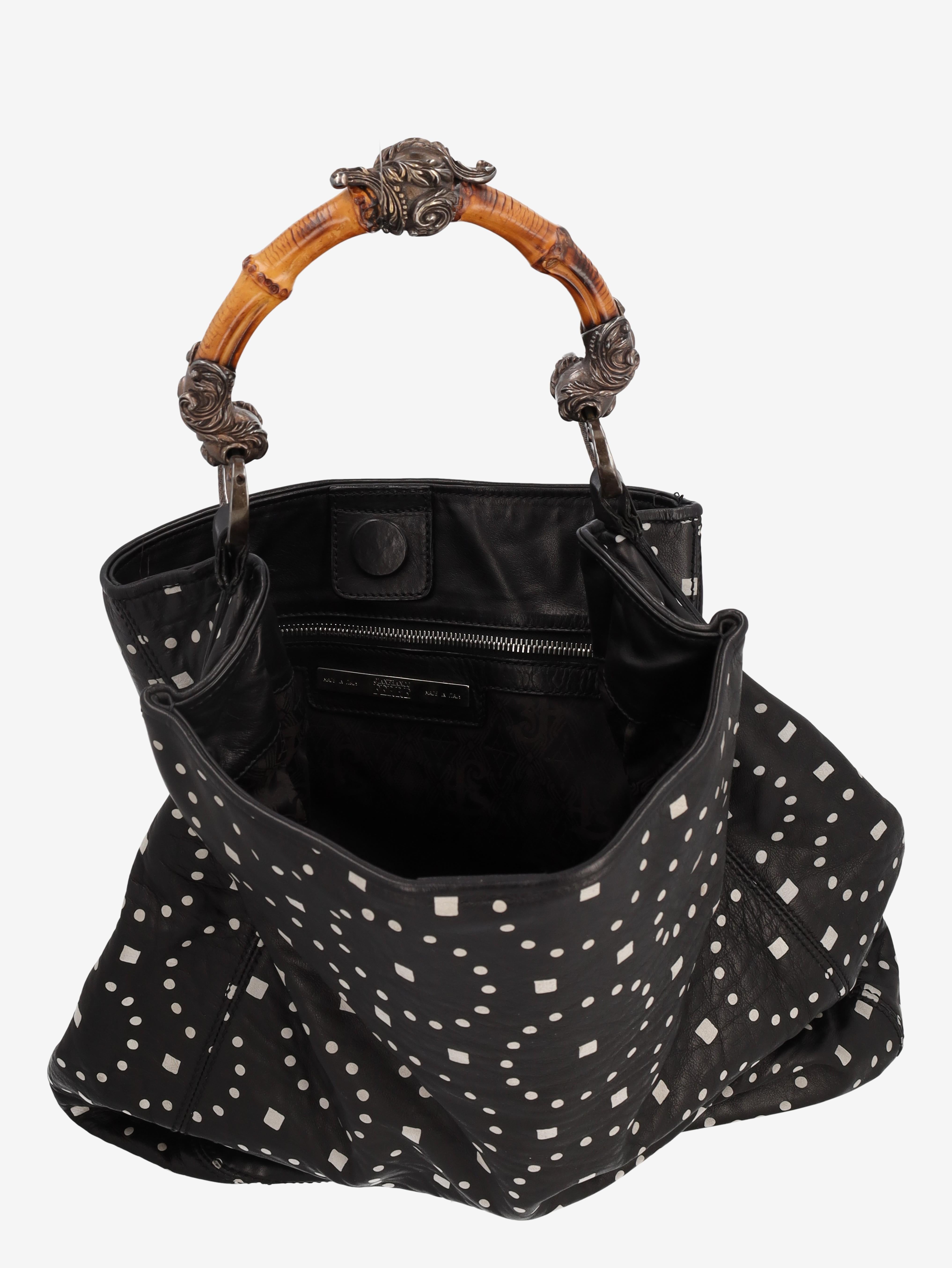 Borsa in bambù Gianfranco Ferré. Questa borsa di grandi dimensioni presenta una silhouette a secchiello, più stretta nella parte superiore e più ampia alla base. È rifinita con un manico in bambù impreziosito da inserti in metallo.