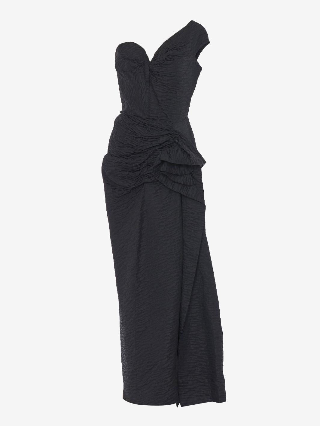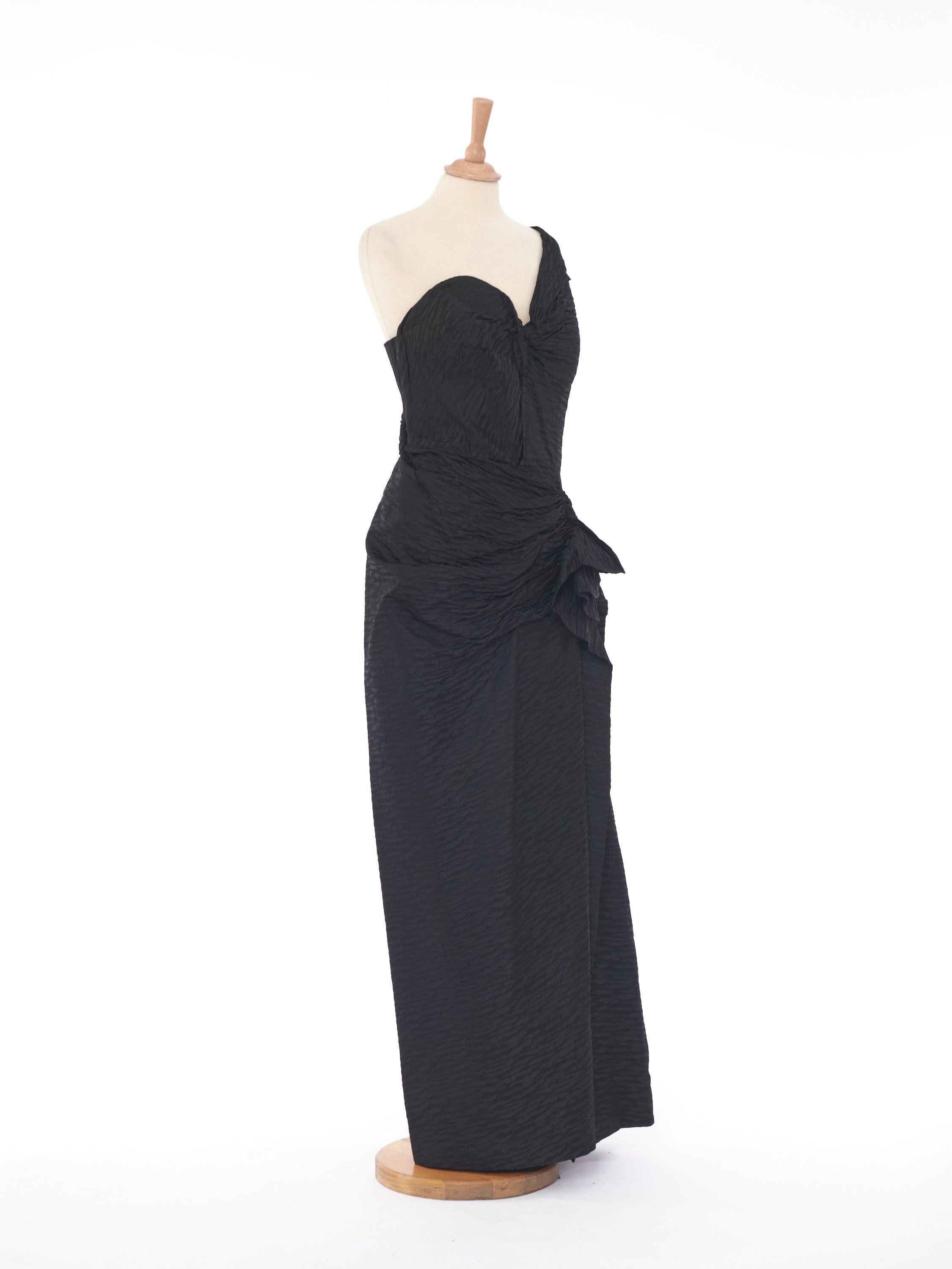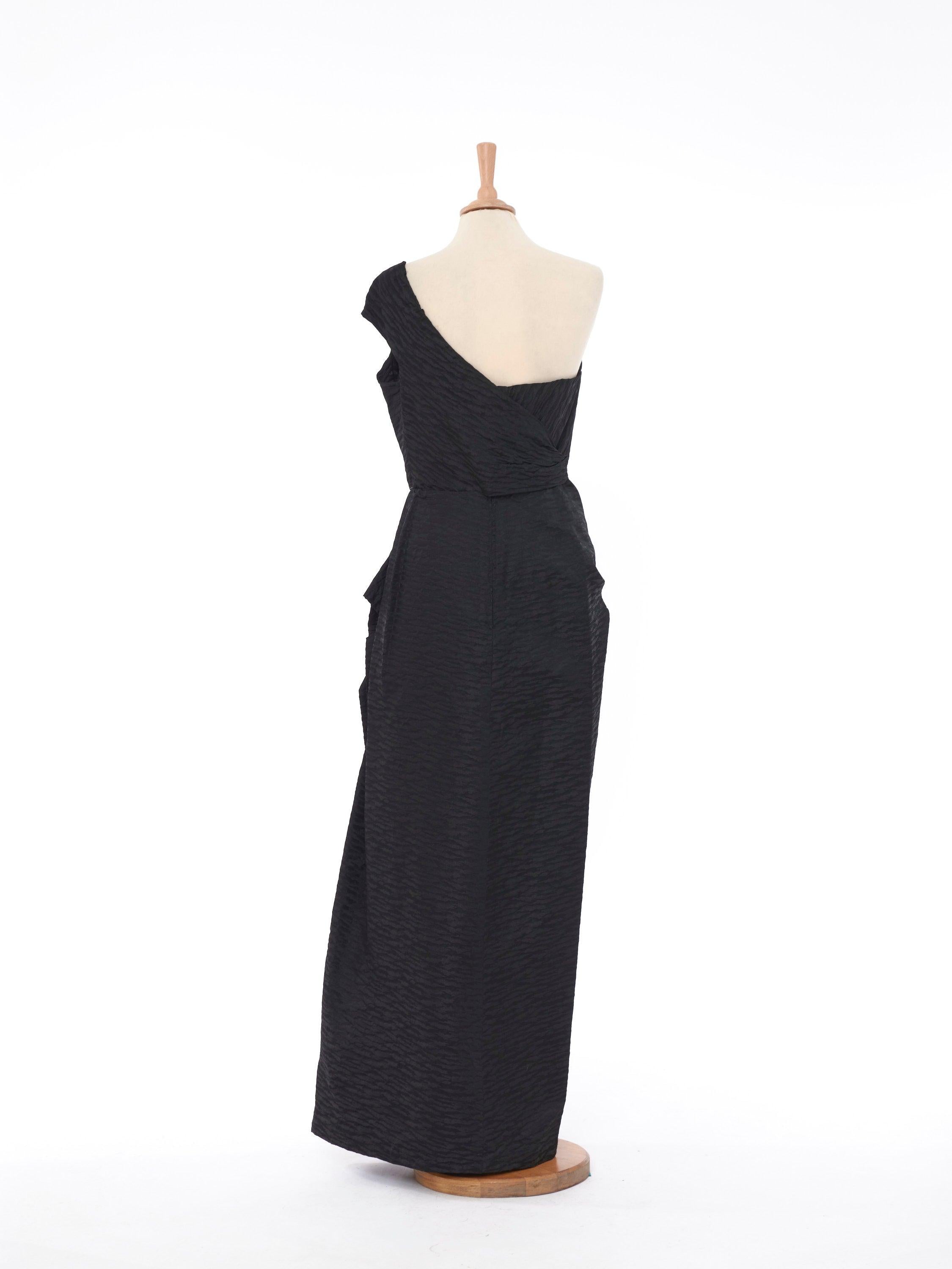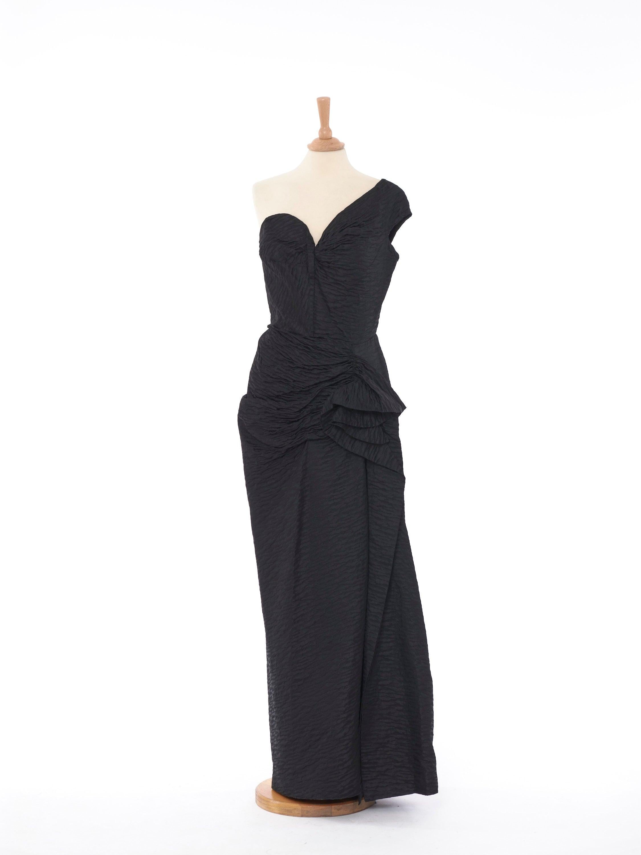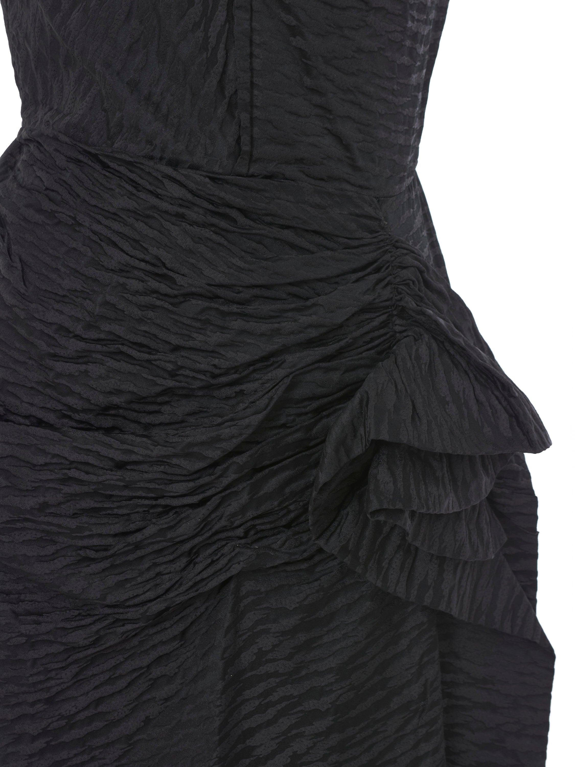 Abito nero monospalla con stampa zebrata tono su tono e scollo a cuore