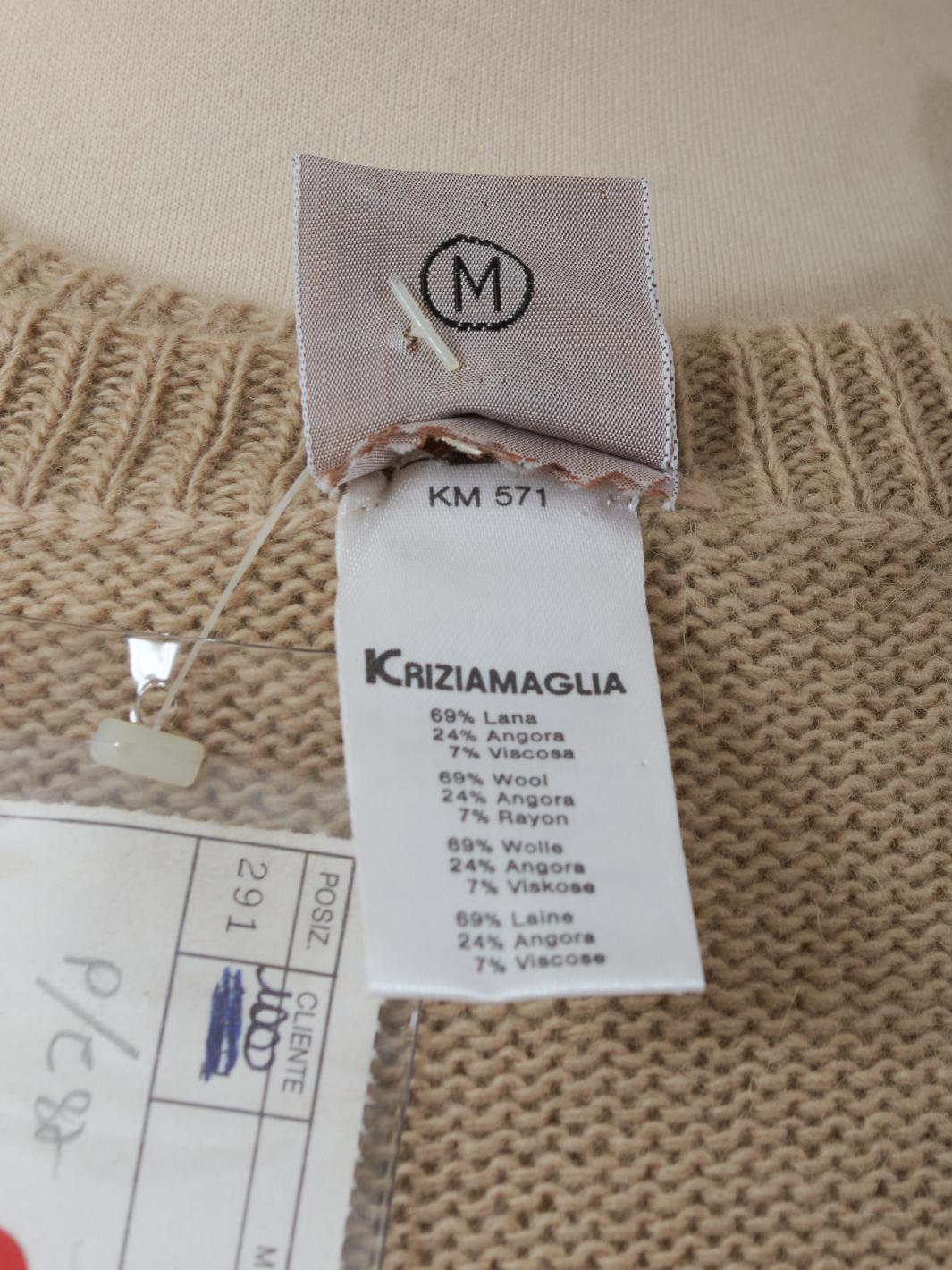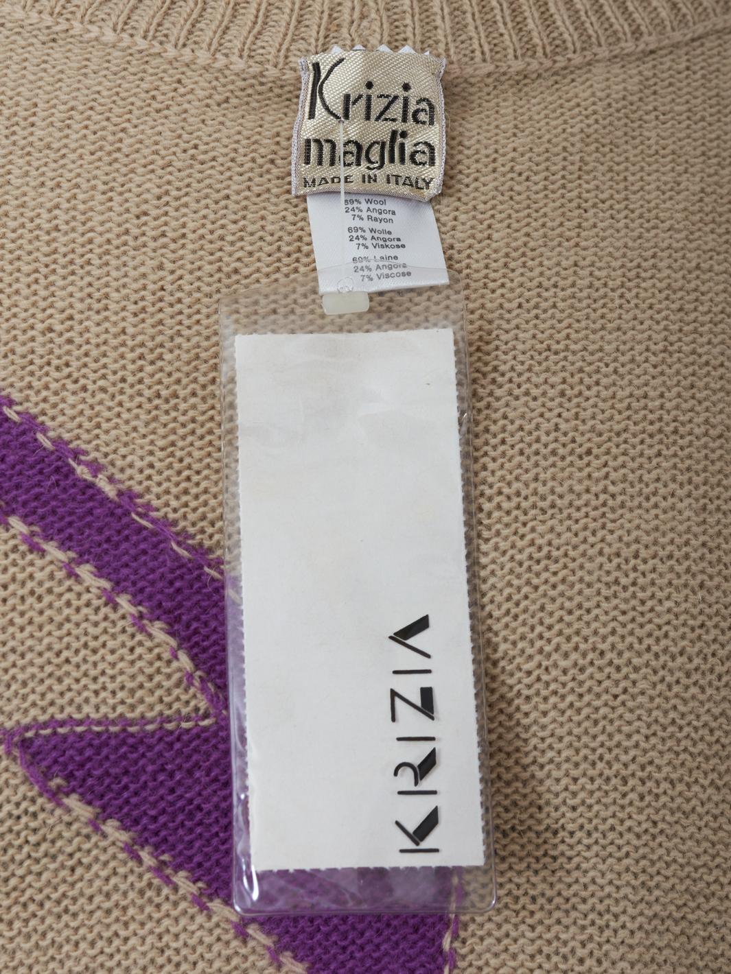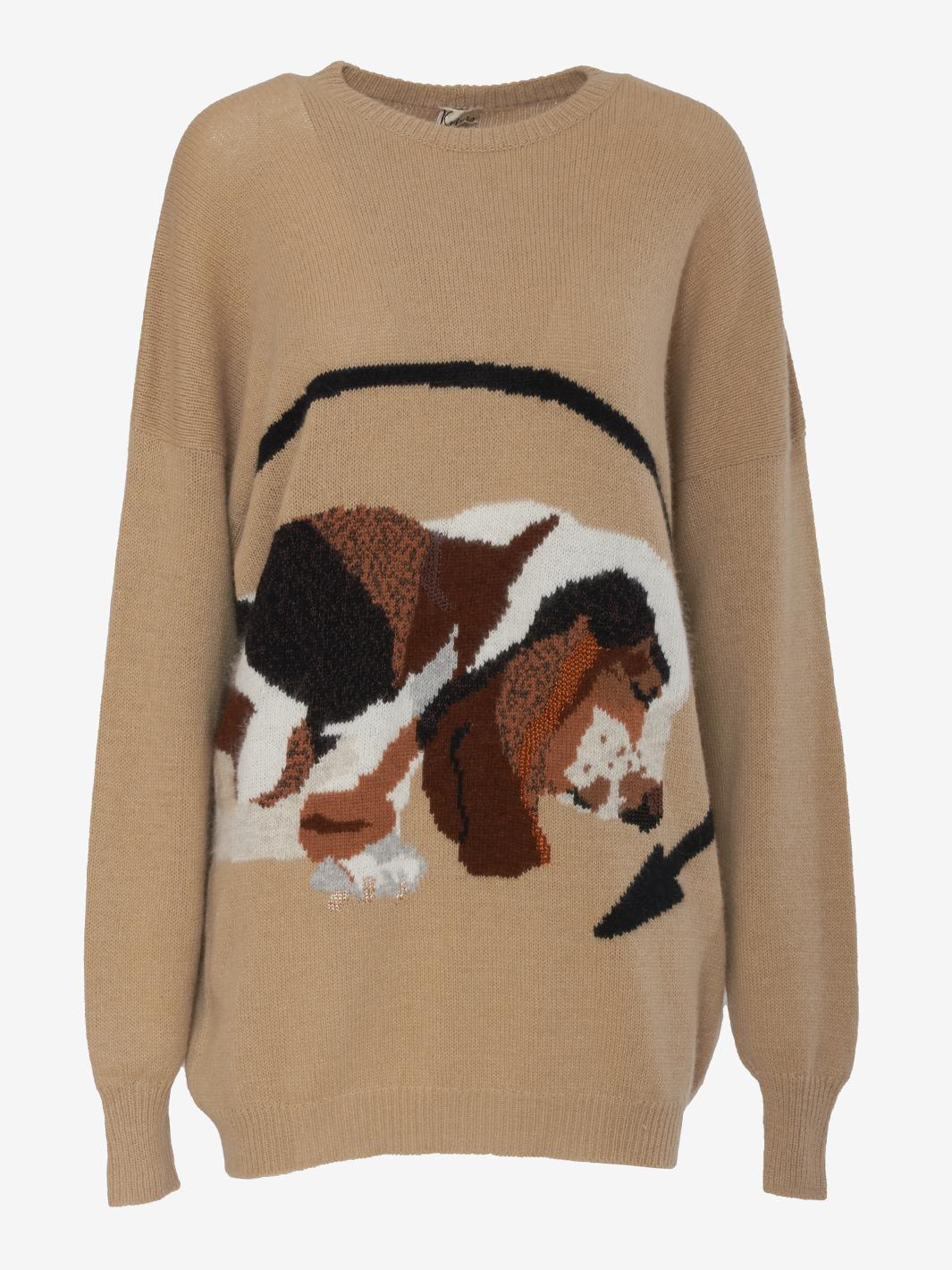 The Krizia sweater with dog embroidery is a fashion item that combines the brand's sophisticated elegance with a touch of originality and playful sophistication. The design of this sweater features a classic silhouette enhanced by detailed embroidery depicting a dog. The embroidered dog is crafted with great attention to detail, creating a charming and recognizable image.