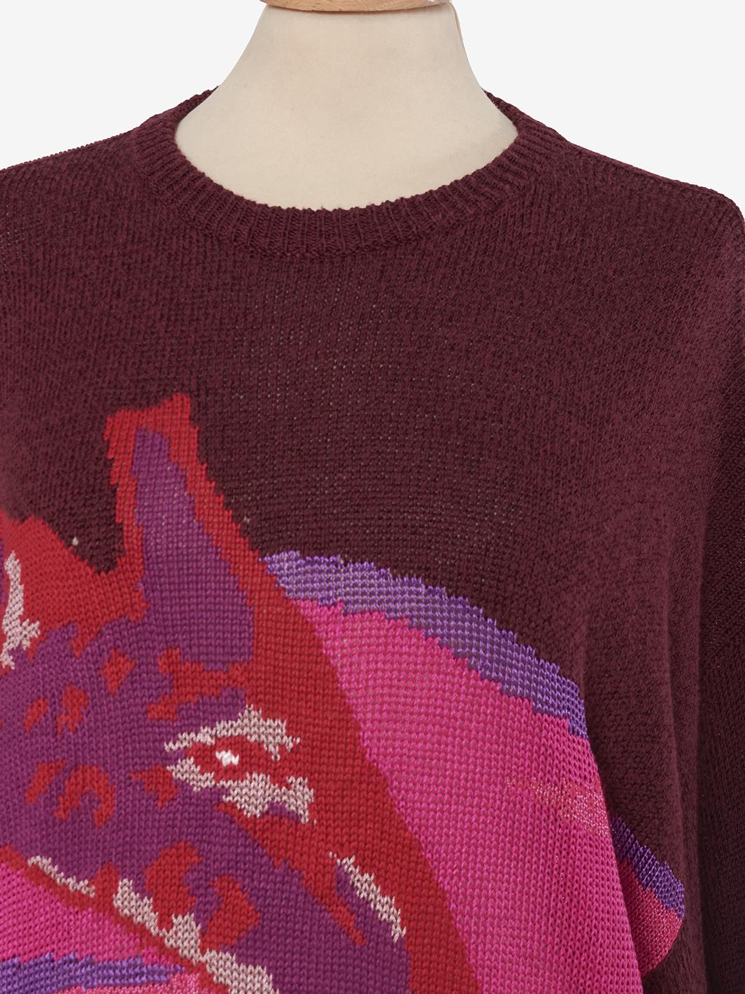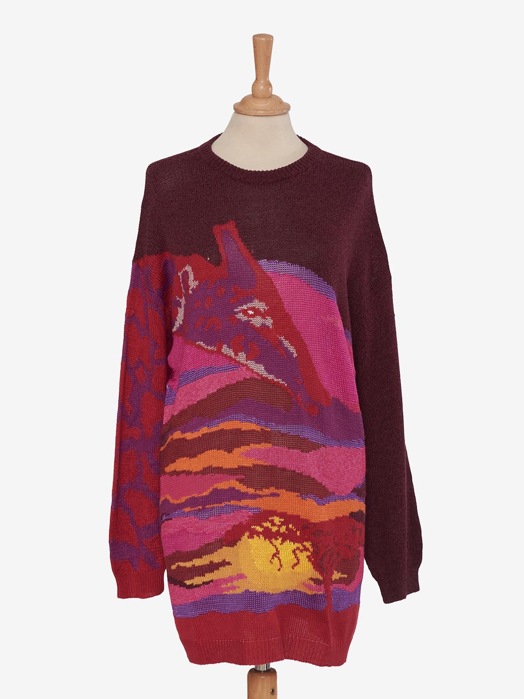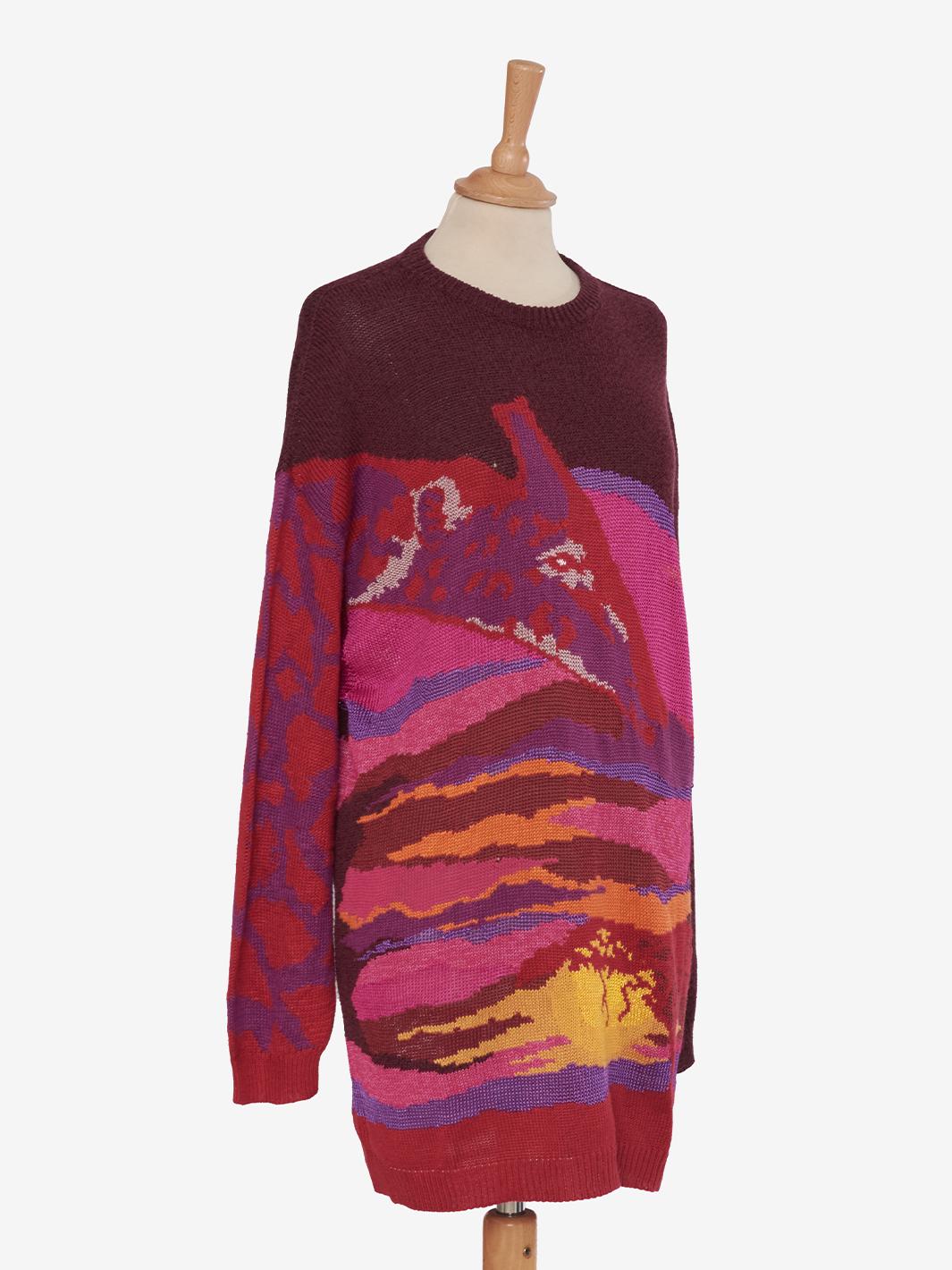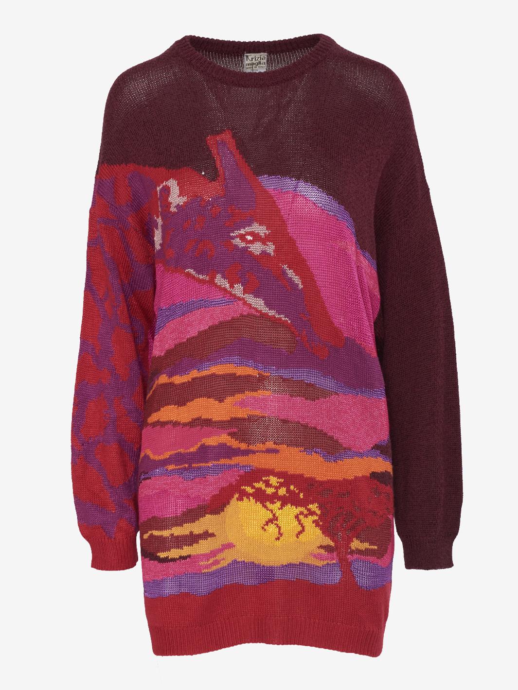 The Krizia sweater with giraffe embroidery is a high-fashion item that combines the distinctive elegance of the famous Italian brand with detailed and refined embroidery dedicated to the safari world.