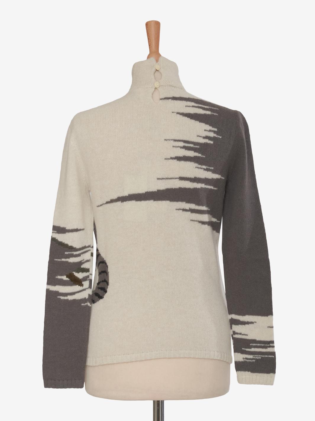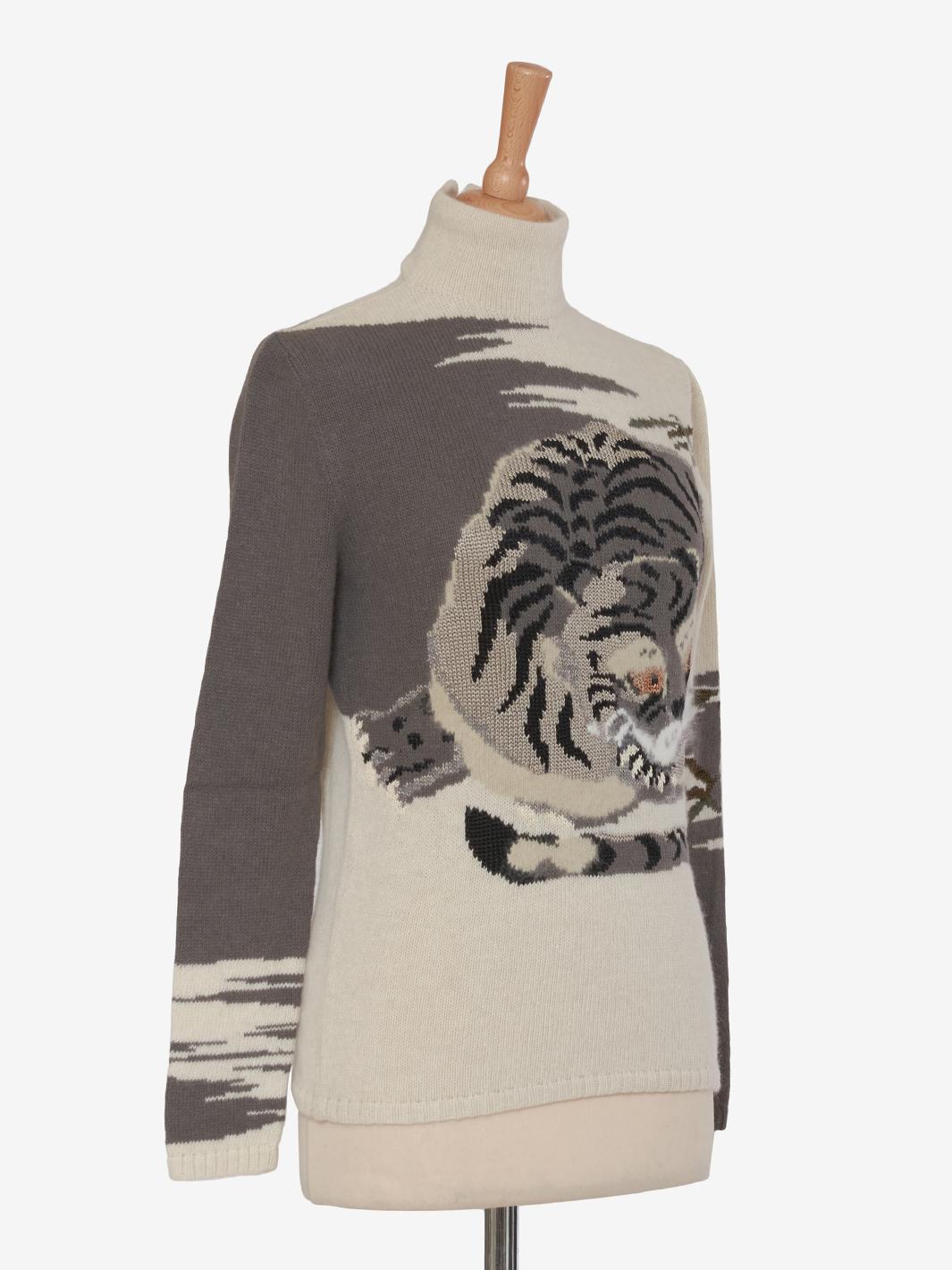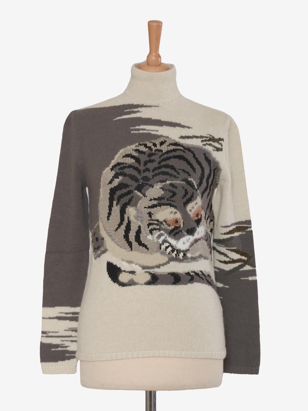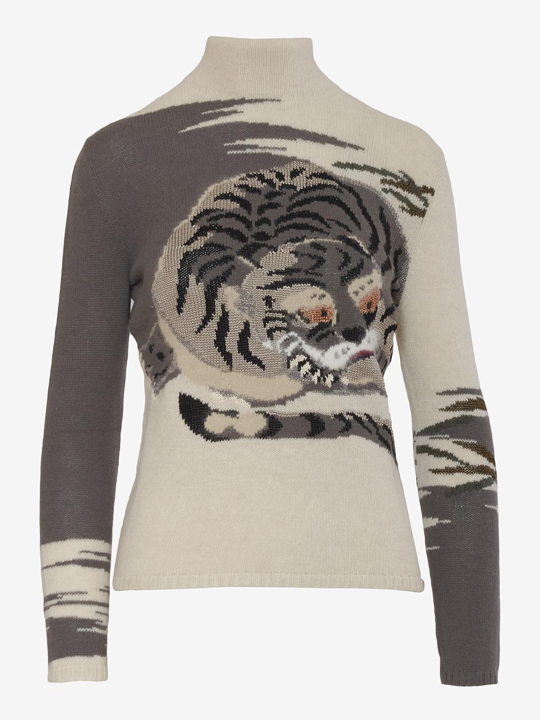 The Krizia wool mock neckline with hyena embroidery is a high-fashion garment that combines the softness and warm comfort of wool with a unique, bold detail.
