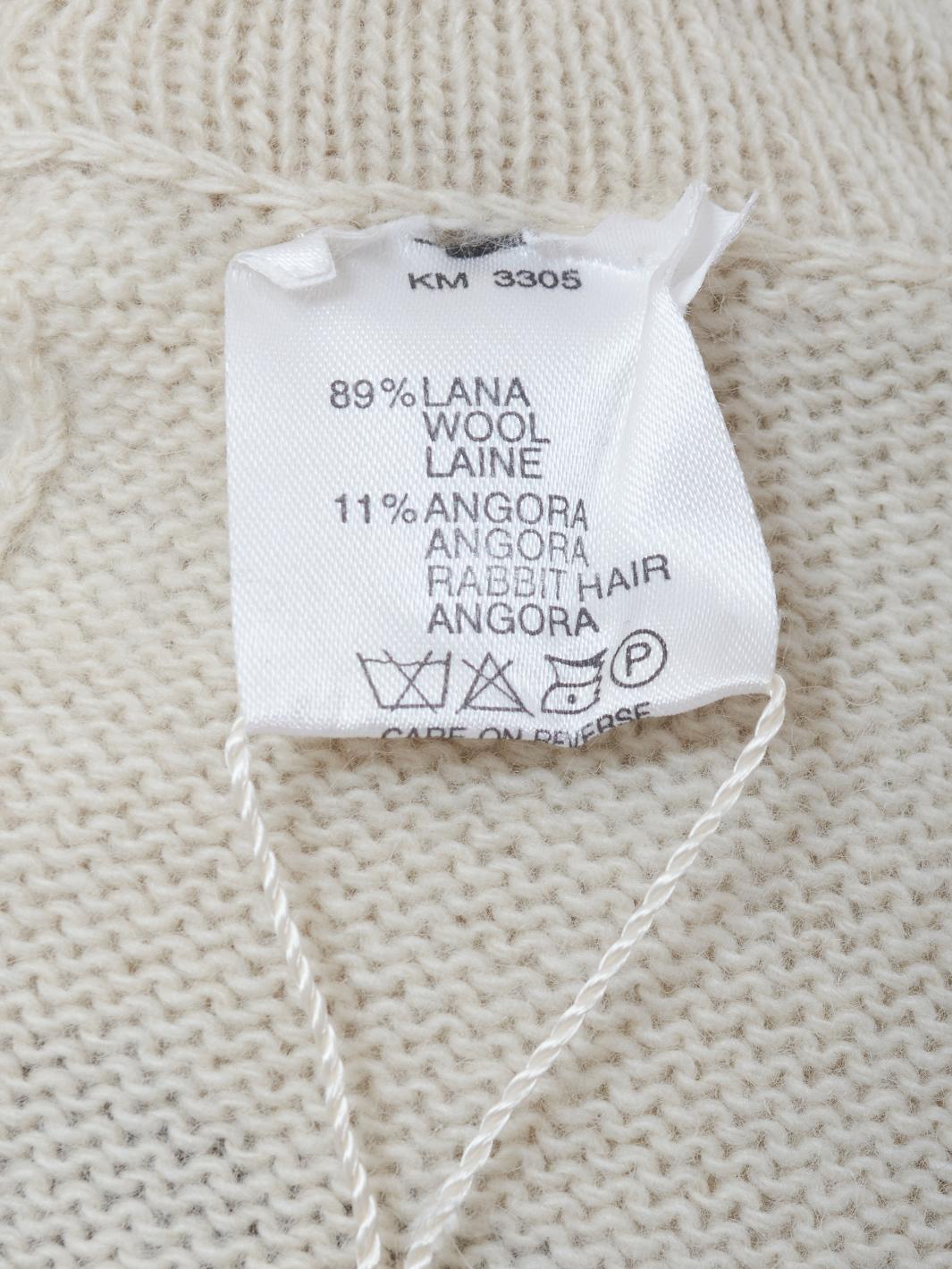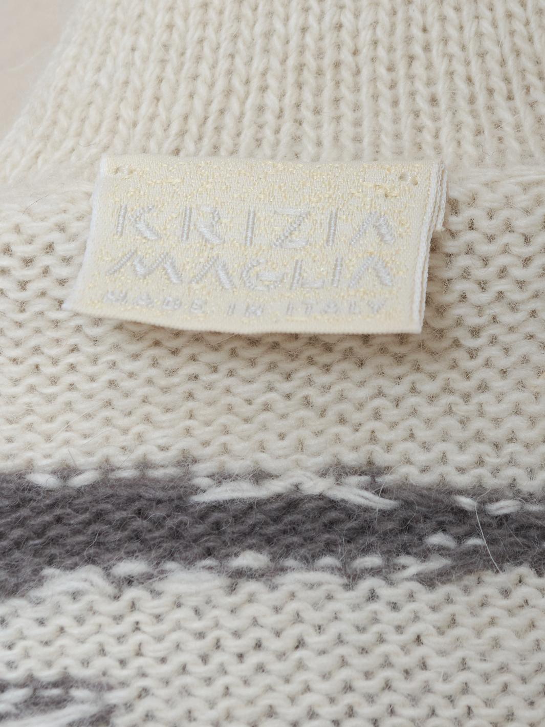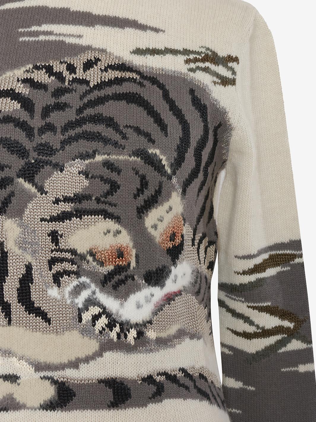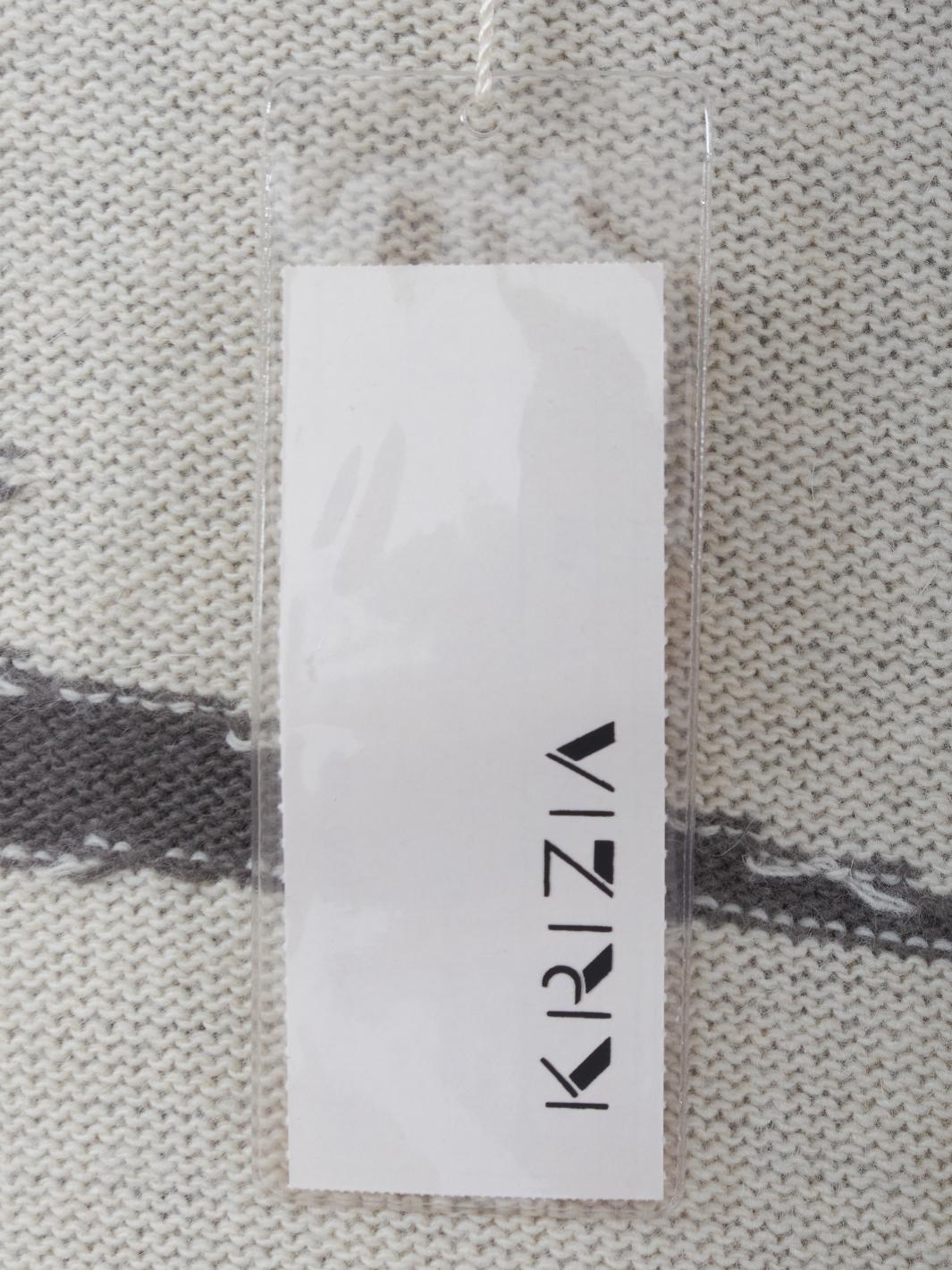The Krizia wool mock neckline with hyena embroidery is a high-fashion garment that combines the softness and warm comfort of wool with a unique, bold detail.