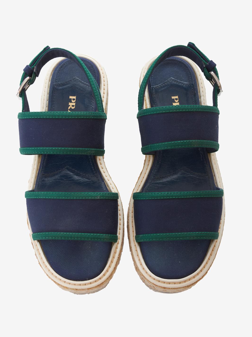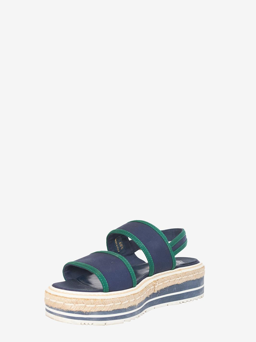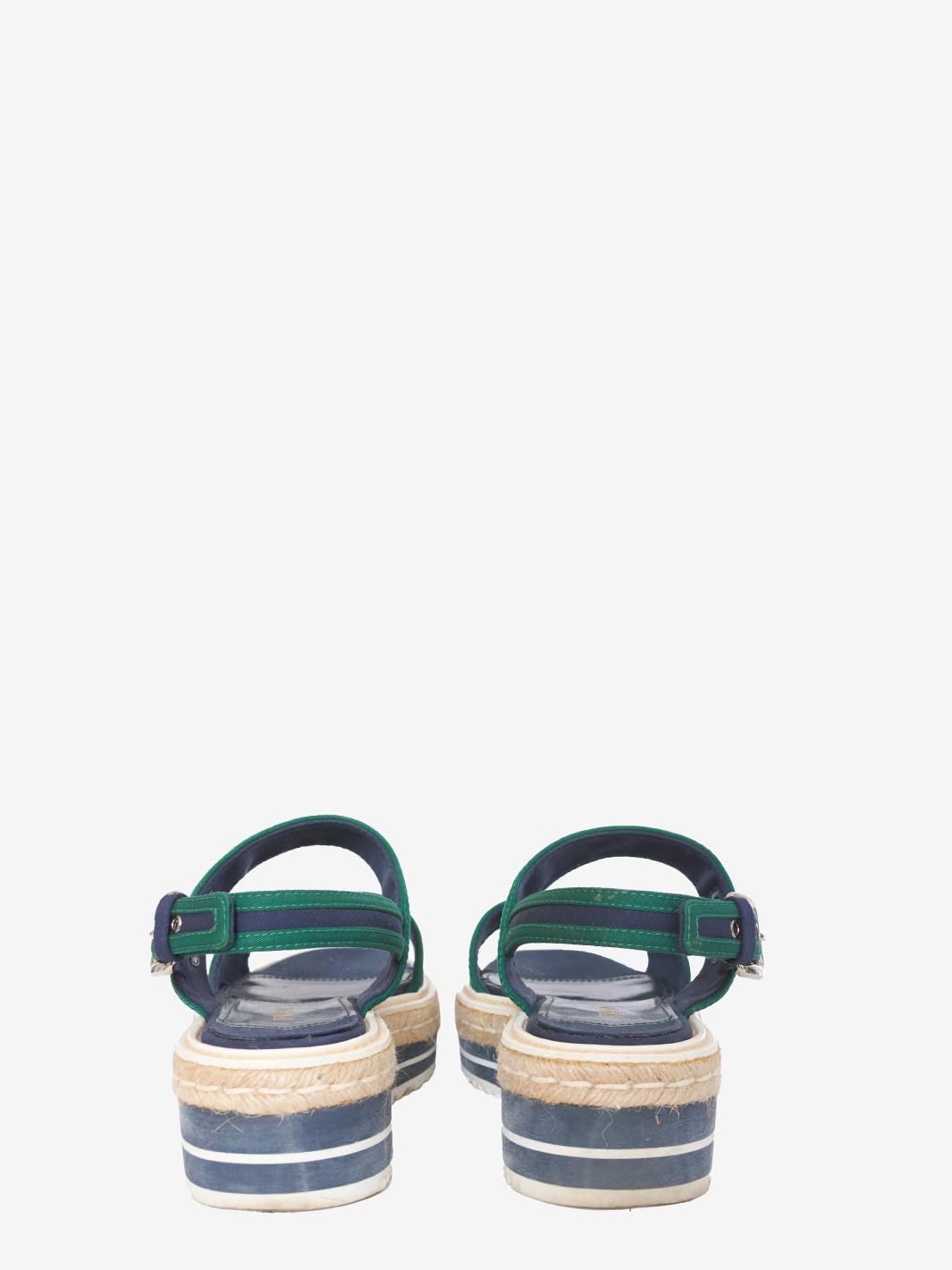 Prada's sandal is made of blue and green canvas with a high rope and rubber wedge. The blue and green canvas creates a lively and dynamic effect. The wedge is covered in natural woven rope that gives the sandal a summery and casual look. The rubber used for the sole provides extra grip and stability while walking. The closure is adjustable thanks to a side buckle, which allows the sandal to be adjusted to the foot. The design of the Prada sandal is unique and refined, perfect for a casual and modern look.