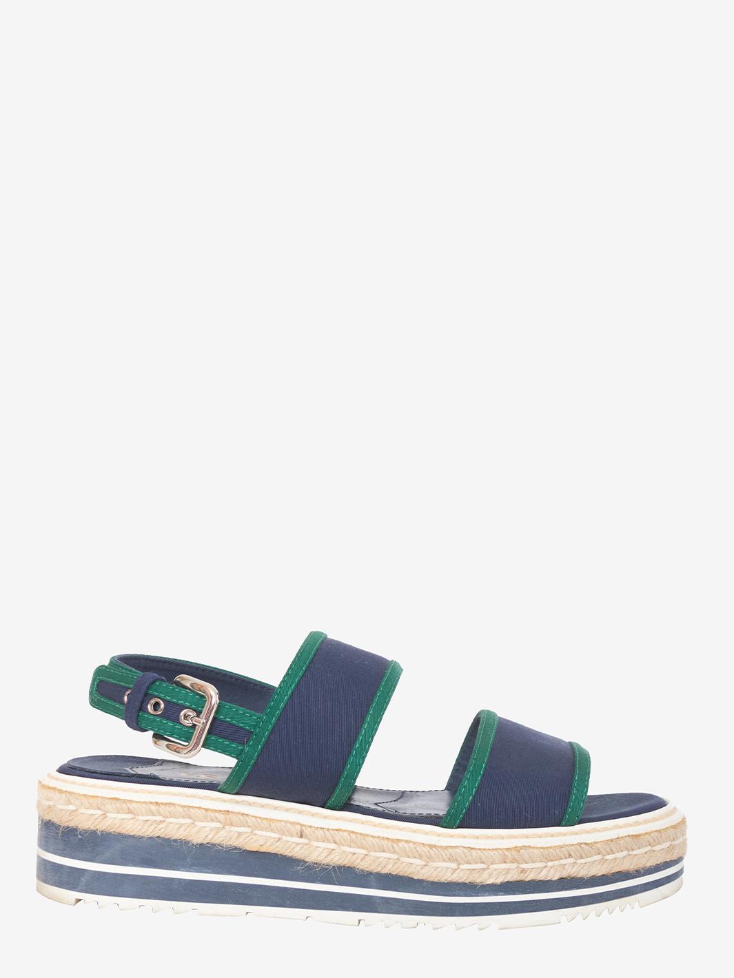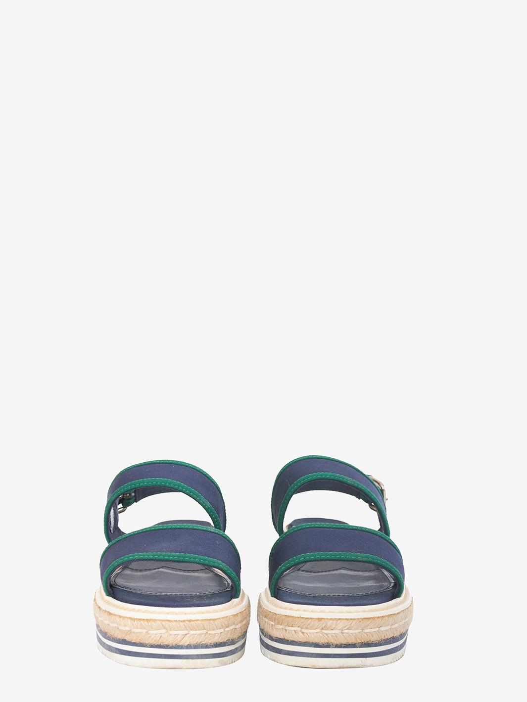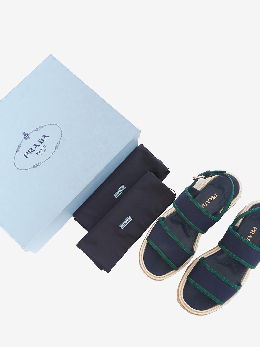 Prada's sandal is made of blue and green canvas with a high rope and rubber wedge. The blue and green canvas creates a lively and dynamic effect. The wedge is covered in natural woven rope that gives the sandal a summery and casual look. The rubber used for the sole provides extra grip and stability while walking. The closure is adjustable thanks to a side buckle, which allows the sandal to be adjusted to the foot. The design of the Prada sandal is unique and refined, perfect for a casual and modern look.