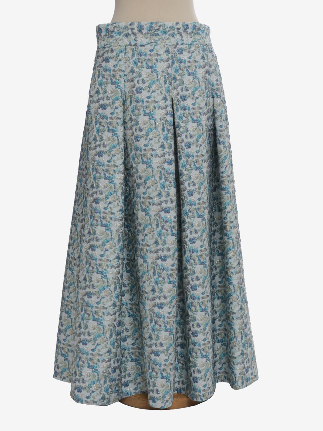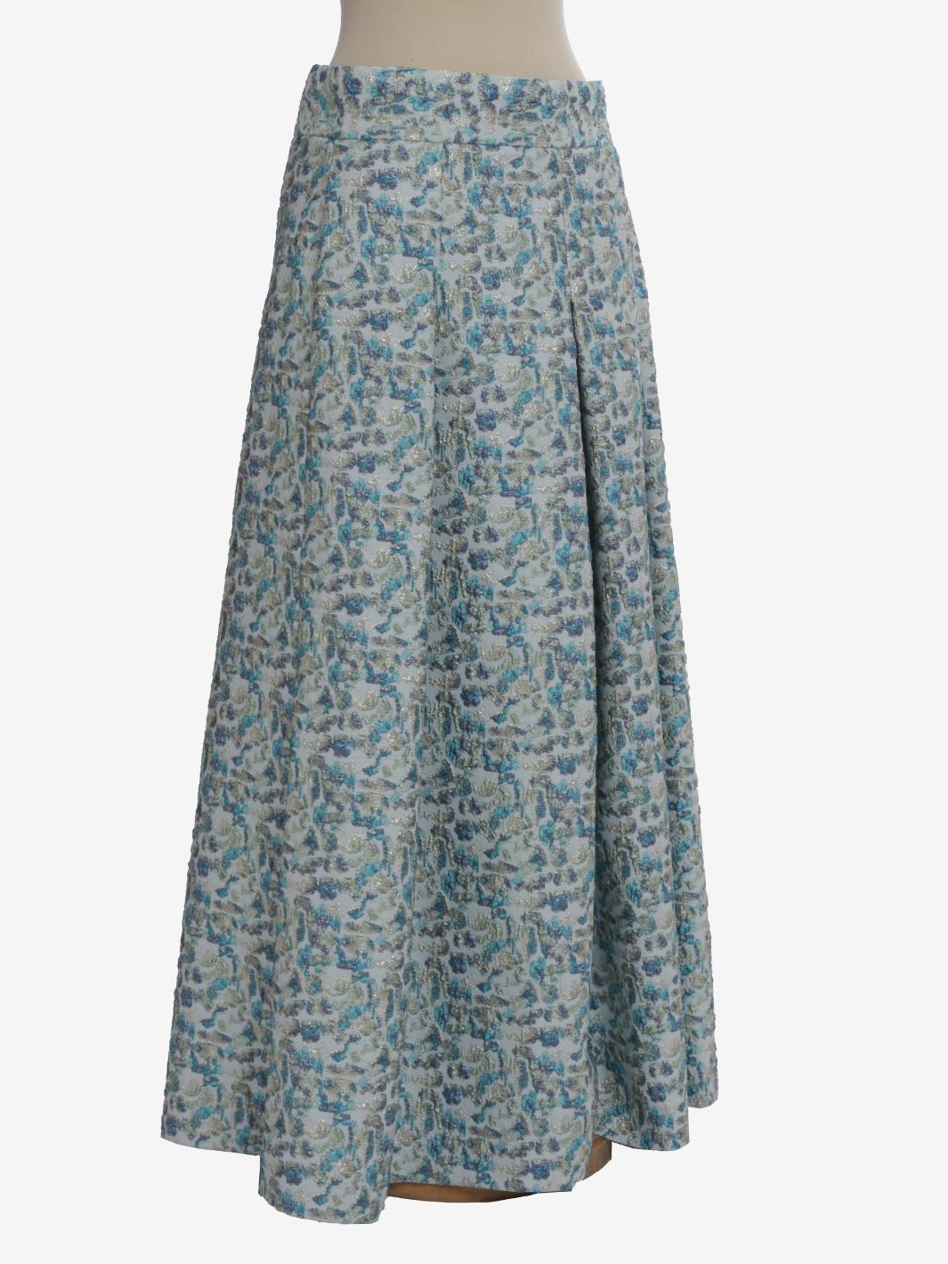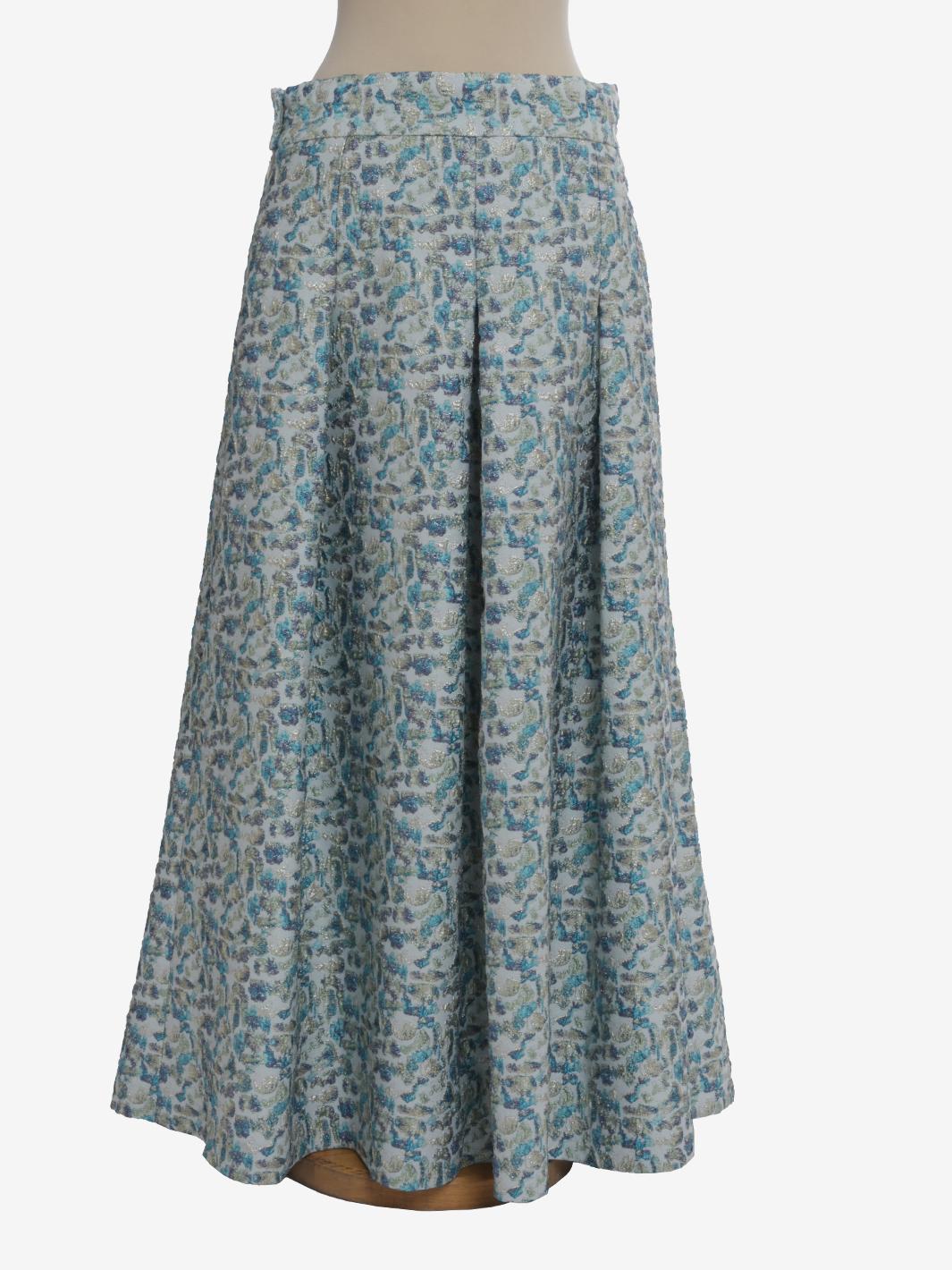 Vintage Embroidered Skirt is a made in italy garment featuring an embroidered pattern with lurex inlays, zipper and button side closure, and large pleats that create movement to the long skirt.