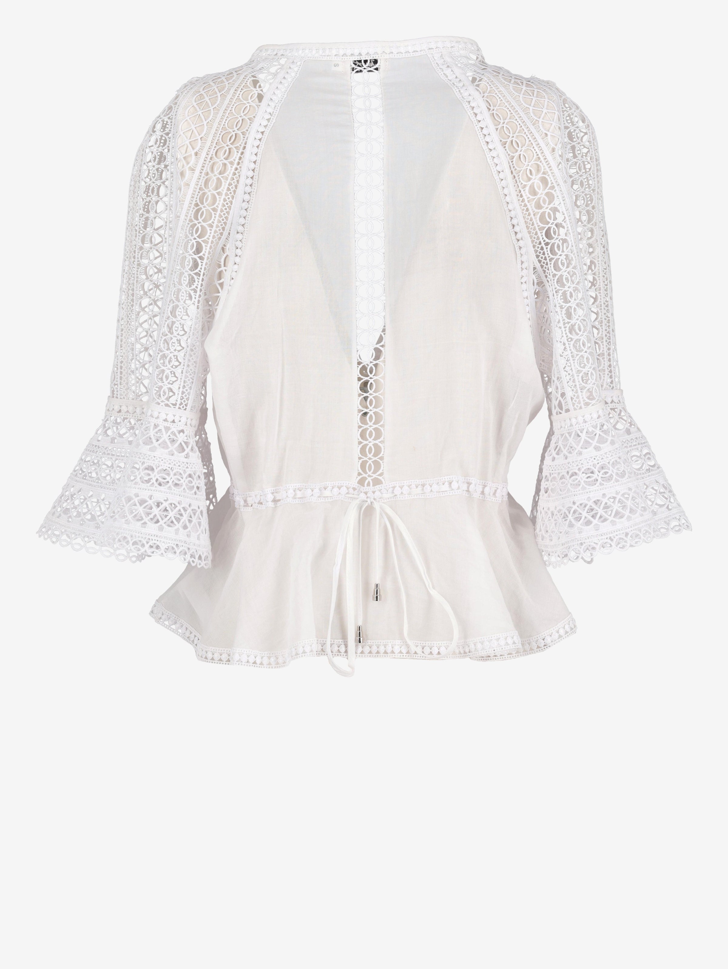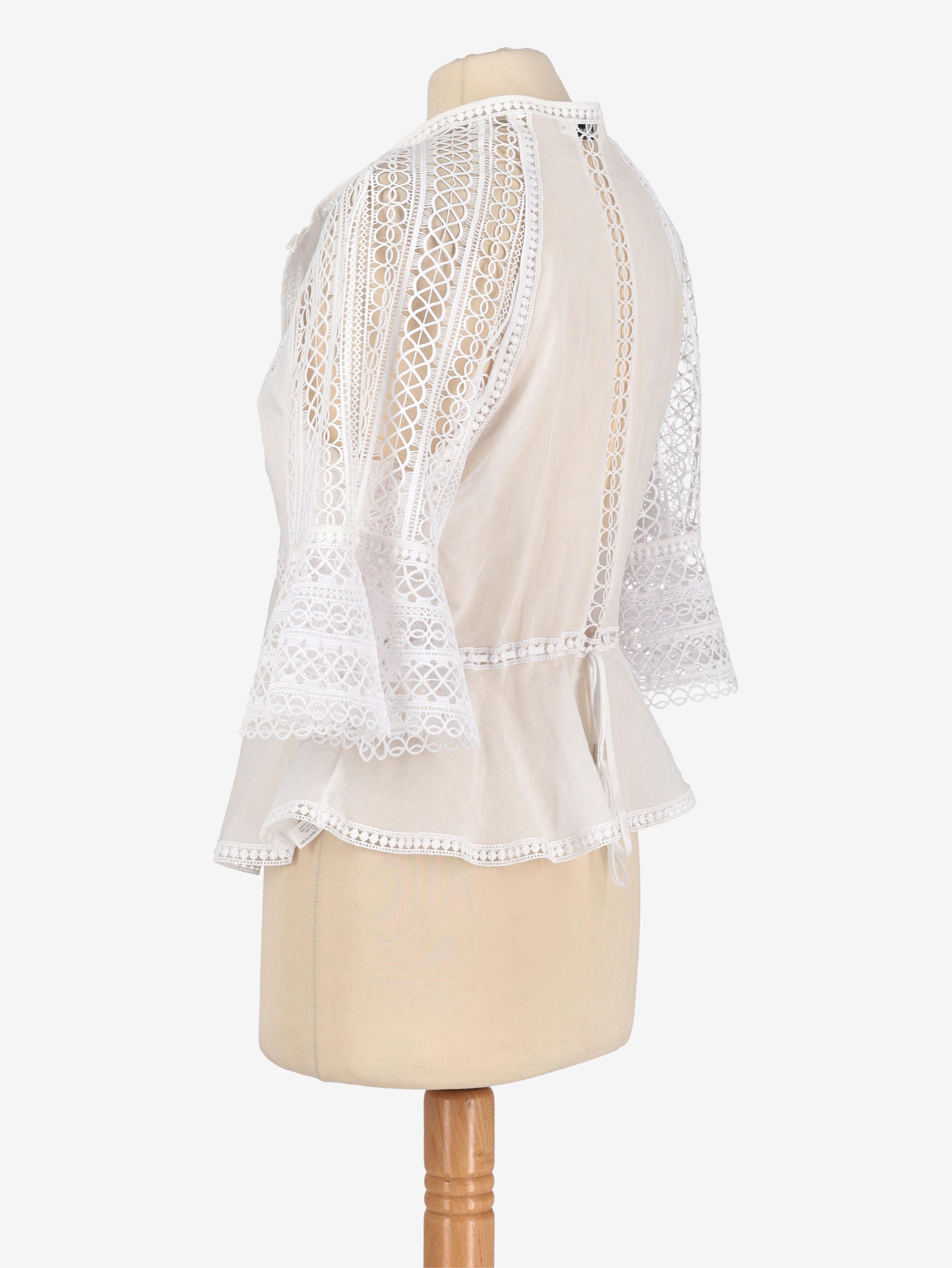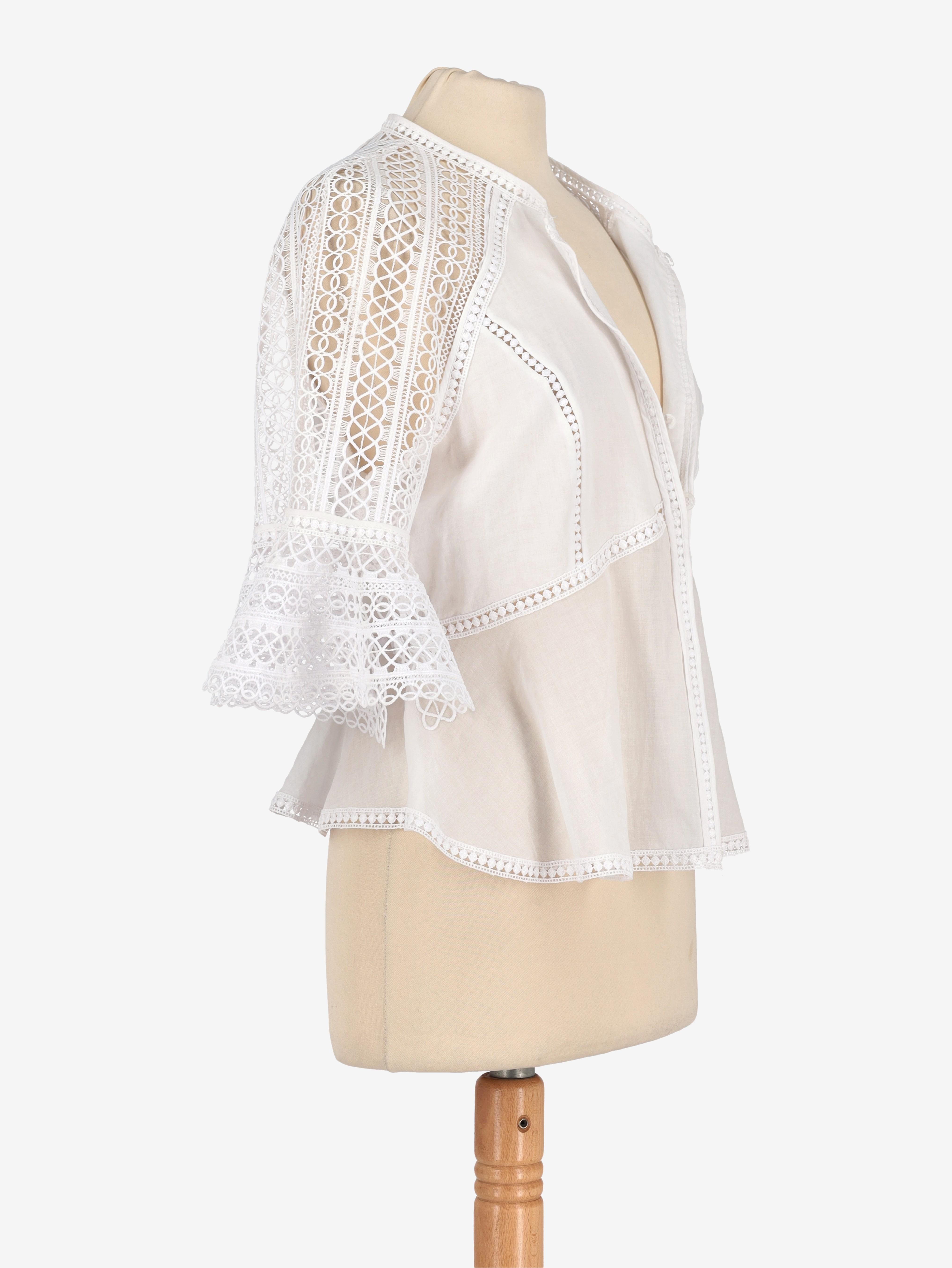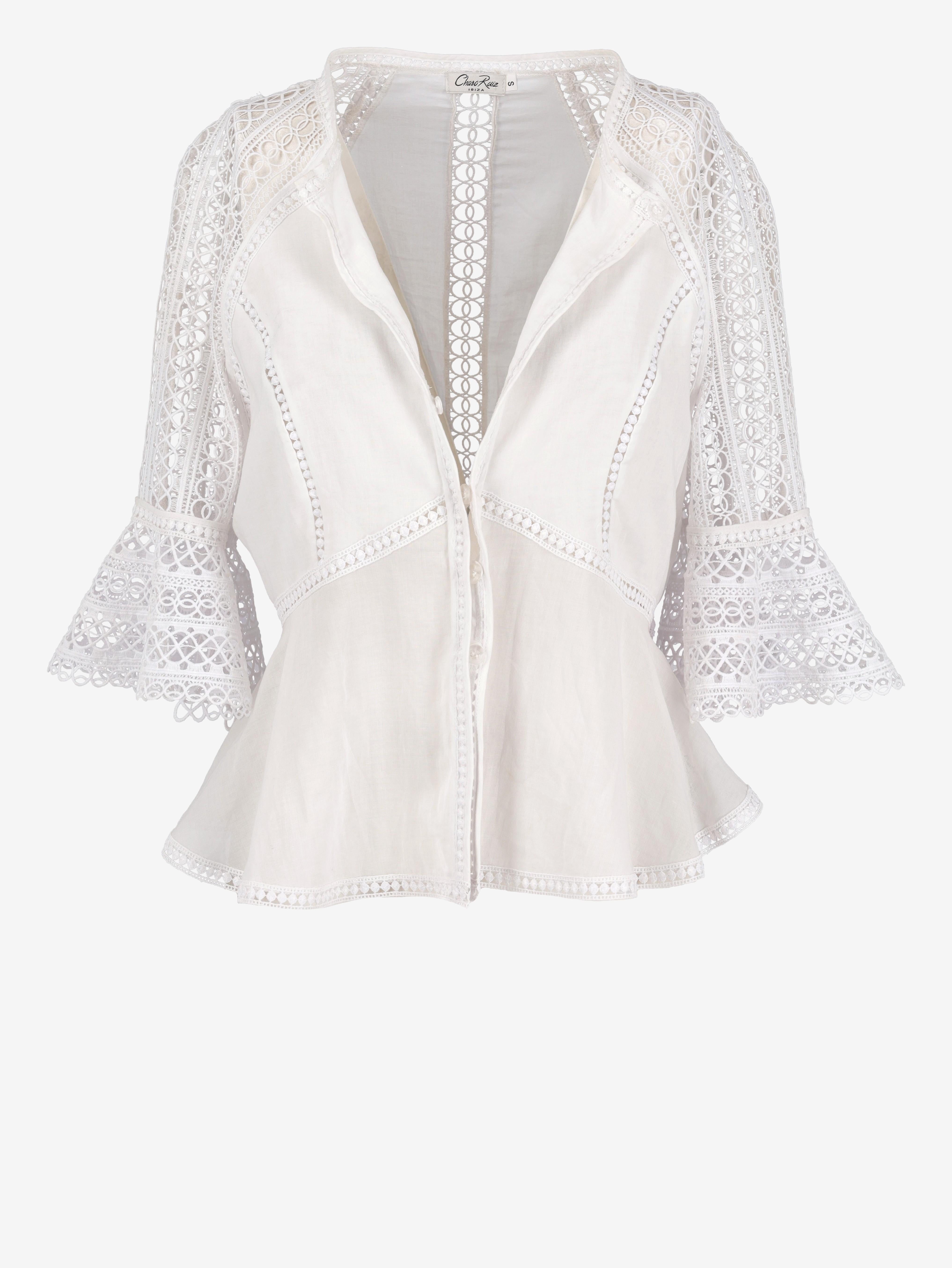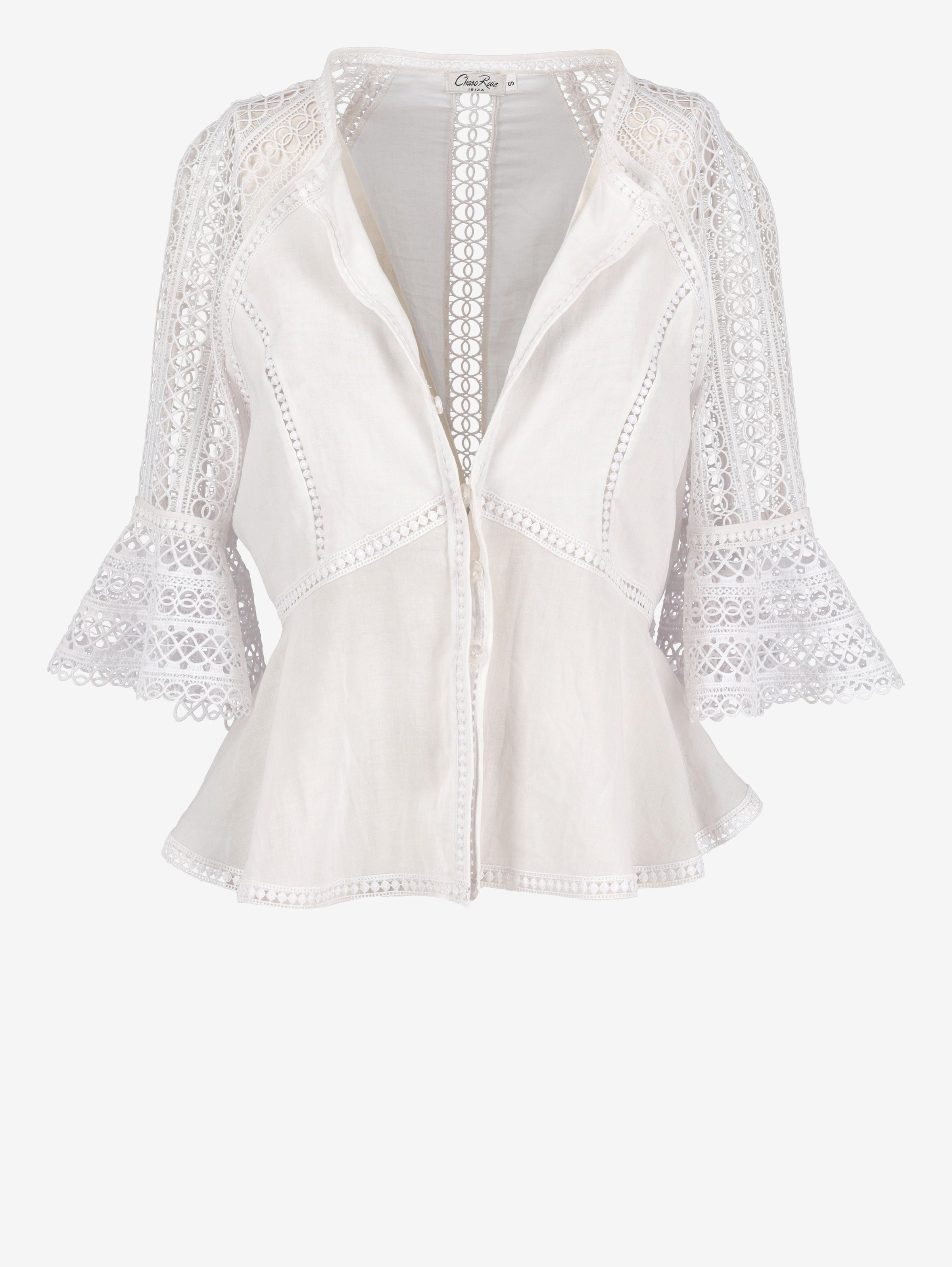 Vintage White Macramè Shirt is a white offset blouse with wide three quarter macramé sleeves with a round neckline and frontal button closure.