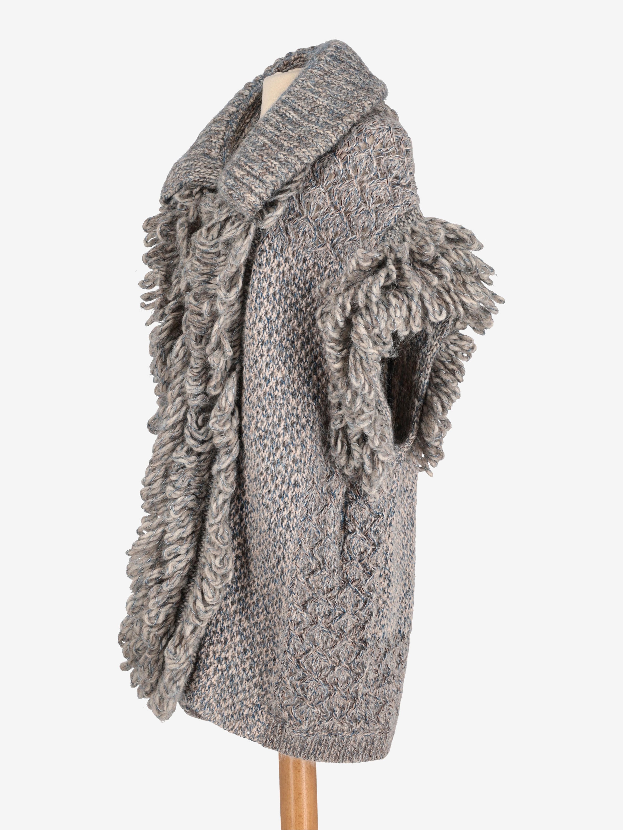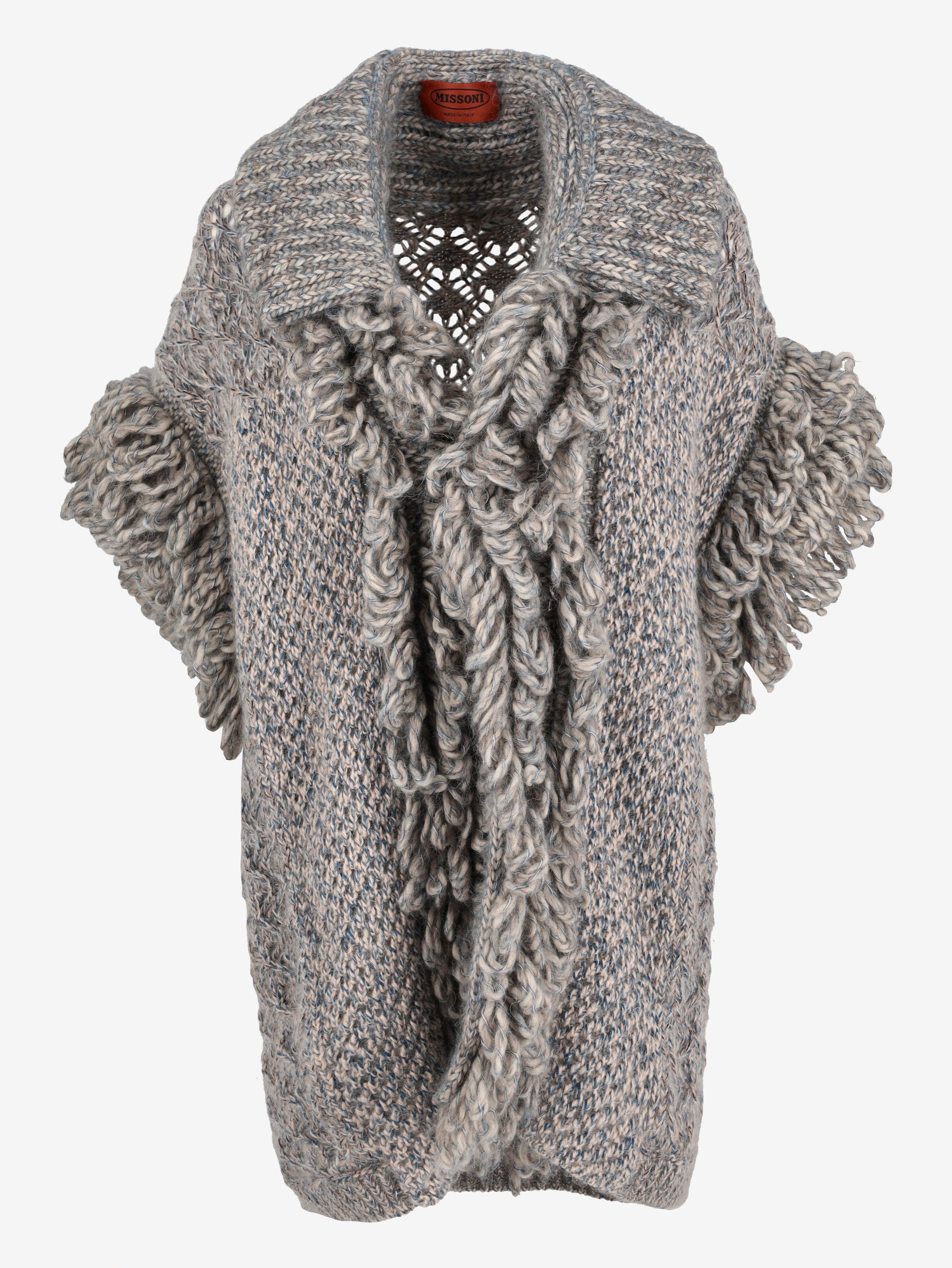 Missoni Knitted Vest. This long knitted vest is sleeveless and features a collar, an open front, and front pockets.