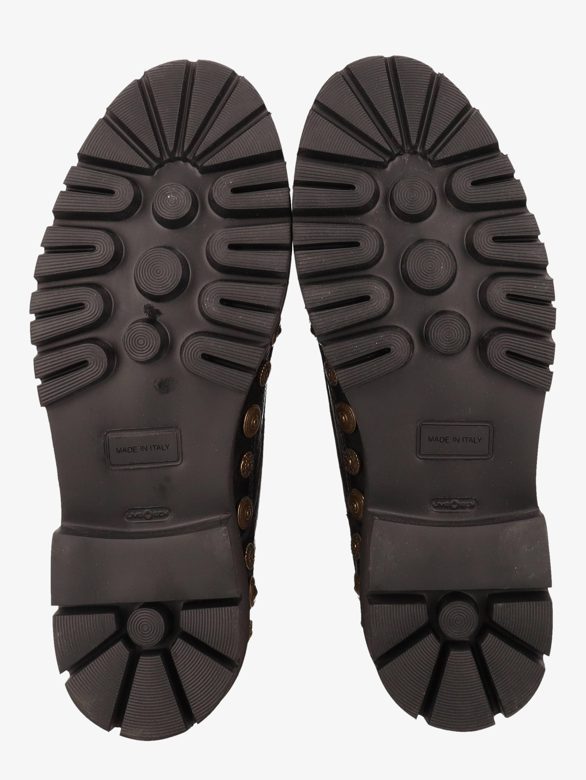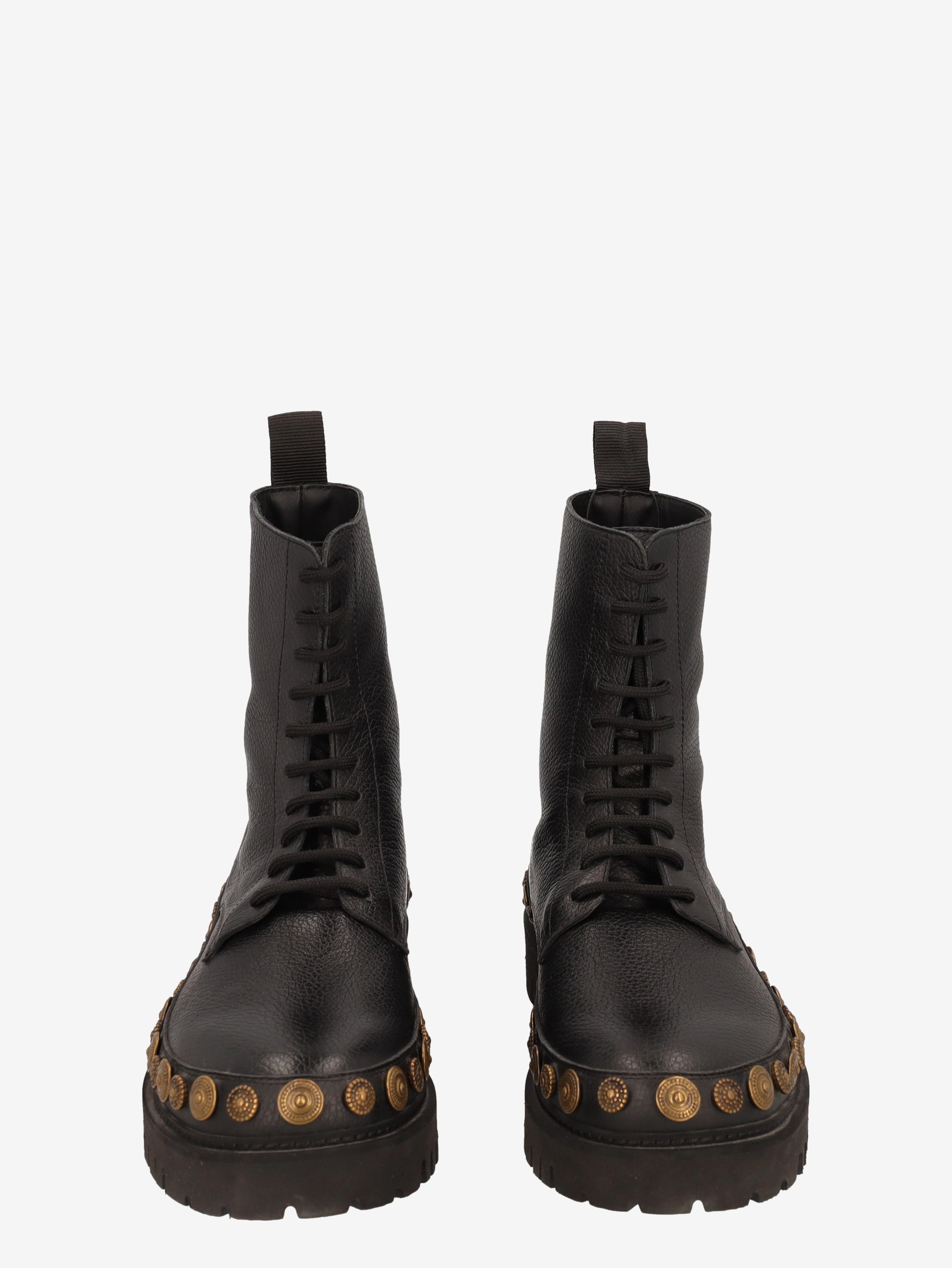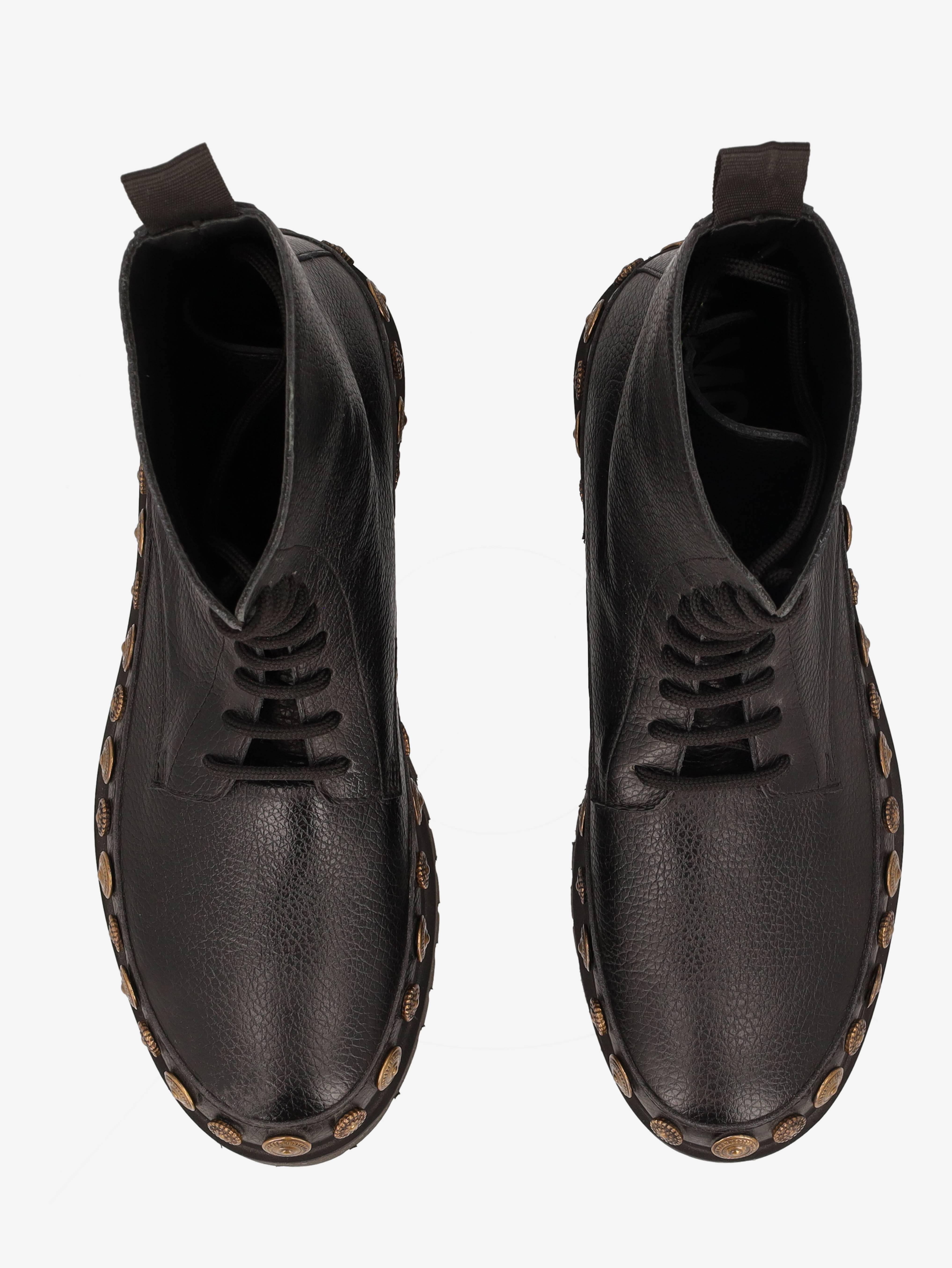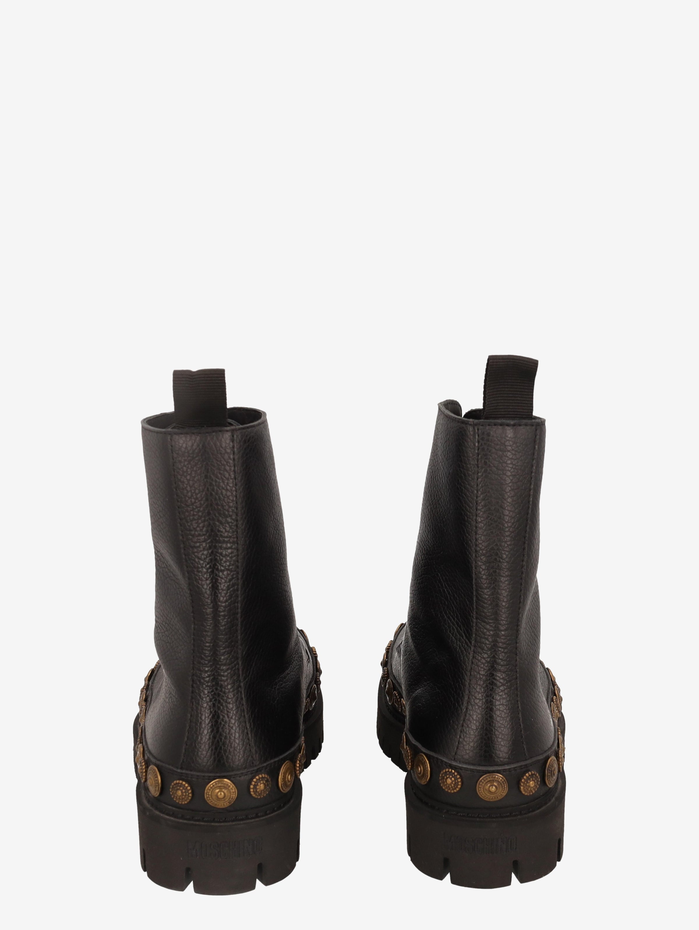 Moschino Studded Leather Boots are a pair of boots made of soft hammered cowhide leather with rubber soles and gold studded decoration along all sides.