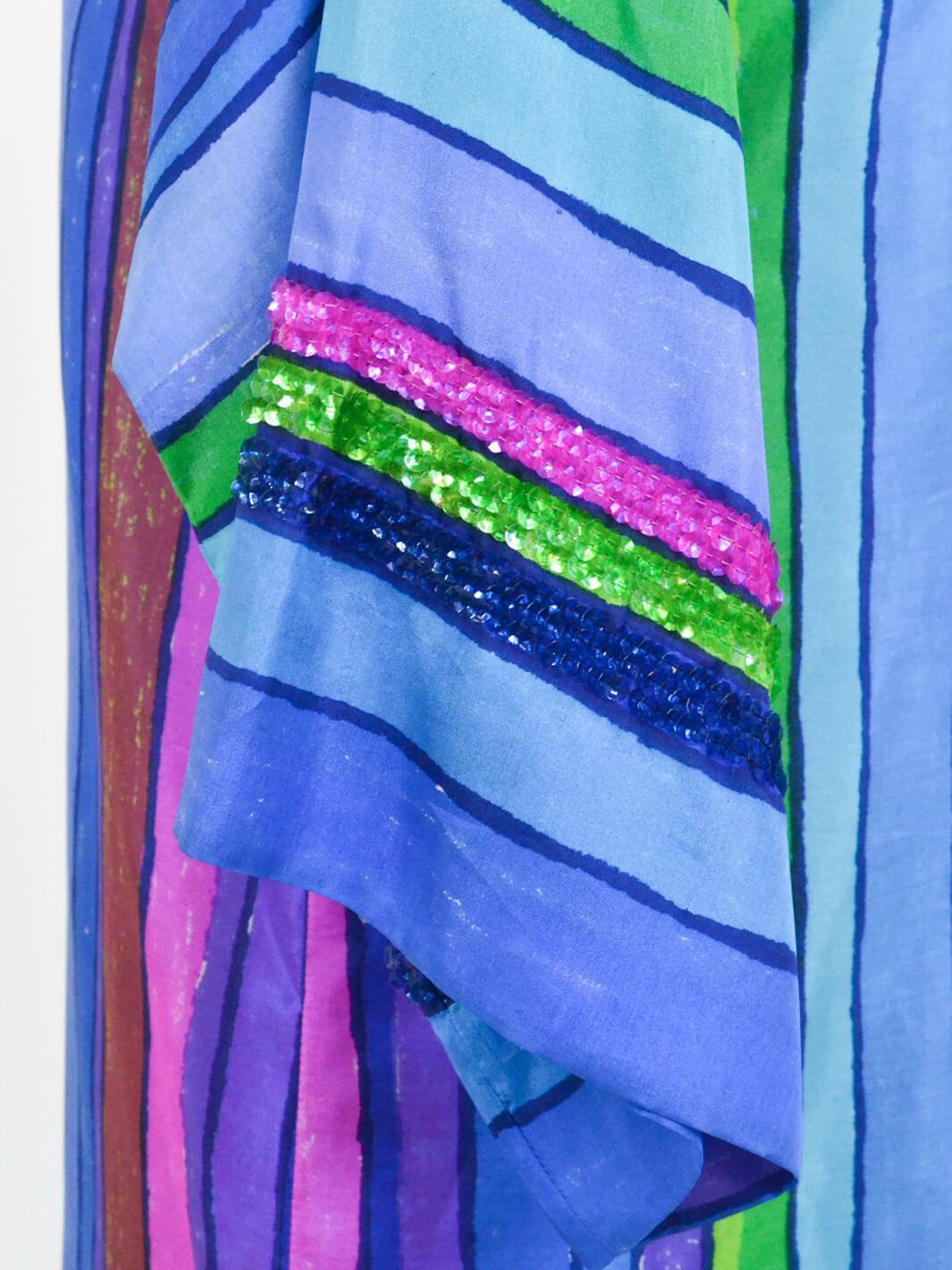 这件丝绸连衣裙采用多色条纹图案,袖子上有亮片装饰。