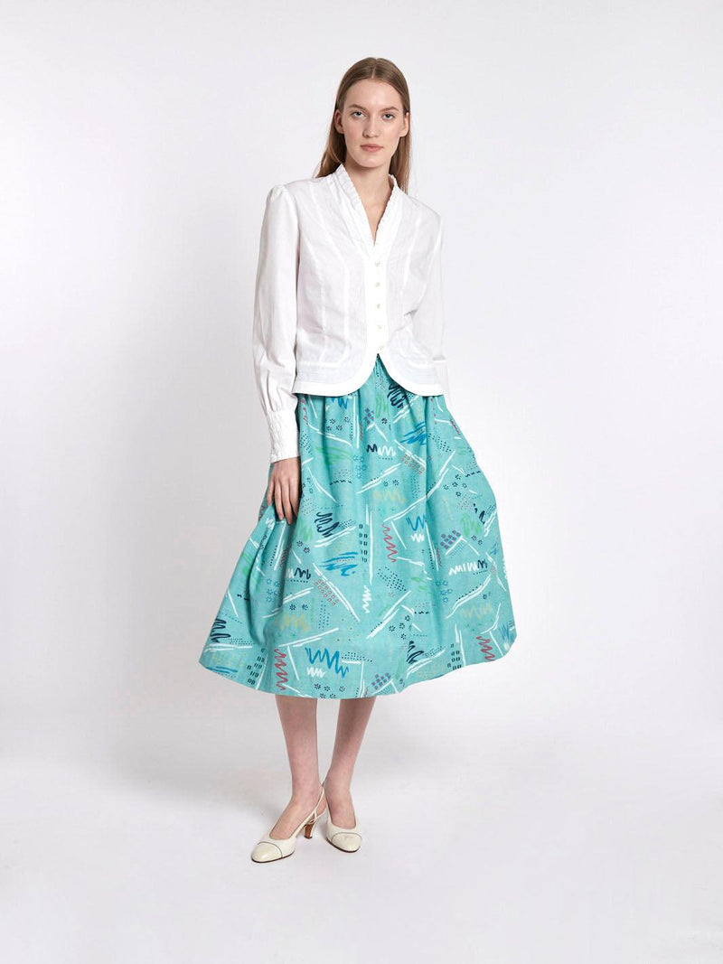 20 世纪 50 年代风格的蓝绿色棉质中长半身裙,带有抽象图案
