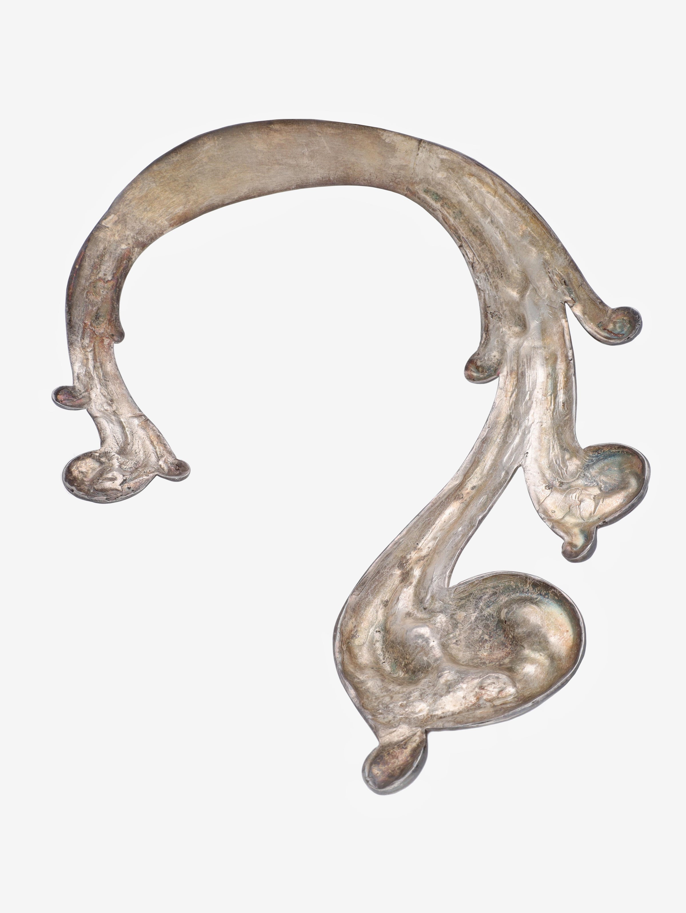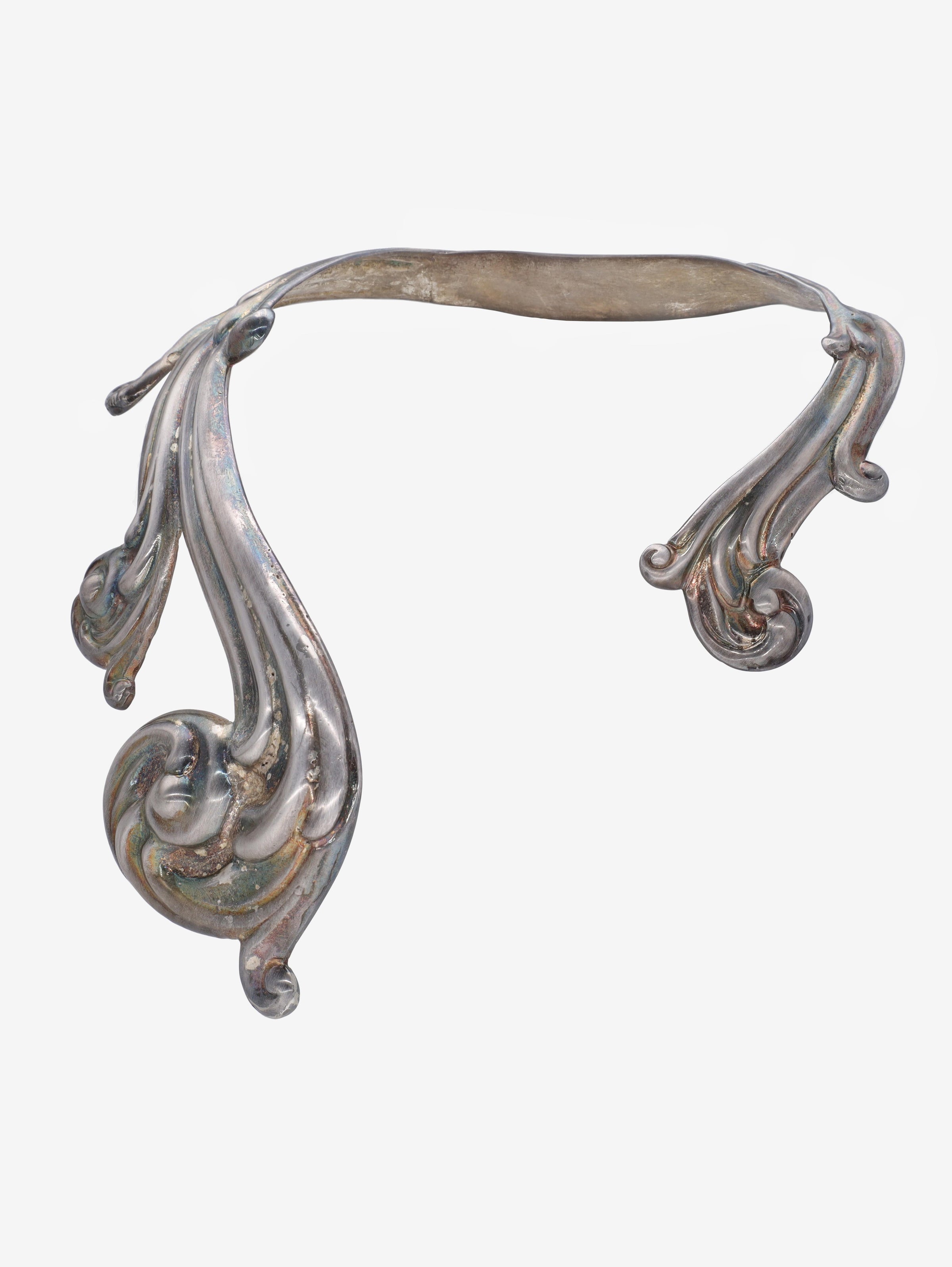 This is a unique piece from Cavalli e Nastri private Archive collection that, usually, is not for sale. Is a rigid necklace in shiny galvanised silver-plated brass characterised by embossed work with baroque-style curlicue shapes.