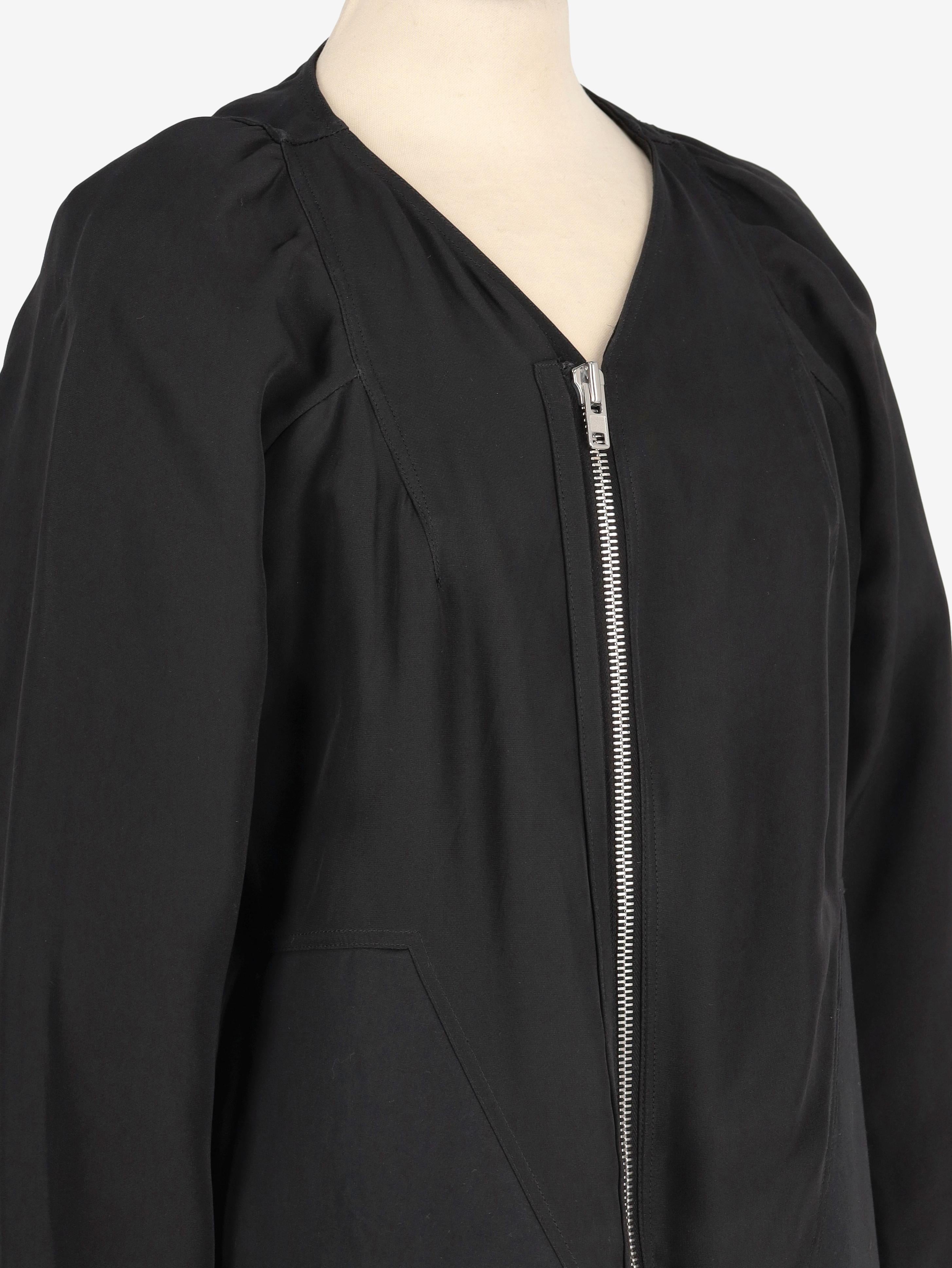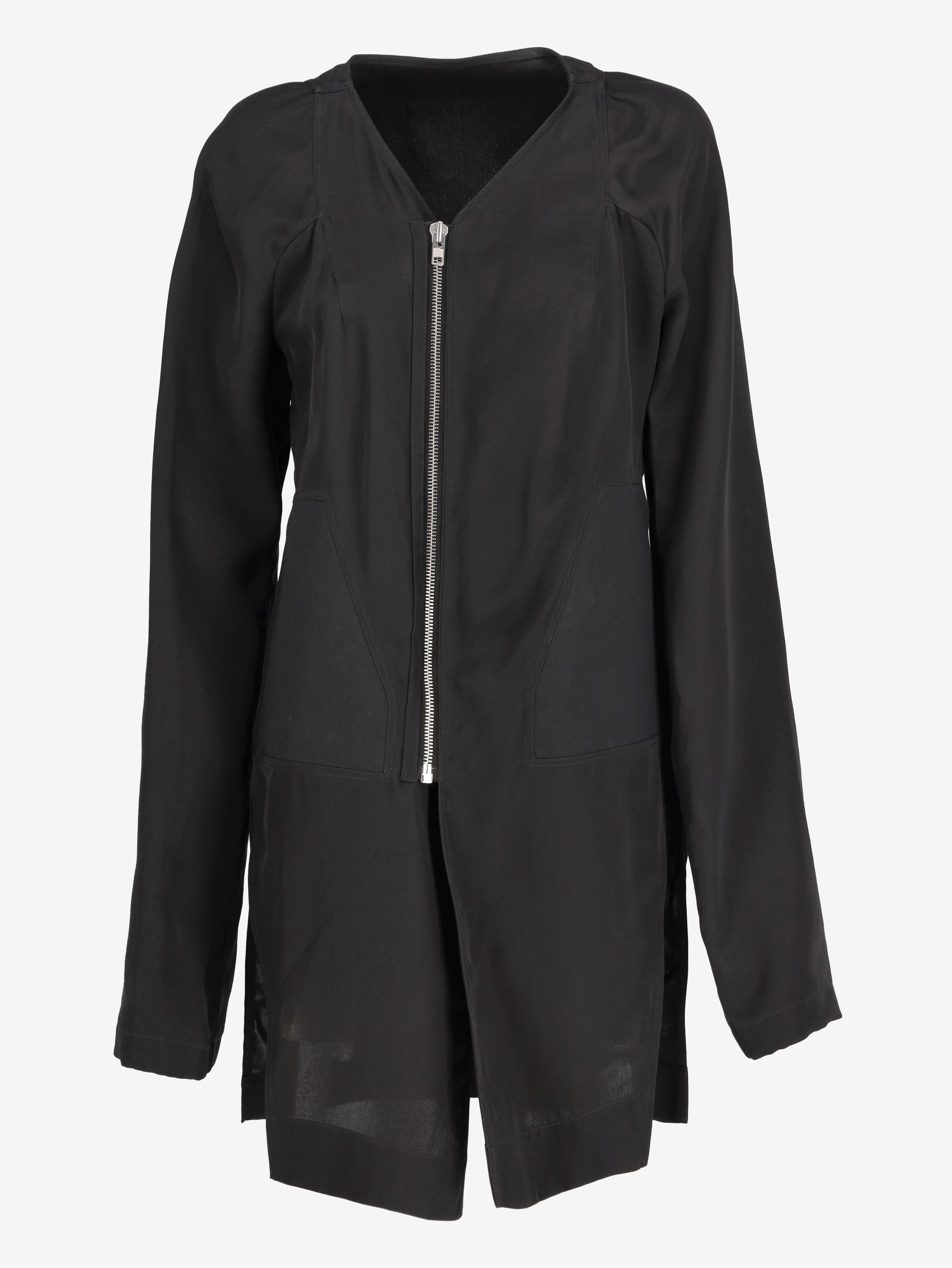 Rick Owens Runway Black Jacket. This mid-length jacket is crafted from a lightweight fabric and features long sleeves, a front zip closure, lateral pockets, and two side slits.