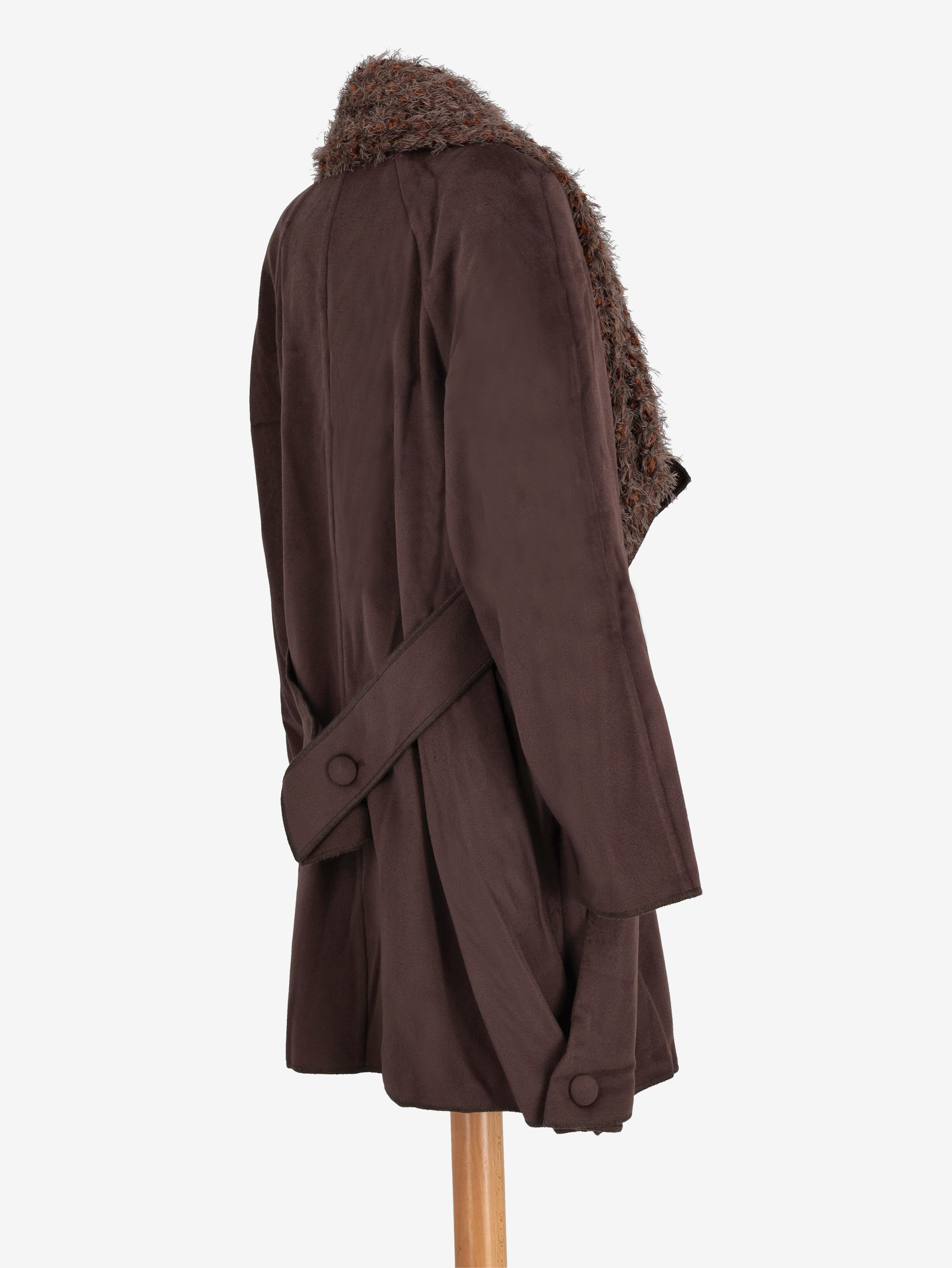 Fendi Brown Coat. This mid-length coat features long sleeves, a double-breasted front, a textured collar, and side pockets. Lateral buttons create a subtle skirt-like effect, while a stripe-detail belt extends from the underarms to the back.