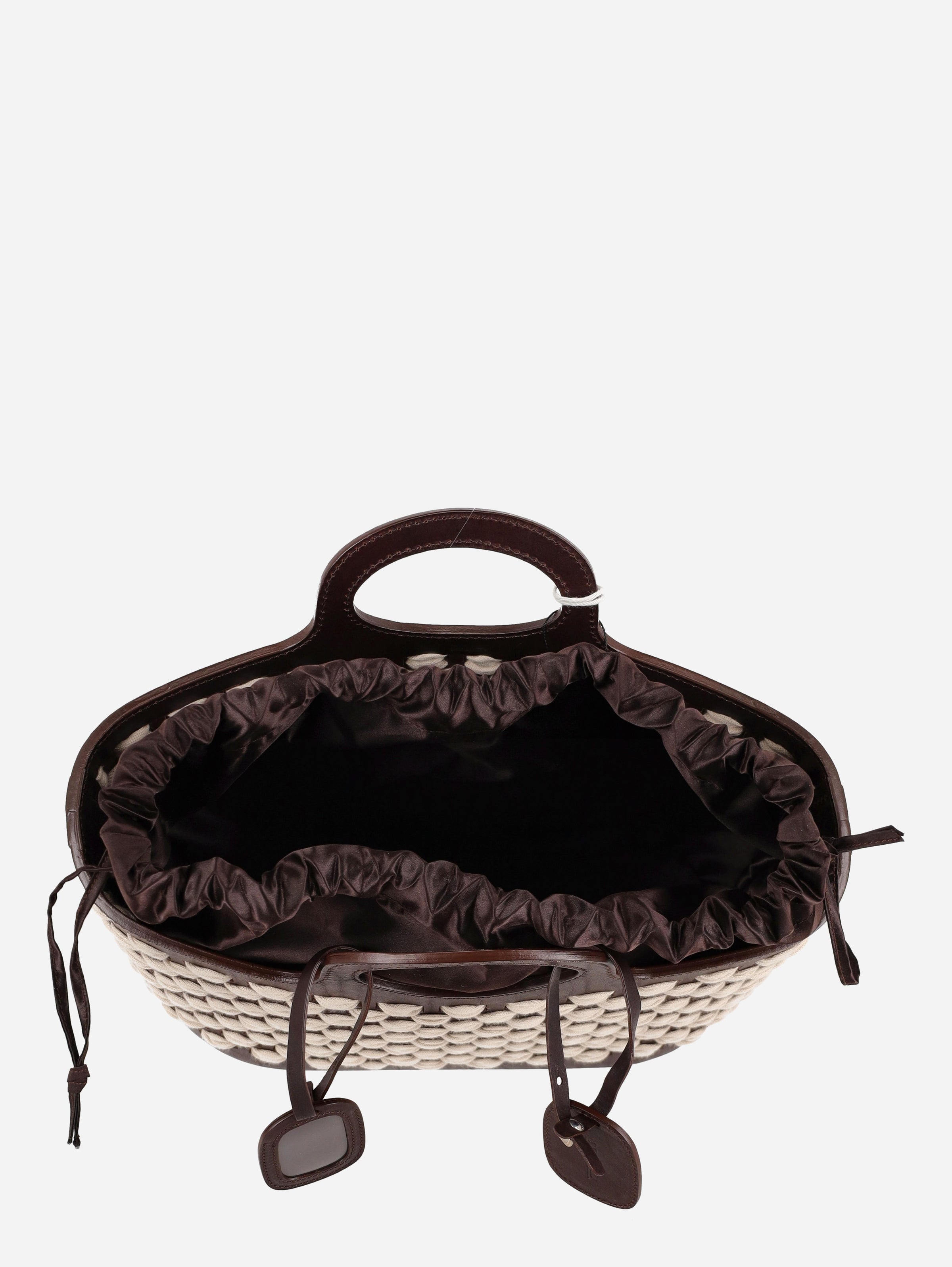 Malo Woven Handbag is a rigid bag in dark brown leather with contrasting woven fabric inserts. Basket model with removable fabric drawstring bag inside.